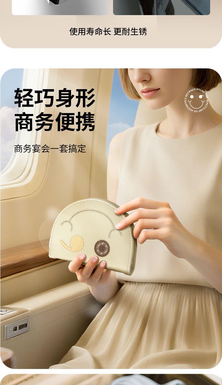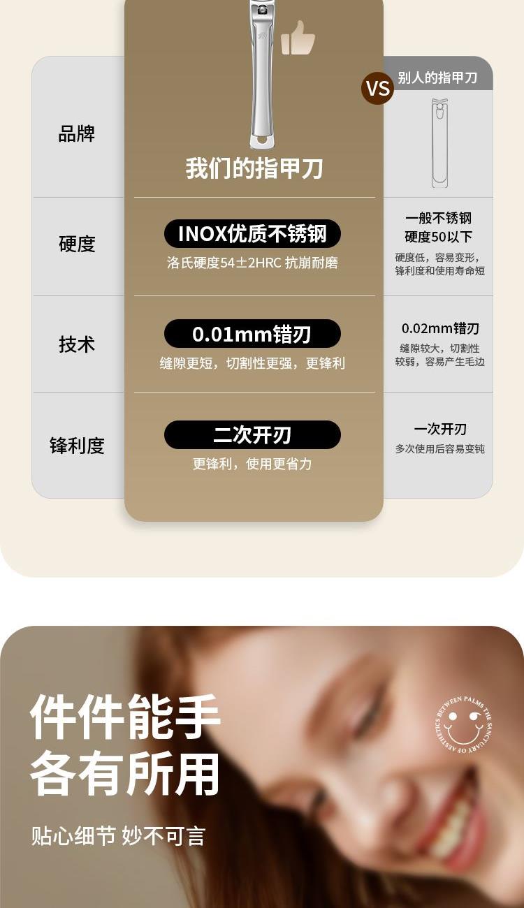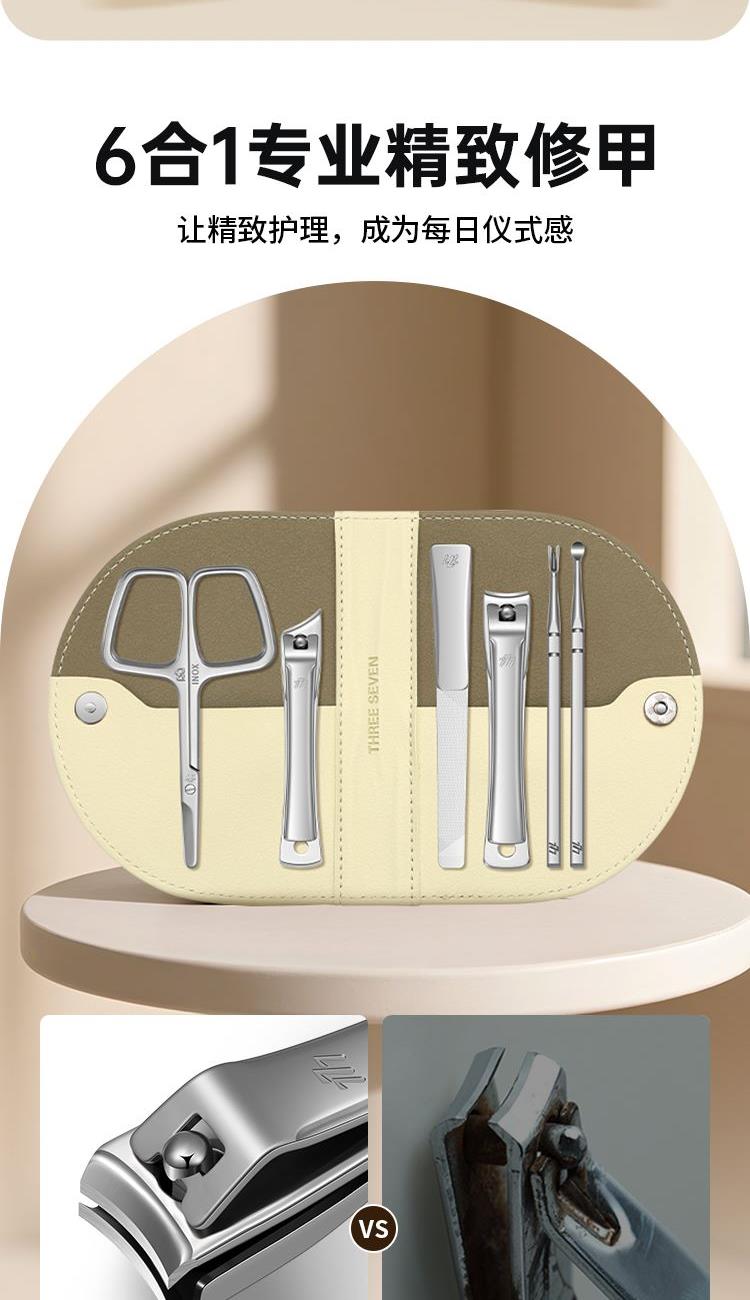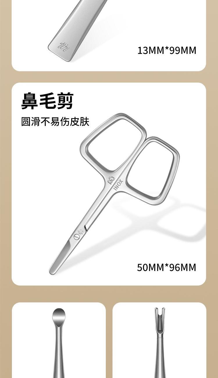 材质:优质不锈钢 规格:128*83*15mm 产品颜色:棕色 套装内容:6件套 产品配件:大号平口、中号斜口、安全剪、锉片、死皮铲、耳挖 产品卖点: 1)萌趣皮套,颜值在线:可爱造型皮套,精致又吸睛,把 “美学馆” 装进口袋,拿在手上尽显俏皮与时尚,为日常护理增添愉悦感。 2)6 件套装,全面呵护:包含多样美甲美护工具,从修剪到精细护理,一套搞定,满足指尖修护需求,让每一次护理都细致入微。 3)便携随行,时尚精致:小巧易携的设计,不管是出门在外还是居家使用,都能轻松拿出,守护指尖精致,绽放自信微笑。