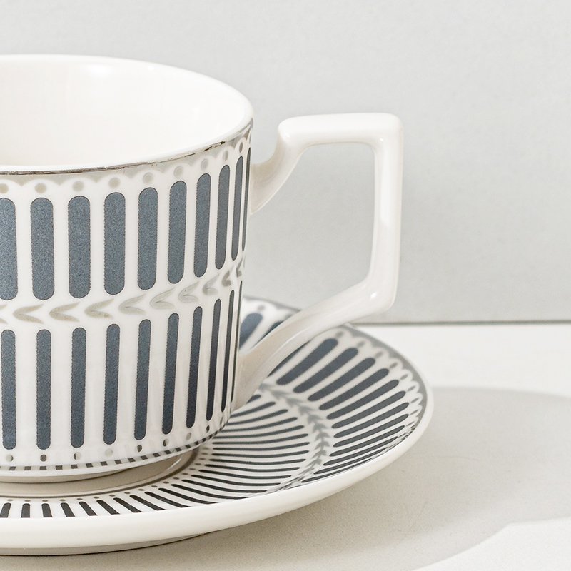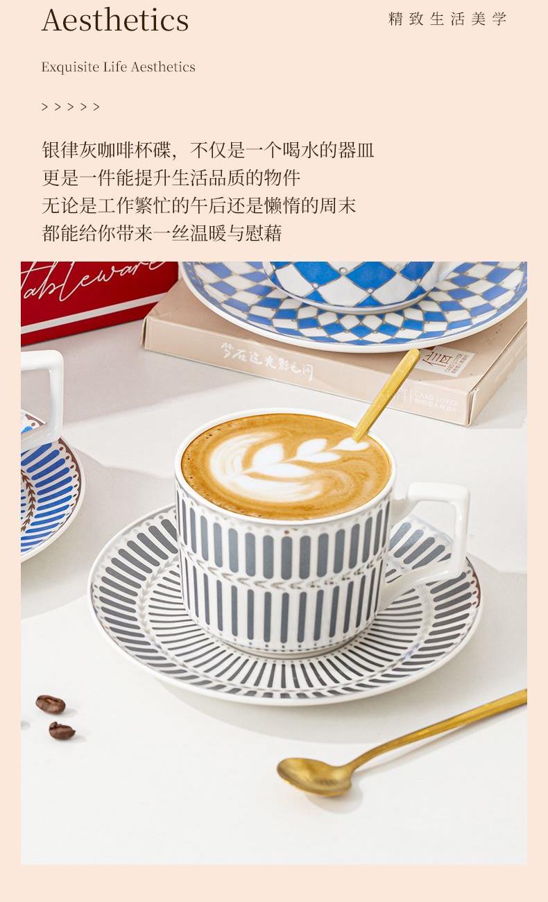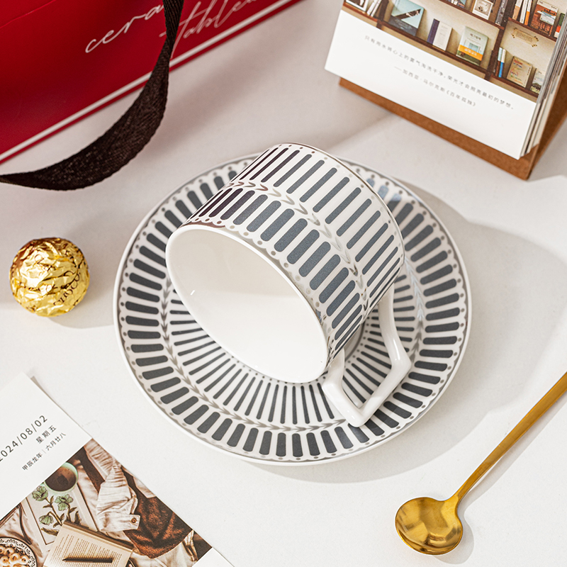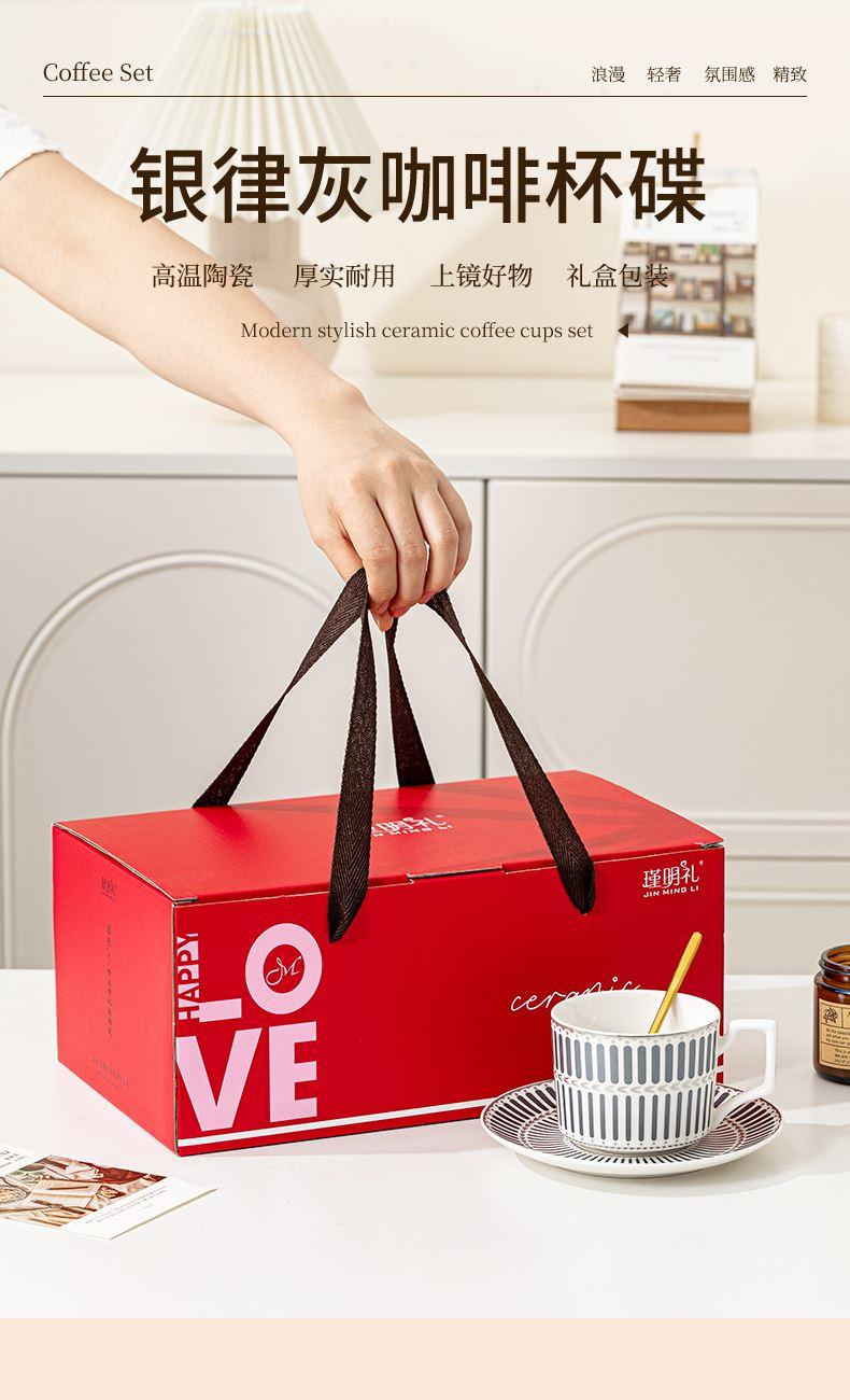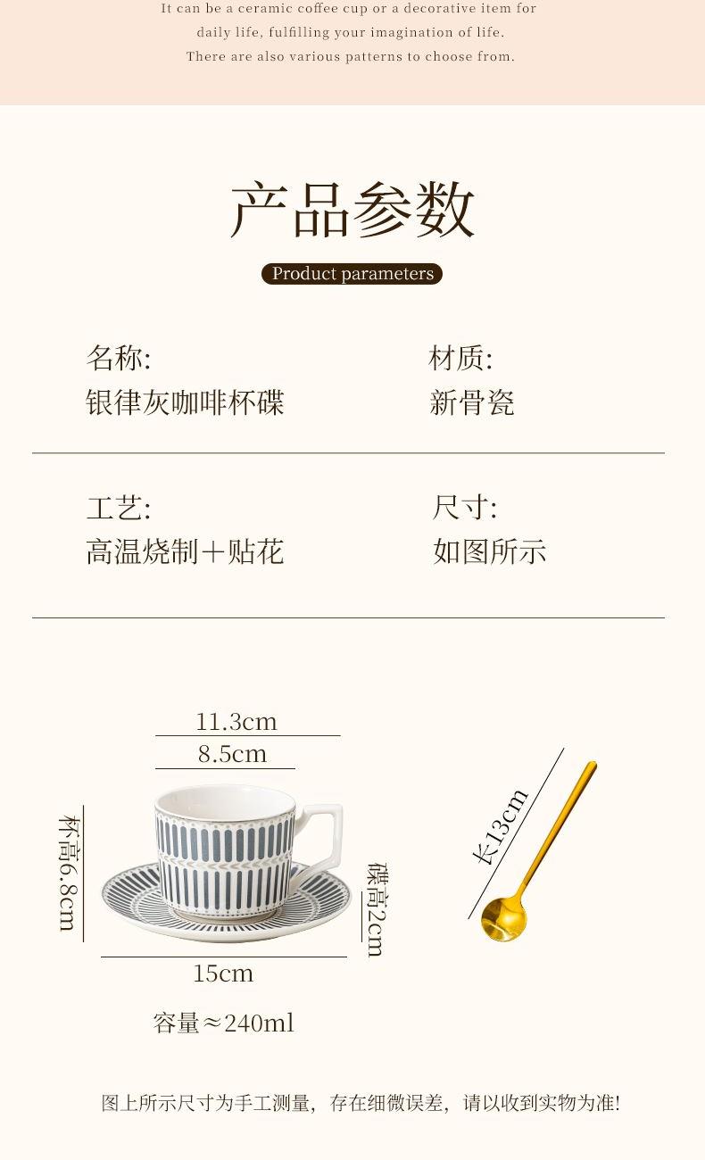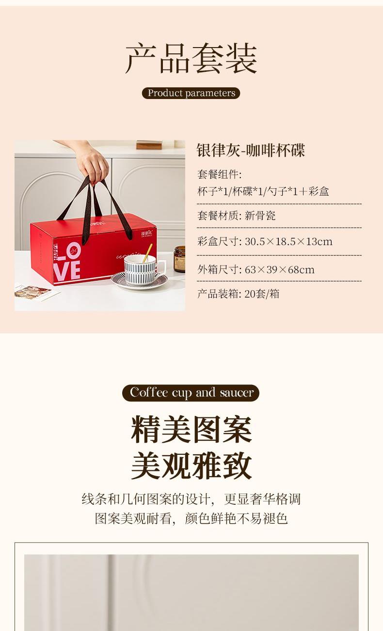 瑾明礼-银律灰-咖啡杯碟-1杯1碟1勺 - 产品组成:整套=1杯1碟1勺+彩盒 产品材质:新骨瓷 产品规格:咖啡杯=口径8.5cm,高度6.8cm,容量240ml;碟=直径15cm,高2cm;金勺=长度13cm; 彩盒尺寸:30.5*18.5*13cm 产品毛重:0.8kg 整箱毛重:18kg 外箱尺寸:63*39*68cm - 线条和几何形状的设计往往带有一种抽象艺术的风格,能够满足消费者对于时尚和艺术的追求。这种设计不仅适合现代家居环境,还能成为时尚人士展示个性的单品。