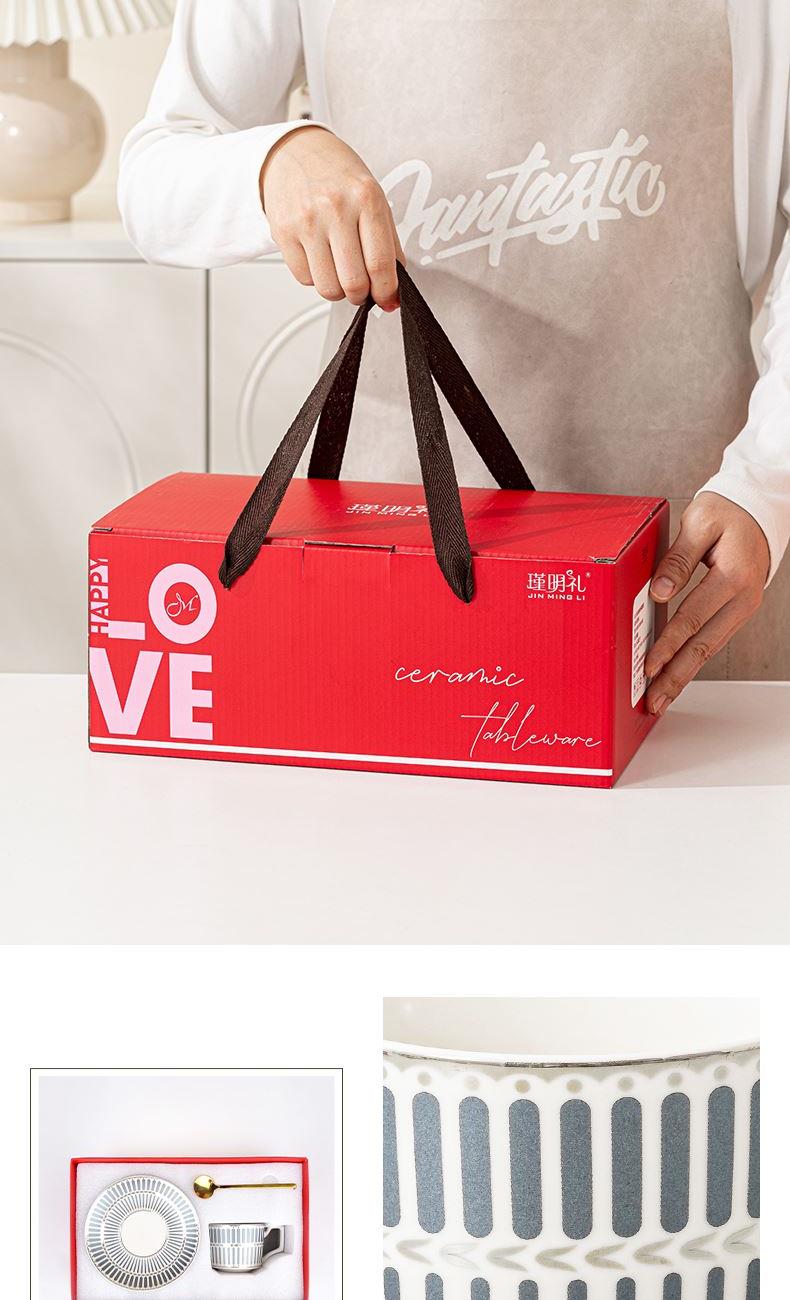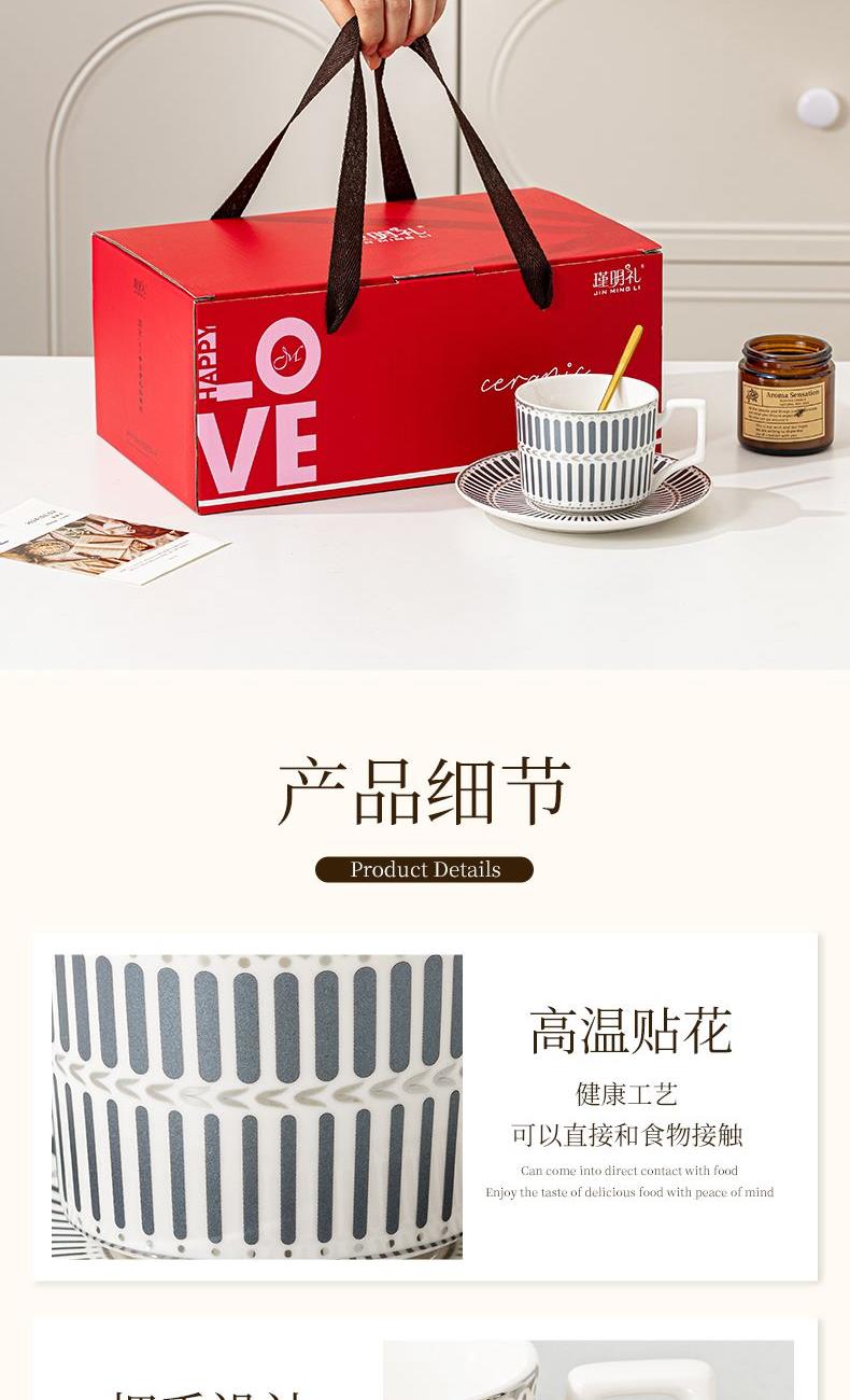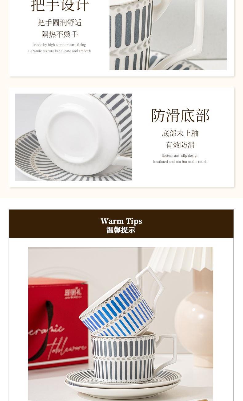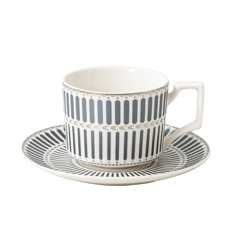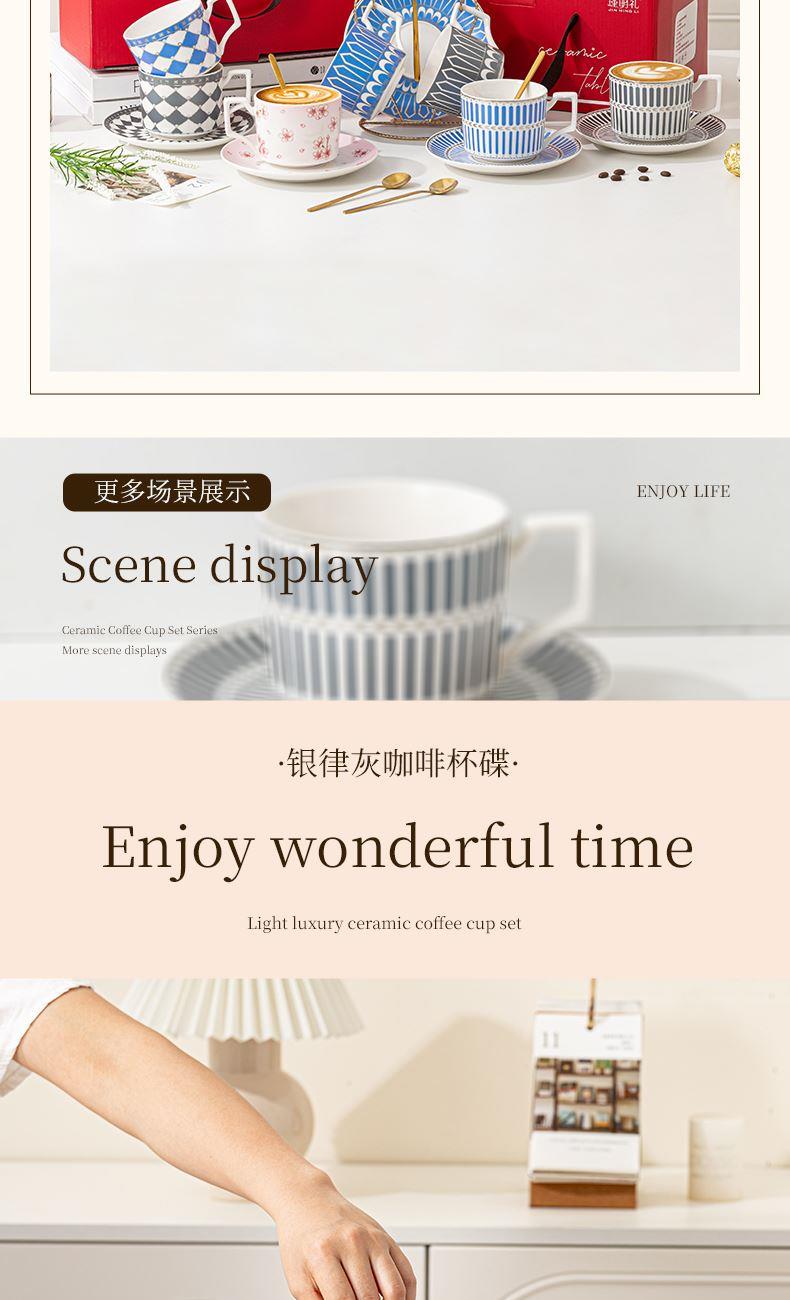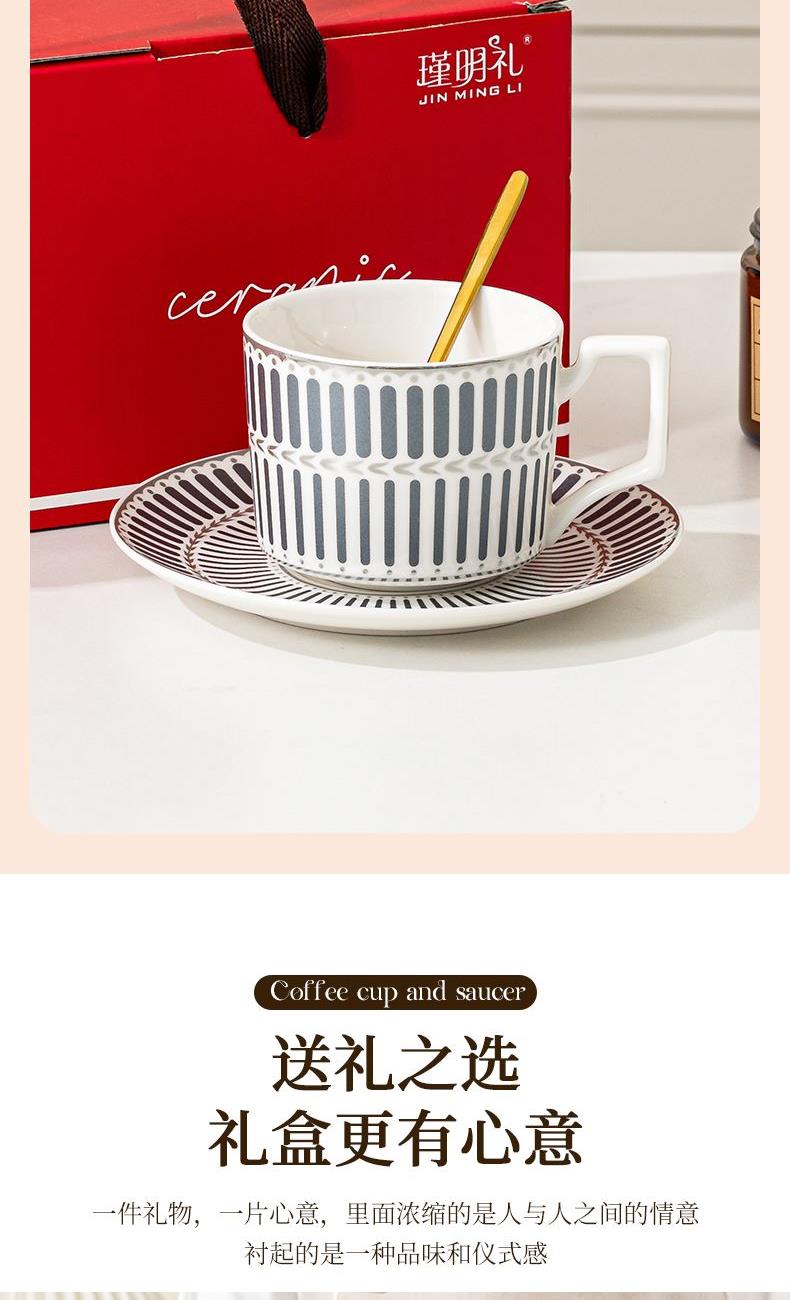 瑾明礼-银律灰-咖啡杯碟-1杯1碟1勺 - 产品组成:整套=1杯1碟1勺+彩盒 产品材质:新骨瓷 产品规格:咖啡杯=口径8.5cm,高度6.8cm,容量240ml;碟=直径15cm,高2cm;金勺=长度13cm; 彩盒尺寸:30.5*18.5*13cm 产品毛重:0.8kg 整箱毛重:18kg 外箱尺寸:63*39*68cm - 线条和几何形状的设计往往带有一种抽象艺术的风格,能够满足消费者对于时尚和艺术的追求。这种设计不仅适合现代家居环境,还能成为时尚人士展示个性的单品。
