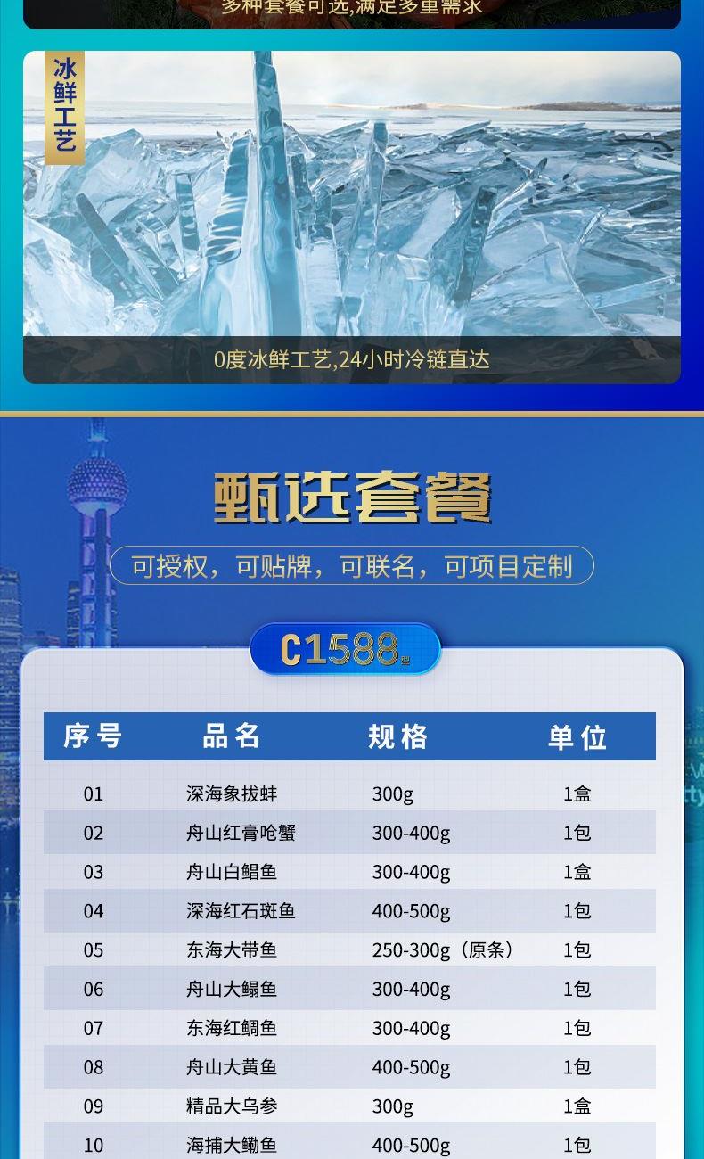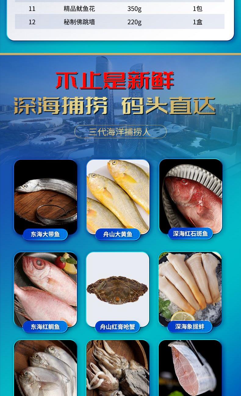 产品参数配置​ 深海象拔蚌:300g,共 2 盒​ 舟山红膏呛蟹:300-400g,共 2 包​ 舟山白鲳鱼:300-400g,共 2 盒​ 深海红石斑鱼:400-500g,共 2 包​ 东海大带鱼:250-300g(原条),共 2 包​ 舟山大鳎鱼:300-400g,共 2 包​ 东海红鲷鱼:300-400g,共 2 包​ 舟山大黄鱼:400-500g,共 2 包​ 精品大乌参:300g,共 2 盒​ 海捕大鳓鱼:400-500g,共 2 包​ 精品鱿鱼花:350g,共 2 包​ 秘制石斑鱼:300-400g,共 2 盒​ 产品卖点说明​ 汇聚多种海味,深海象拔蚌的加入尽显食材独特性,搭配各类海捕鱼类与特色水产,勾勒出一幅丰盛的海味图谱。​ 涵盖不同海域特色食材,自带海洋深处的纯净风味。 从适合精致摆盘的食材到适合家常烹制的经典品类,满足多元饮食需求。