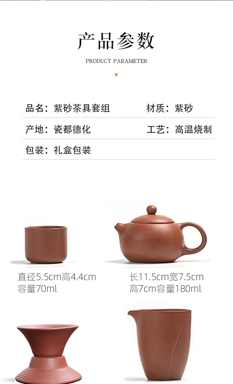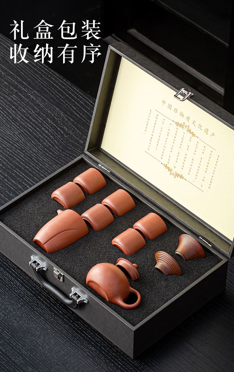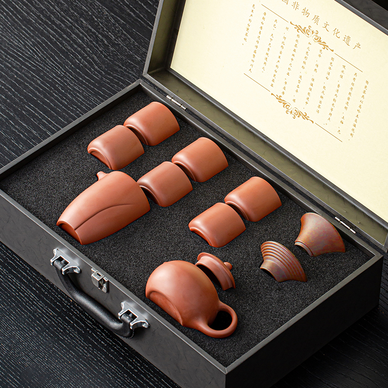 【产品配置】 茶壶*1 茶海*1 茶漏组*1 茶杯*6 礼盒*1 【产品说明】 采用天然紫砂泥料,温润有质感,兼具透气性; 壶嘴出水顺畅、断水利落; 防烫壶把拿捏舒适,底部打磨平整确保稳固; 茶漏组、茶海等配件设计简化冲泡流程,适合功夫茶仪式; 高温烧制,工艺精湛,确保茶具耐用且稳定性强。
