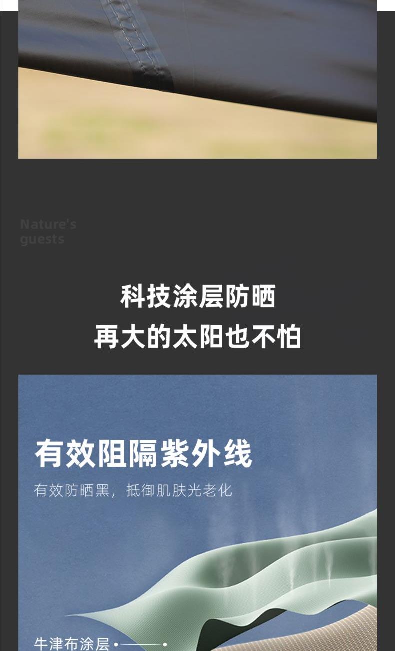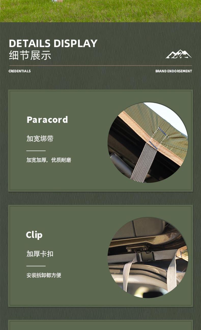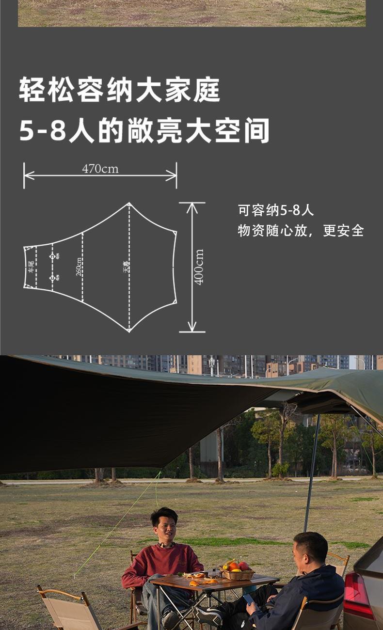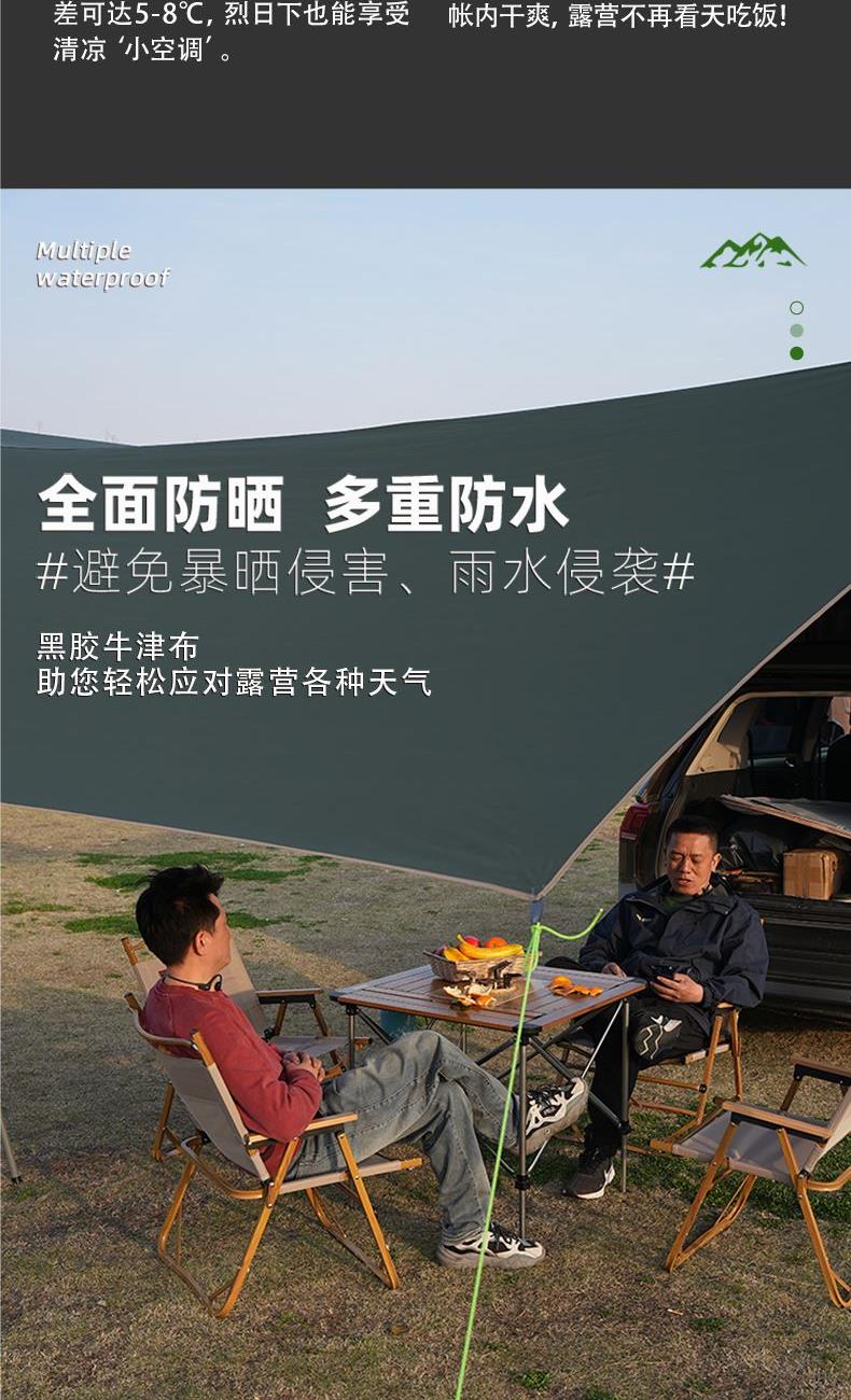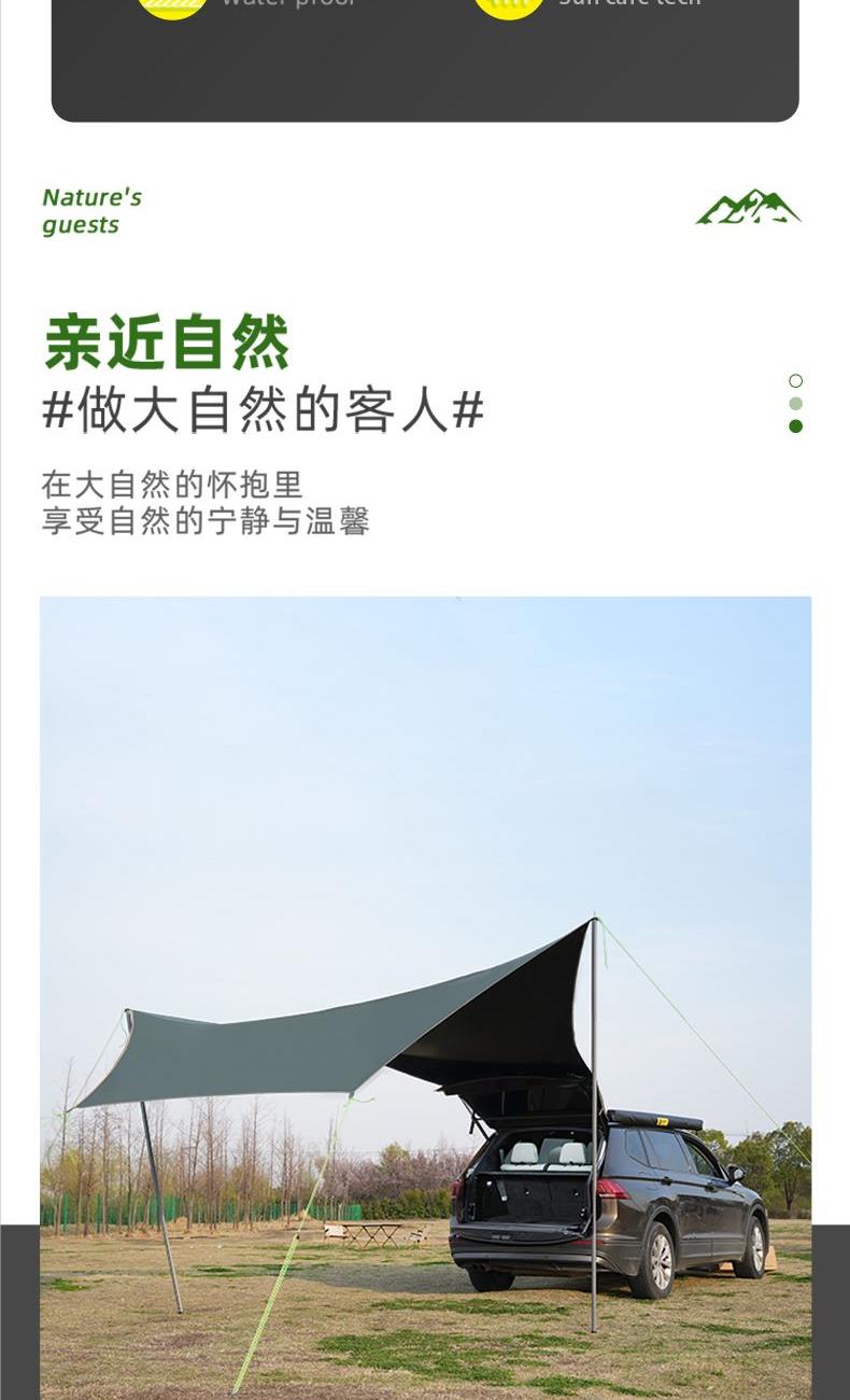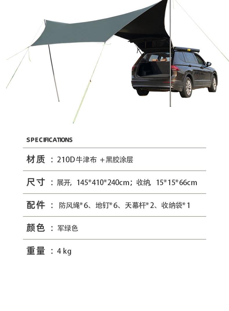 材质 210D牛津布 涂黑胶 颜色 墨绿 尺寸 展开 145*410*240cm 收纳 15*15*66cm 重量 3.05kg 配件 防风绳*4、地钉*4、天幕杆*2、收纳袋*1 快装快收,不限车型 超大这样面积,有效阻挡紫外线,无惧晒黑 宽敞视野 旅途景观 多种搭建形态,根据阳光照射角度调整,增加露营舒适度 防雨拒水效果出众