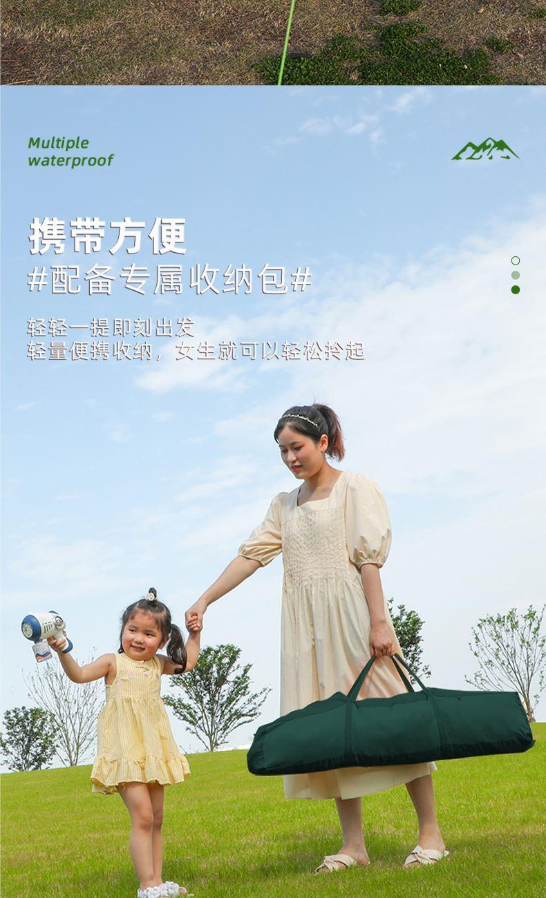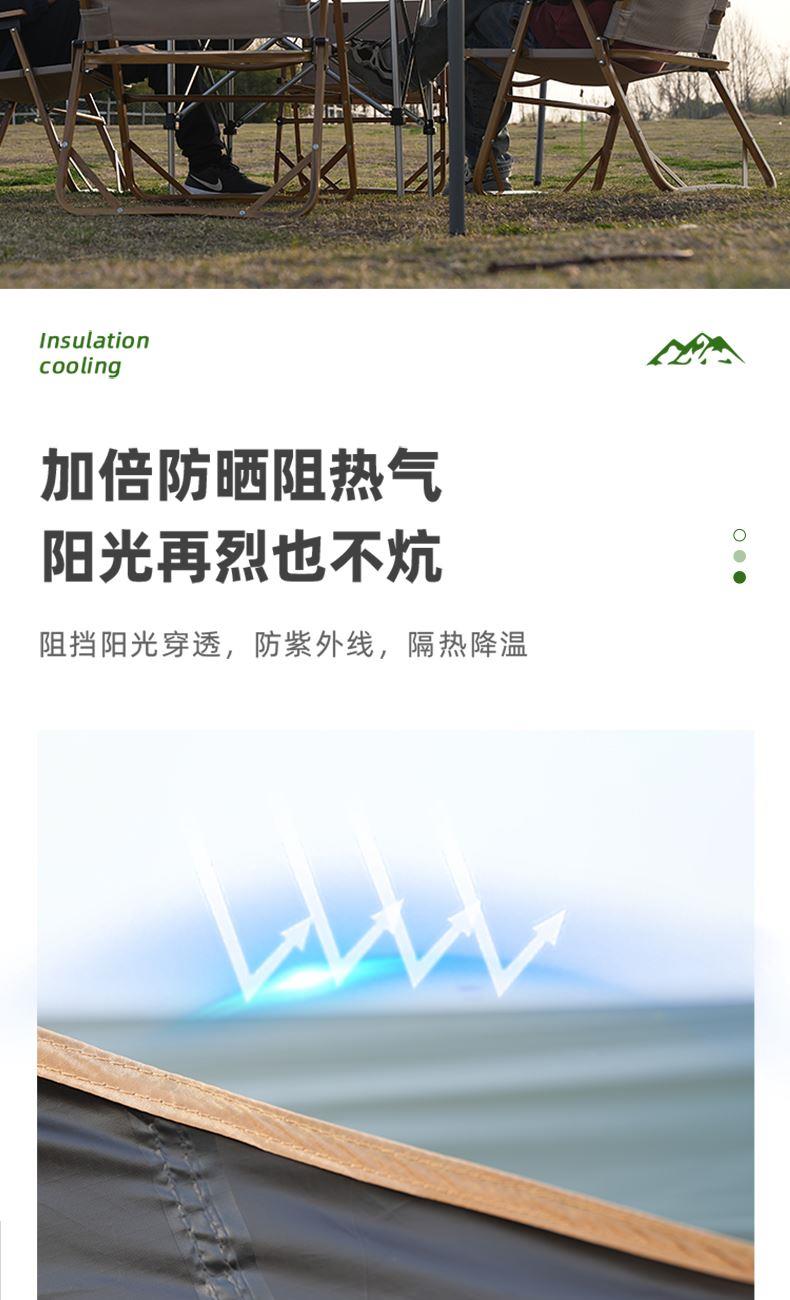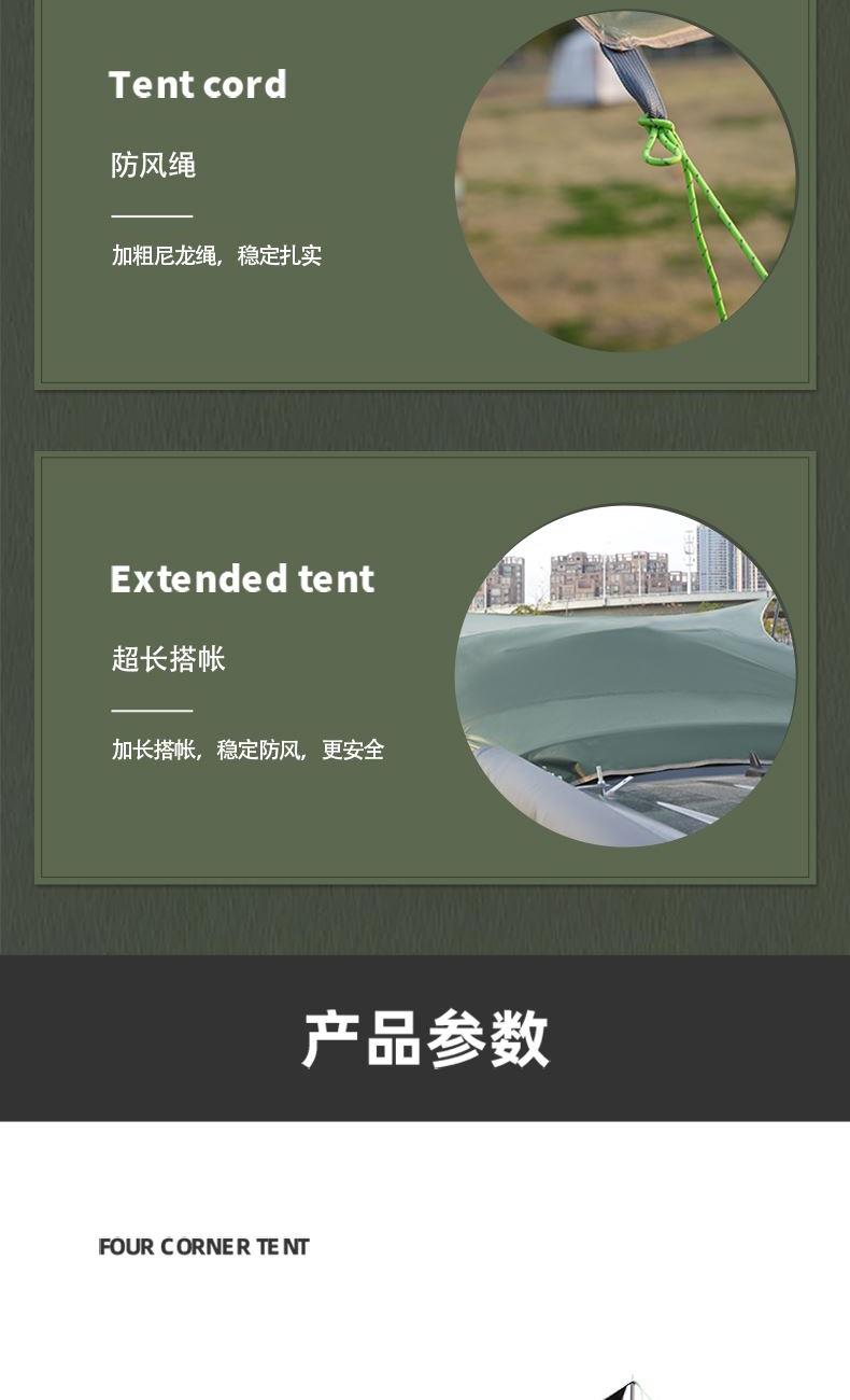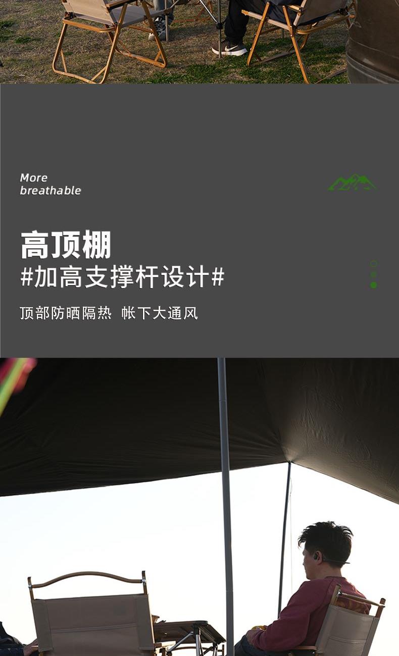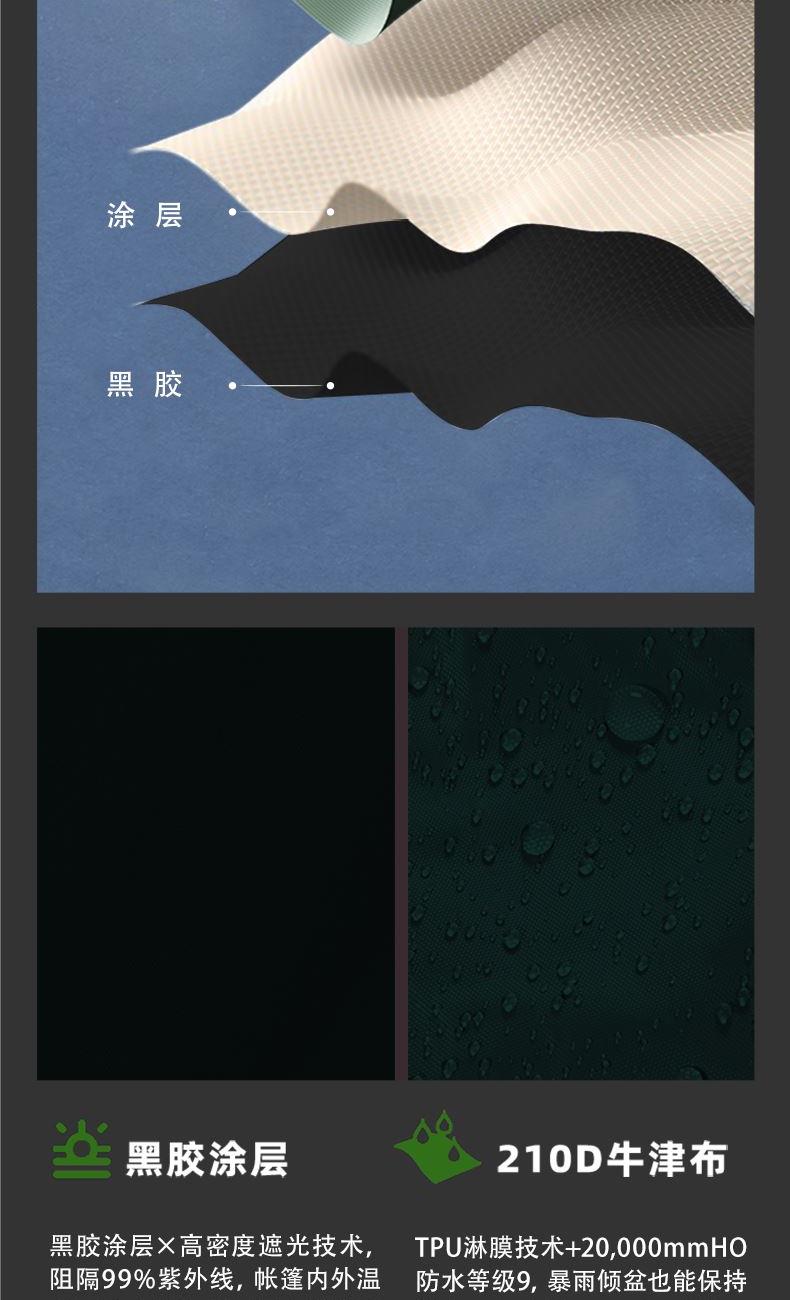 材质 210D牛津布 涂黑胶 颜色 墨绿 尺寸 展开 145*410*240cm 收纳 15*15*66cm 重量 3.05kg 配件 防风绳*4、地钉*4、天幕杆*2、收纳袋*1 快装快收,不限车型 超大这样面积,有效阻挡紫外线,无惧晒黑 宽敞视野 旅途景观 多种搭建形态,根据阳光照射角度调整,增加露营舒适度 防雨拒水效果出众