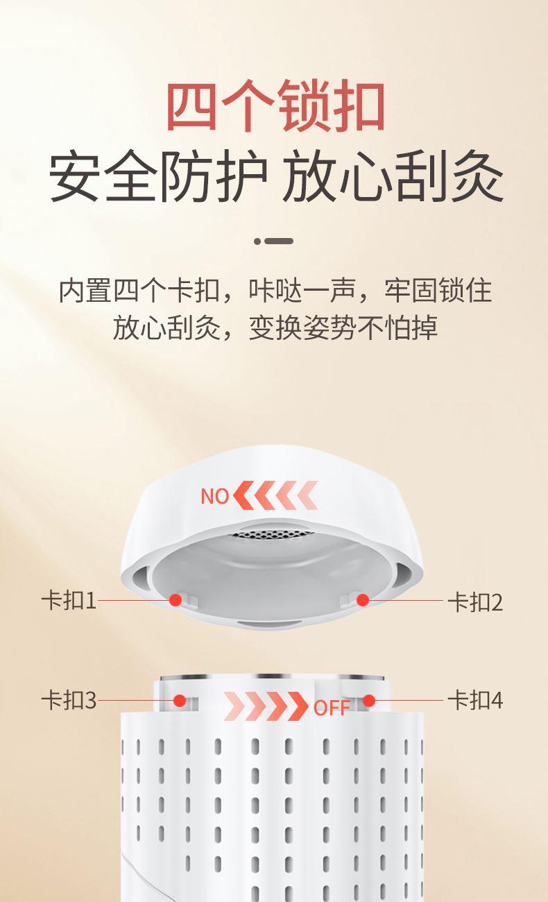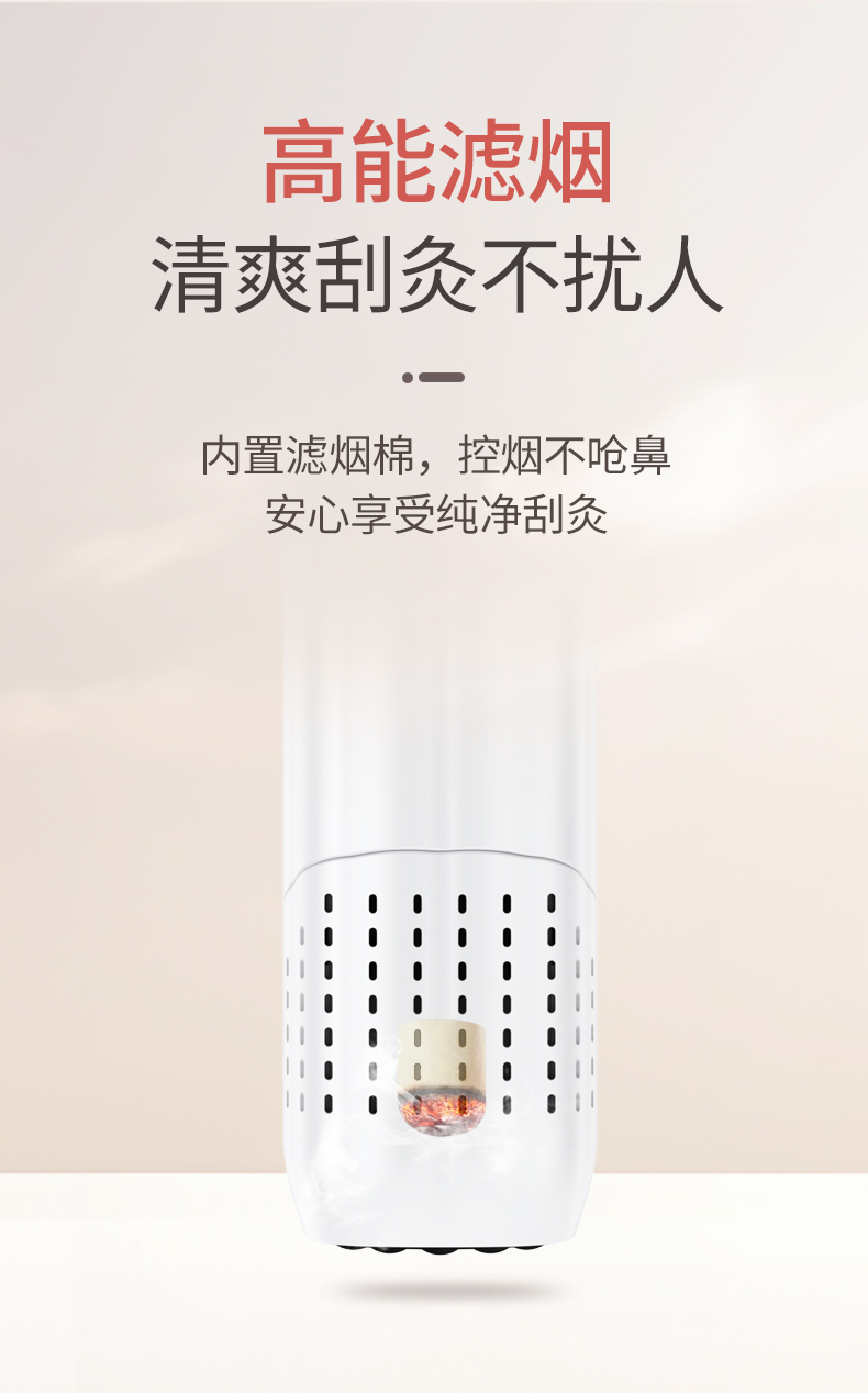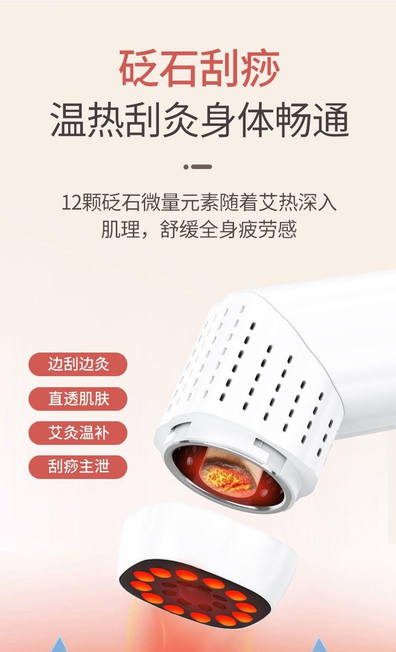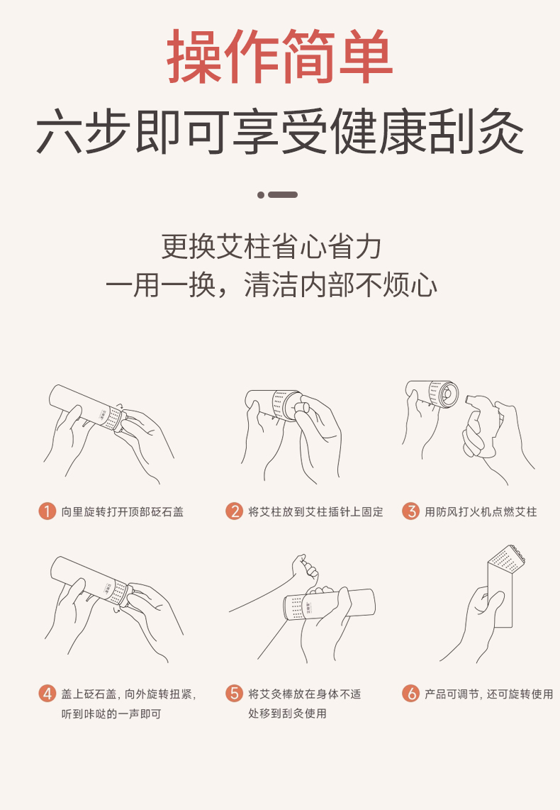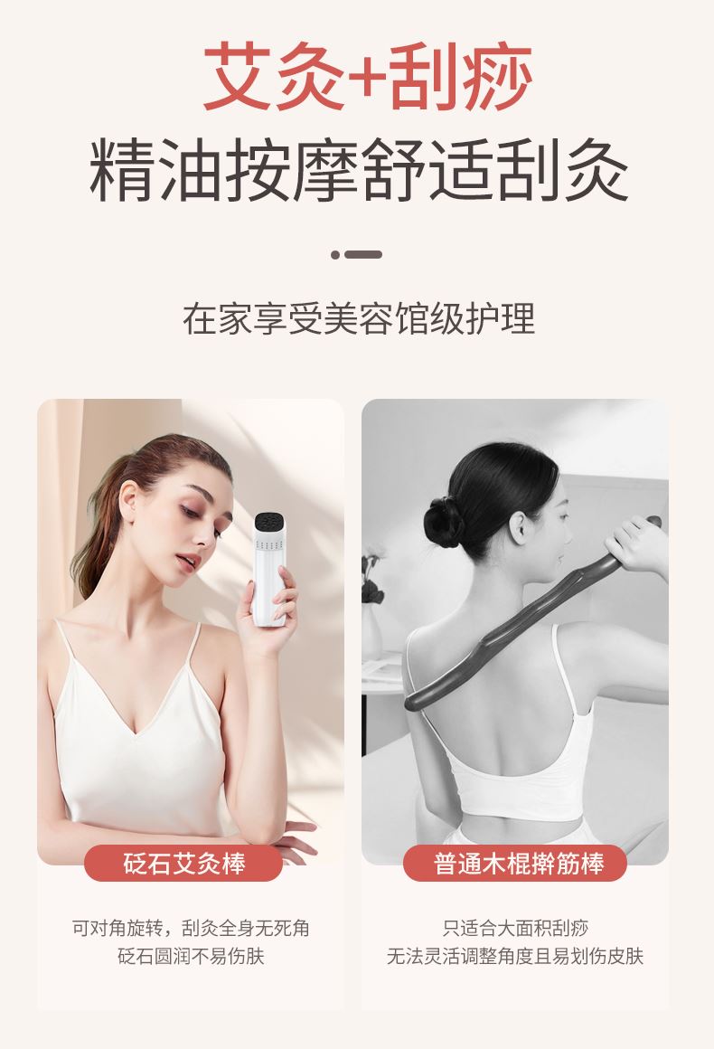 双效合一: 刮痧泄湿排毒,艾灸补阳养元,一机搞定祛湿驱寒、疏通淤堵 便捷高效: 单手可持,对角旋转防烫;砭石平头圆头随心换,应对不同部位需求 品质保障: 三年陈艾绒渗透力强,滤烟防烫;砭石刮痧出痧快,艾灸温养稳 适用人群: 家务劳损、久坐腰酸、体寒怕冷、熬夜气色差人群必备,自用送礼皆宜