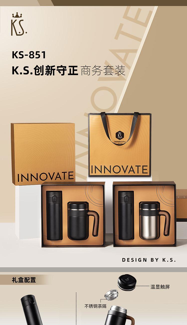 •材质:1.保温杯:杯体/304不锈钢。外盖、饮口/聚丙烯(PP) 2.温显办公杯 :杯身/316不锈钢(内胆) 304不锈钢(外壳、茶隔)上盖/聚丙烯(PP)+304不锈钢+温感传感器 •规格: 保温杯:380ML 温显办公杯 :480ML •包装:礼盒(配礼袋) 商务经典礼盒套装,以金色和黑色为配色主调,凸显其轻奢高雅、商务端庄的产品属性。是作为商务往来伴手礼、周年庆典、会议、节日慰问、活动营销礼的佳选礼品。 套盒配有316不锈钢温显把手杯一个、304不锈钢商务保温杯一只。做工精致、品质上乘,时尚简约。 礼盒、礼袋、内容物件上均可实现中小批量成品订制,全套订制方案输出,为企业宣传添砖助力。