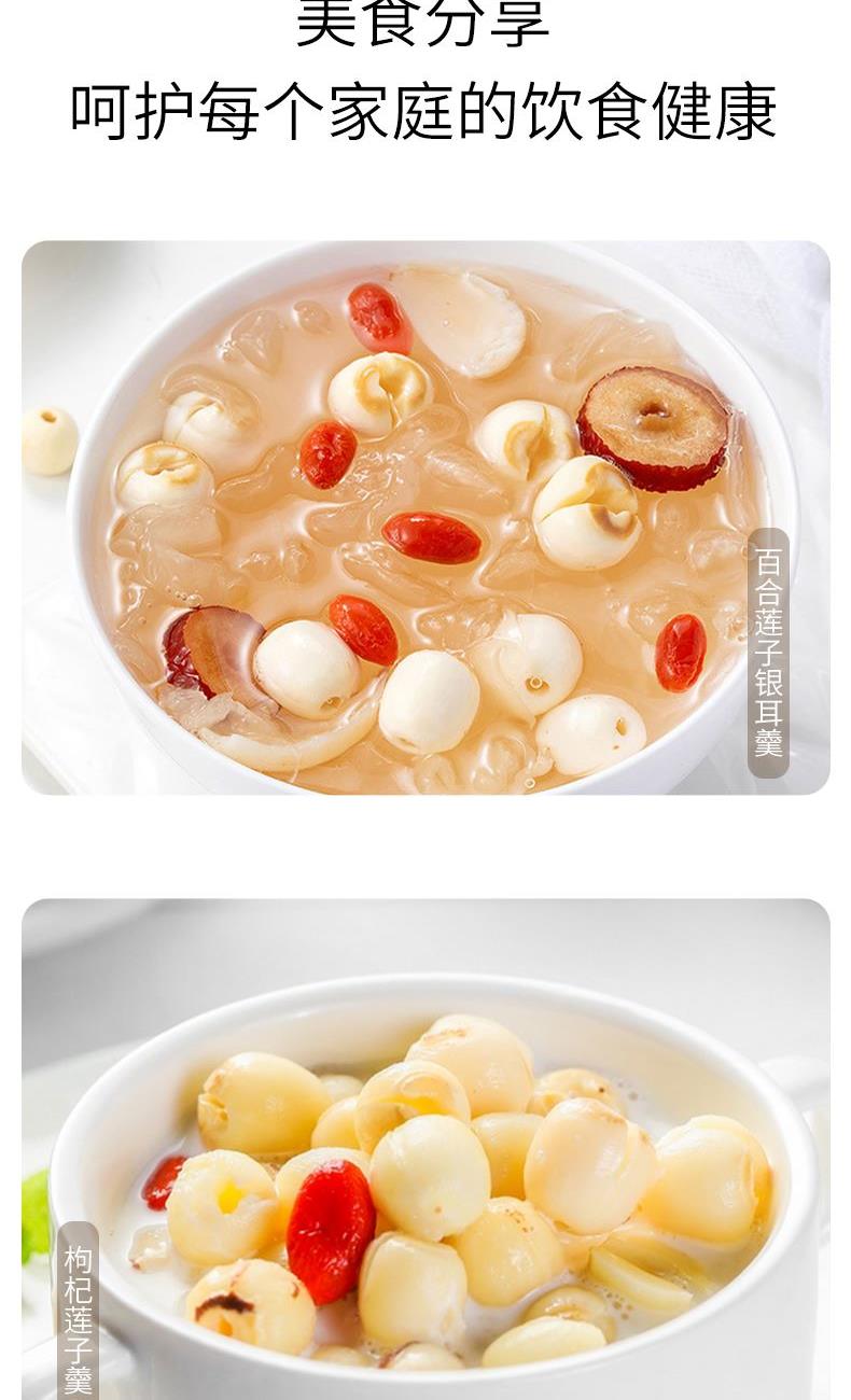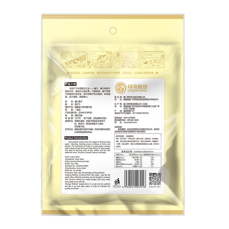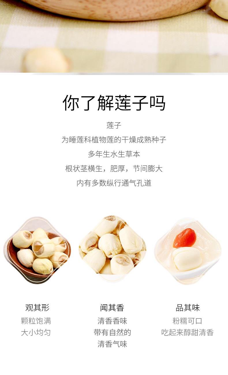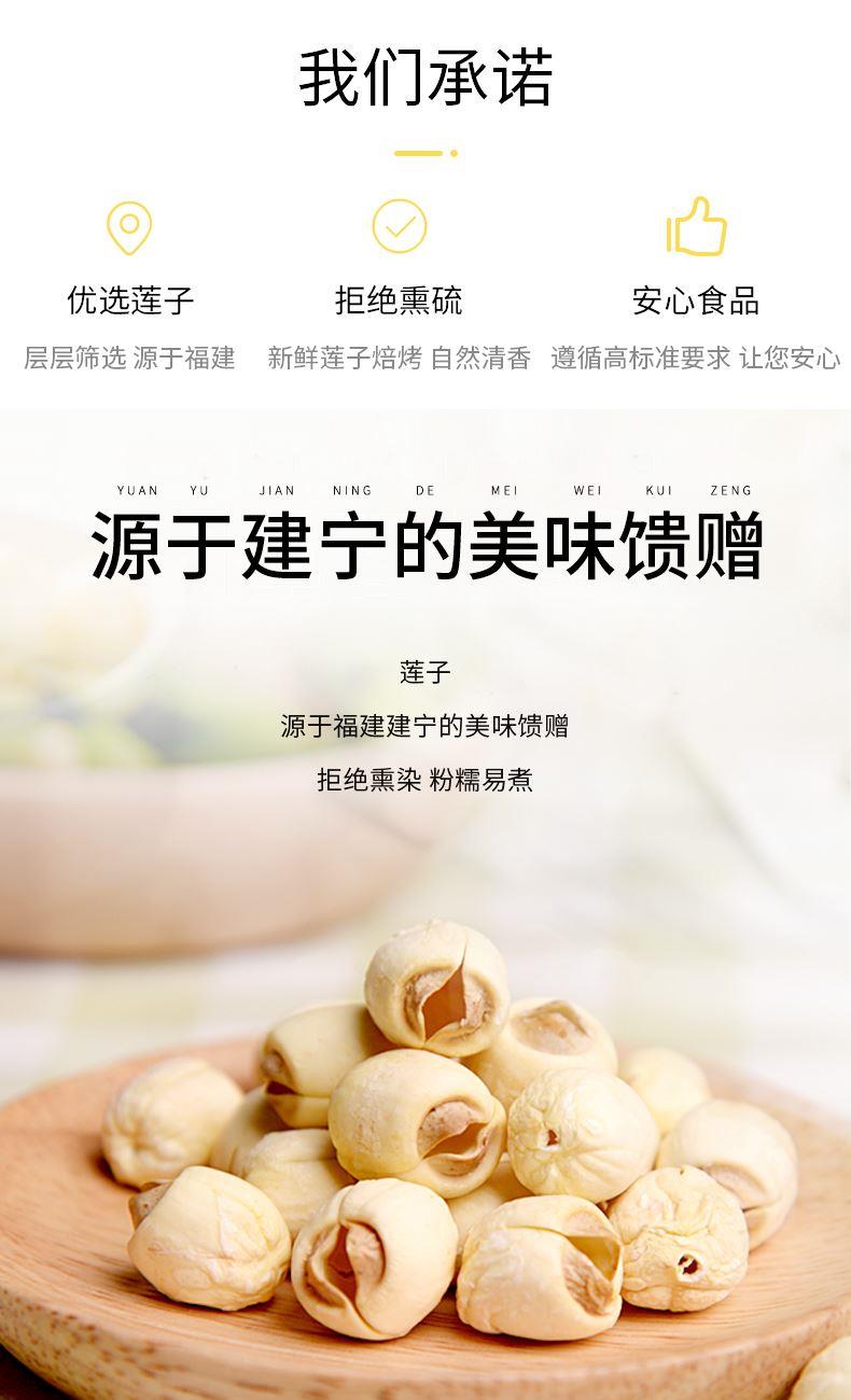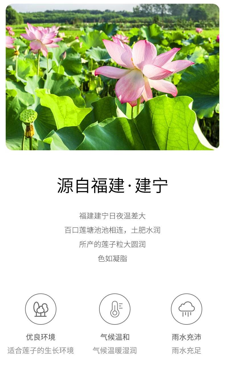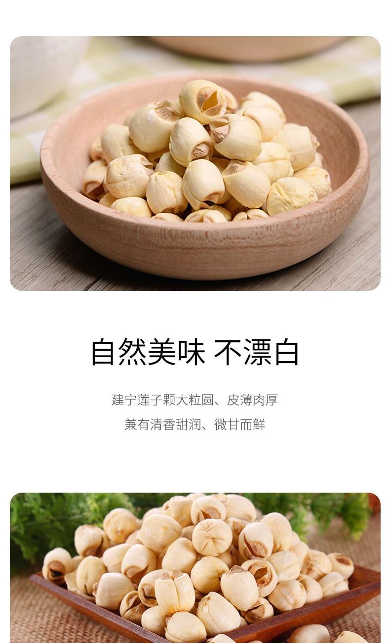 配料:莲子干 原料产地:福建省三明市建宁县 净含量:250克 保质期:12个月 生产日期:见包装物打印处 食用方法:用清水浸泡,待莲子回软后洗净沥干,炖、煲均可,常见的有莲子八宝粥、百合莲子汤。 本品产于莲子之乡-建宁,建宁的莲子驰名之外。闽西北山清水秀,气候独特,盛产的莲子有着悠久的历史。建宁的莲子粒大圆润,色如凝脂,汤汁清甜,香醇爽口。