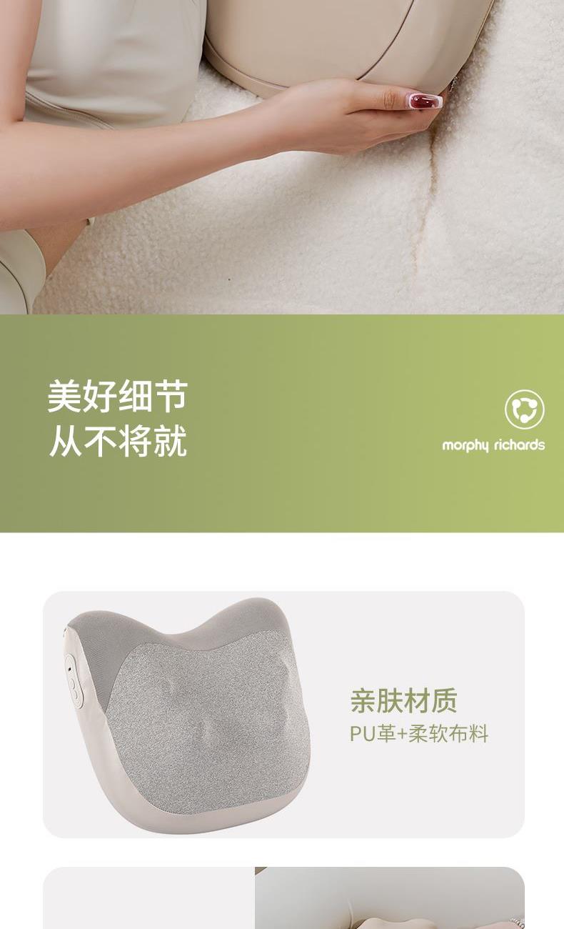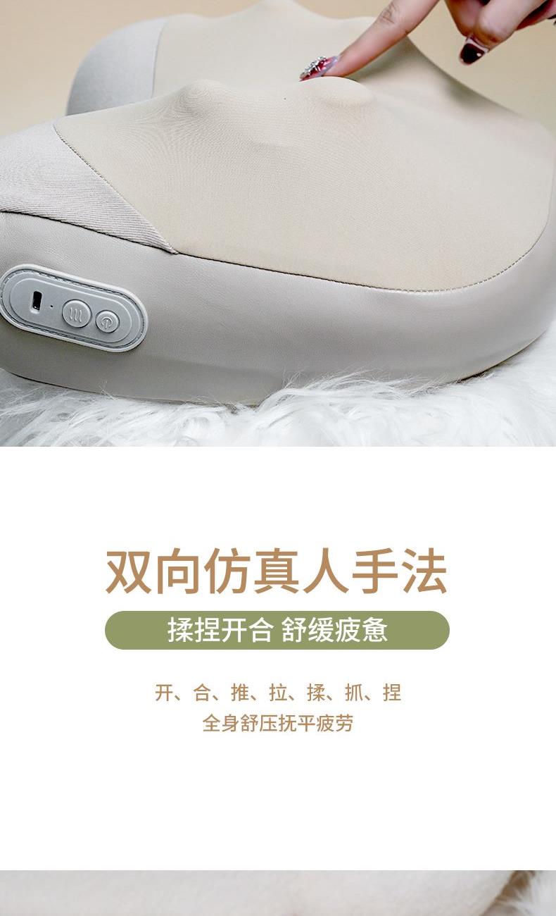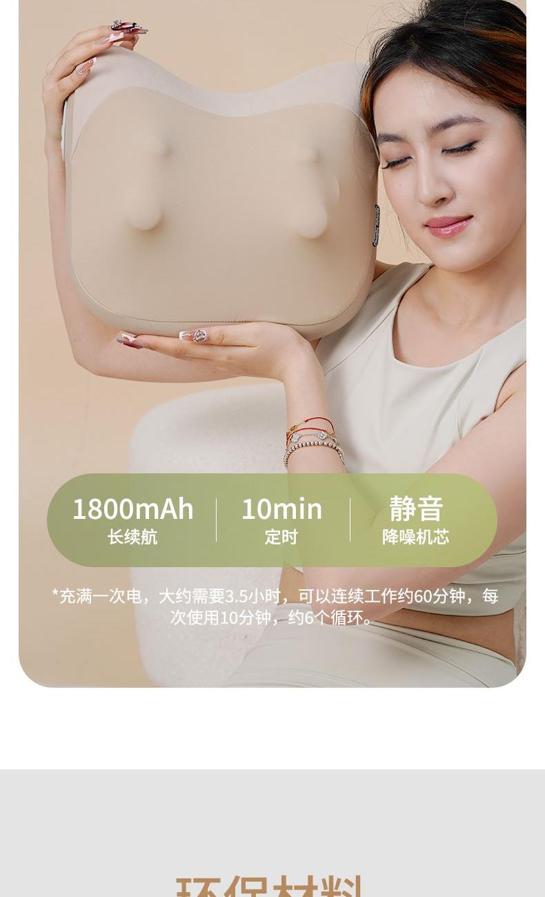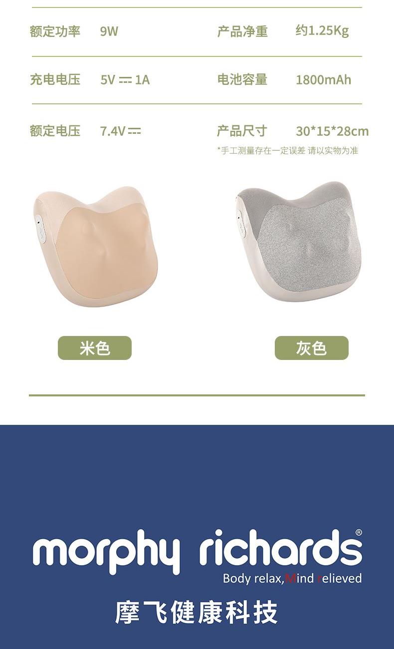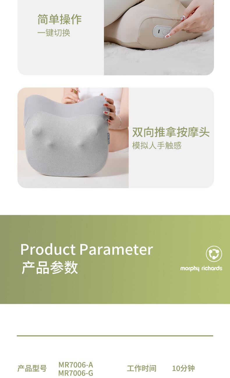 型号 MR7006-G 产地 广东中山 净重 1182g 毛重 1500g 包装尺寸 32X28X14cm 大箱尺寸 61x34x30cm 产品参数 续航:约6个循环(单循环10min) 充电时间:3小时±0.5小时 充电电压:5V1A 额定功率:9w 工作电压:7.4V 充电接口:Type-C 电池容量:1800毫安 执行标准:GB4706.1-2005/GB4706.10-2008 配件:按摩枕,充电线 卖点: 正逆双向揉捏式按摩,仿人手更舒适 3D立体按摩头,40℃大面积热敷 无线束缚,摆脱电源线,大容量电池续航 科学分区,托扶腰背 一机多用,多部位按摩 10分钟智能定制,自动开关
