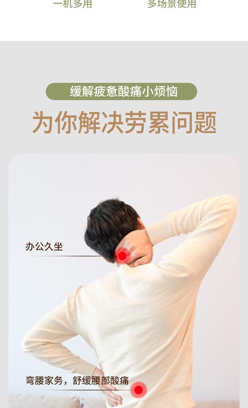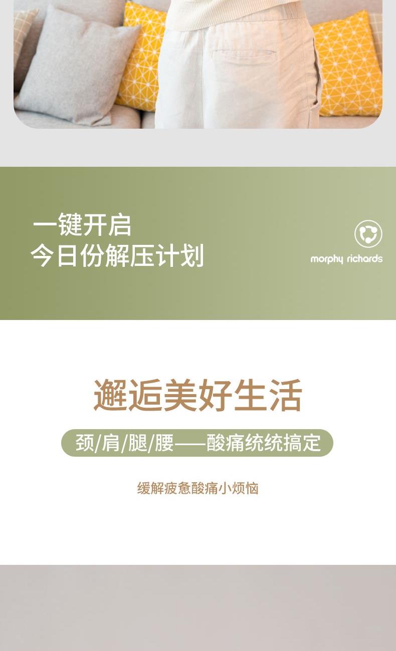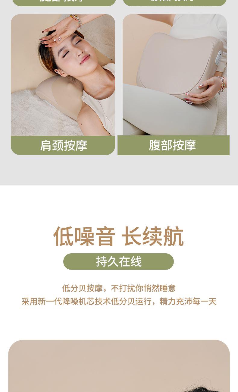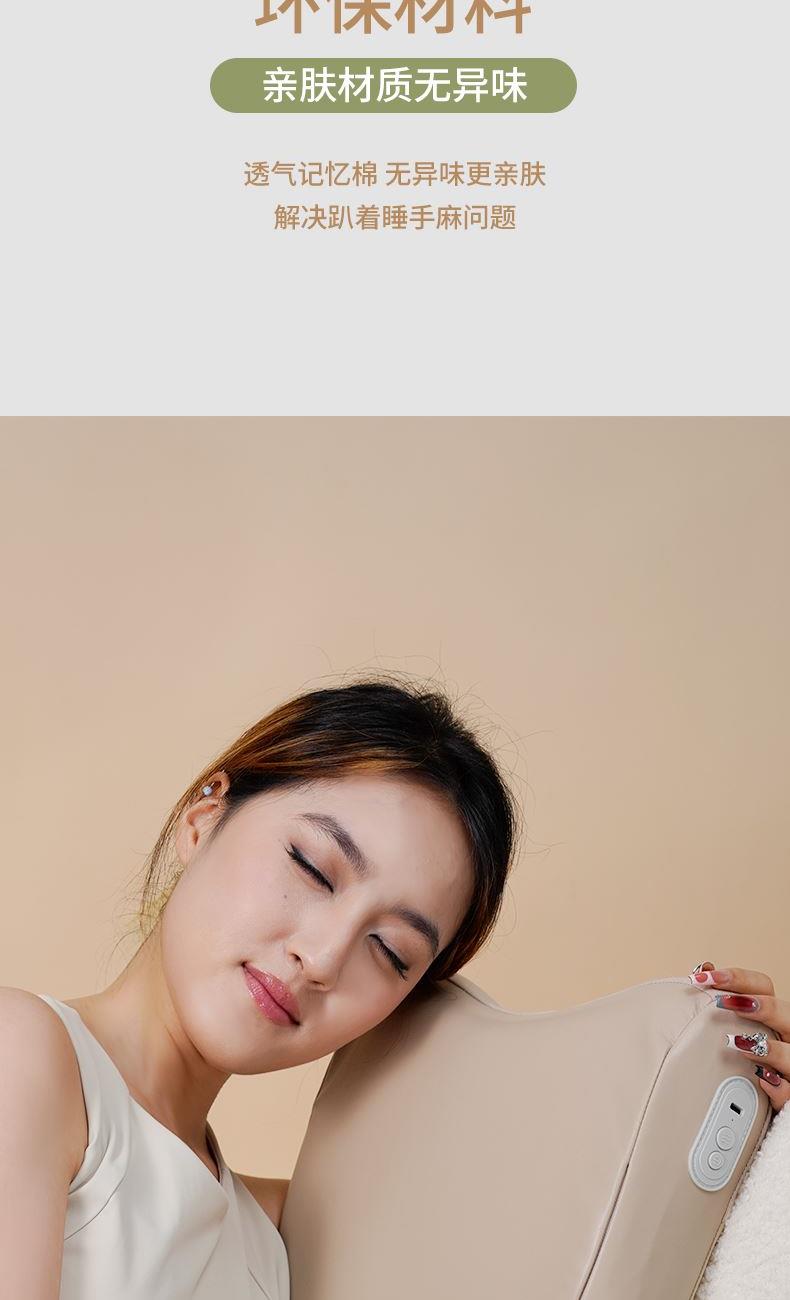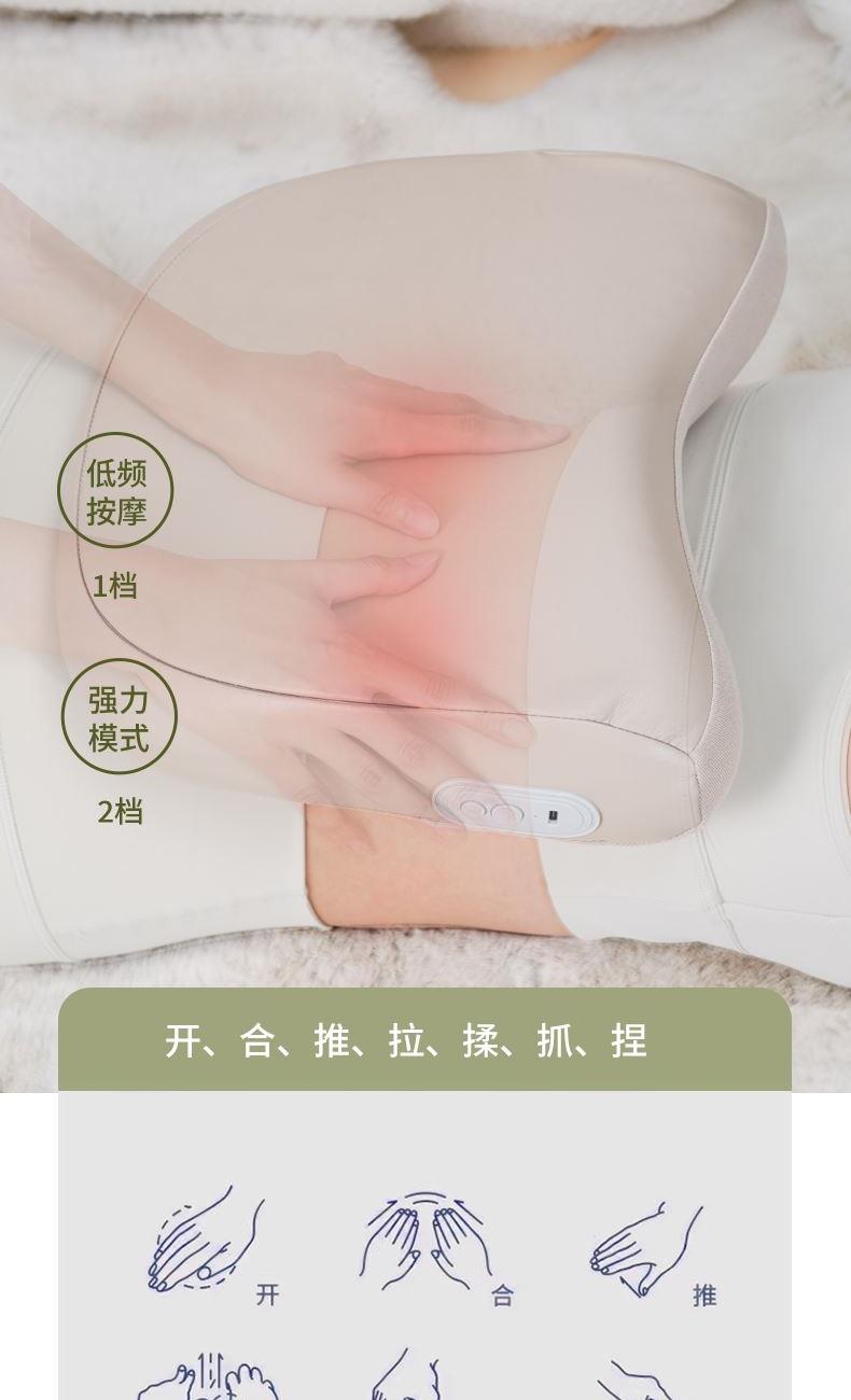型号 MR7006-G 产地 广东中山 净重 1182g 毛重 1500g 包装尺寸 32X28X14cm 大箱尺寸 61x34x30cm 产品参数 续航:约6个循环(单循环10min) 充电时间:3小时±0.5小时 充电电压:5V1A 额定功率:9w 工作电压:7.4V 充电接口:Type-C 电池容量:1800毫安 执行标准:GB4706.1-2005/GB4706.10-2008 配件:按摩枕,充电线 卖点: 正逆双向揉捏式按摩,仿人手更舒适 3D立体按摩头,40℃大面积热敷 无线束缚,摆脱电源线,大容量电池续航 科学分区,托扶腰背 一机多用,多部位按摩 10分钟智能定制,自动开关