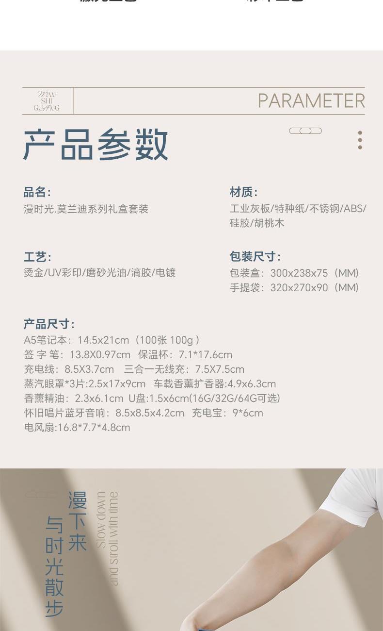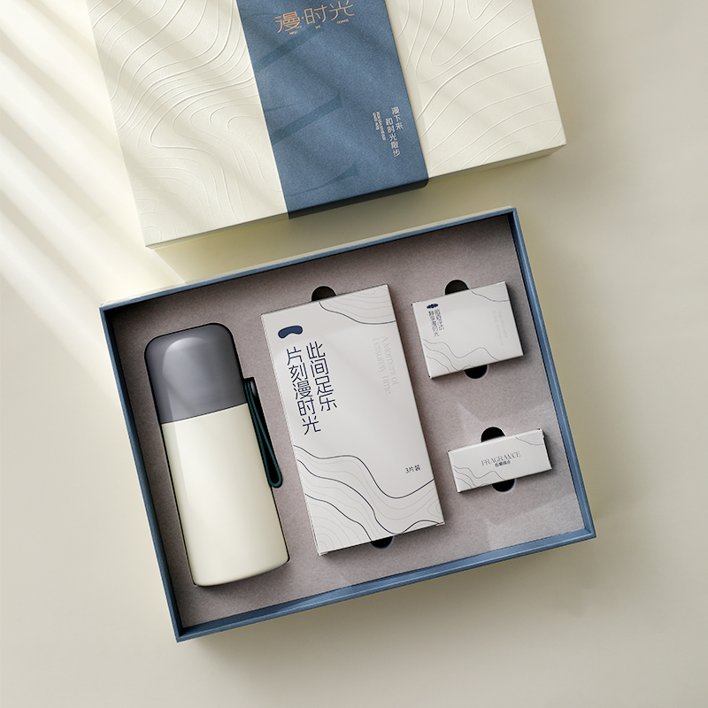 保温杯+蒸汽眼罩+车载香薰扩香器+香薰精油 配置 保温杯:7.1x17.6cm 香薰精油:2.3x6.1cm 蒸汽眼罩*3片:2.5x17x9cm 车载香薰扩香器:4.9x6.3cm 材质 工业灰板/特种纸/不锈钢/ABS/硅胶/胡桃木 工艺 烫金/烫银/磨砂光油/滴胶/电镀 尺寸 包装盒:300x238x75(MM) 手提袋:358x270x85(MM)