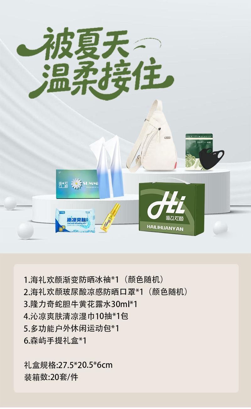 1.海礼欢颜渐变防晒冰袖*1(颜色随机) 2.海礼欢颜玻尿酸凉感防晒口罩*1(颜色随机) 3.隆力奇蛇胆牛黄花露水30ml*1 4.沁凉爽肤清凉湿巾10抽*1包 5.多功能户外休闲运动包*1 6.森屿手提礼盒*1