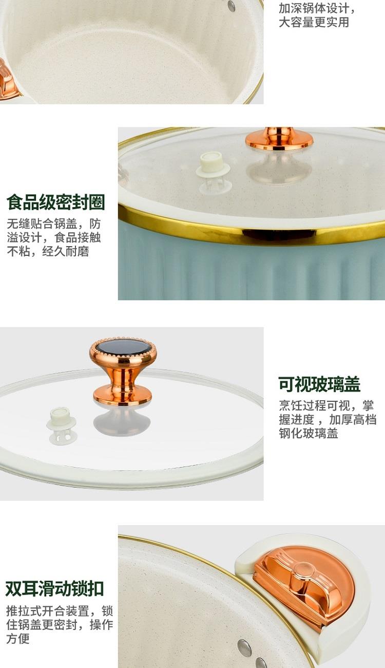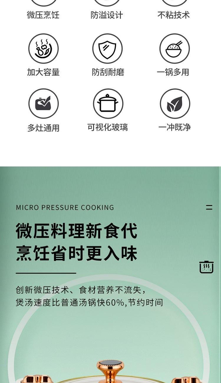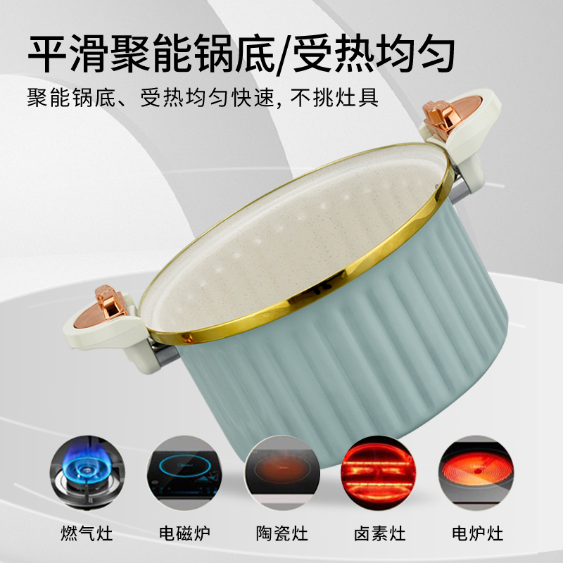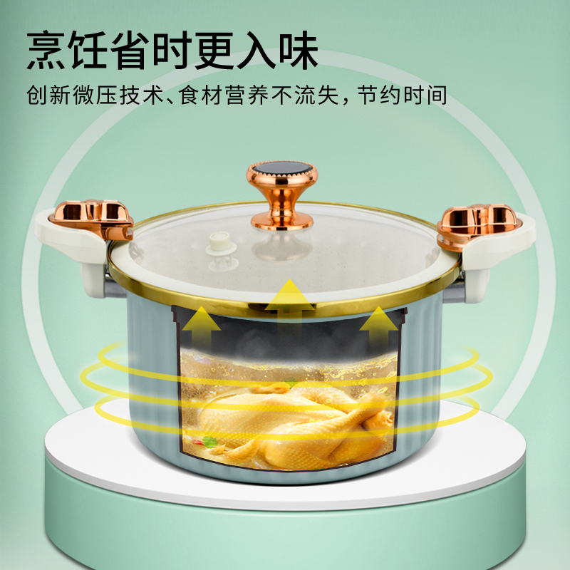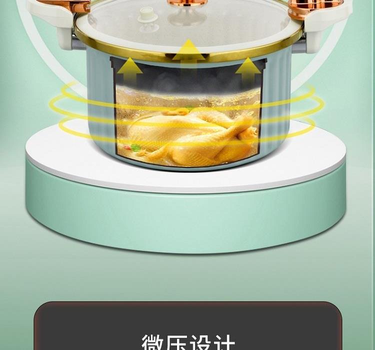 规 格:26cm(7L) 材 质:精铁 颜。 色:白色、天青色 包装尺寸:30*30*16.5cm 采用标准食品接触精铁材质精制而成,内外熔色喷涂工艺,大容量美观大方; 锅盖采用加厚的T型微压玻璃盖,手柄可拆卸清洗,微压汤锅均有不粘效果,适用所有炉具。 双密封微压节能设计,无风险负压焖烧省时省力