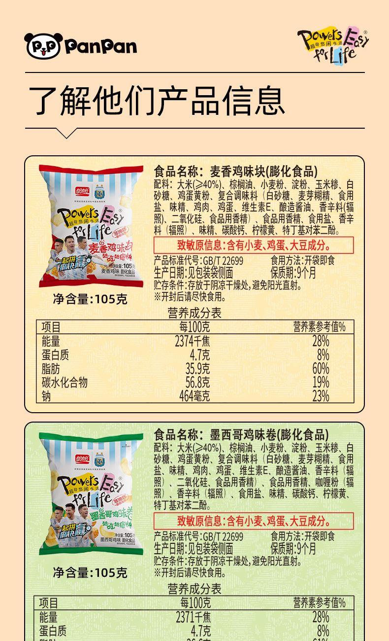 规格105g 盼盼麦香鸡味块105g,满满一包超满足! 精选阳光小麦粉、优质玉米糁,非油炸工艺,健康不上火 。 外表裹满特制粉料,入口金黄酥脆,融合,咸香可口不油腻。 多种风味可选,追剧、聚会、解馋都合适。