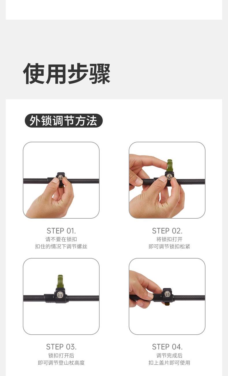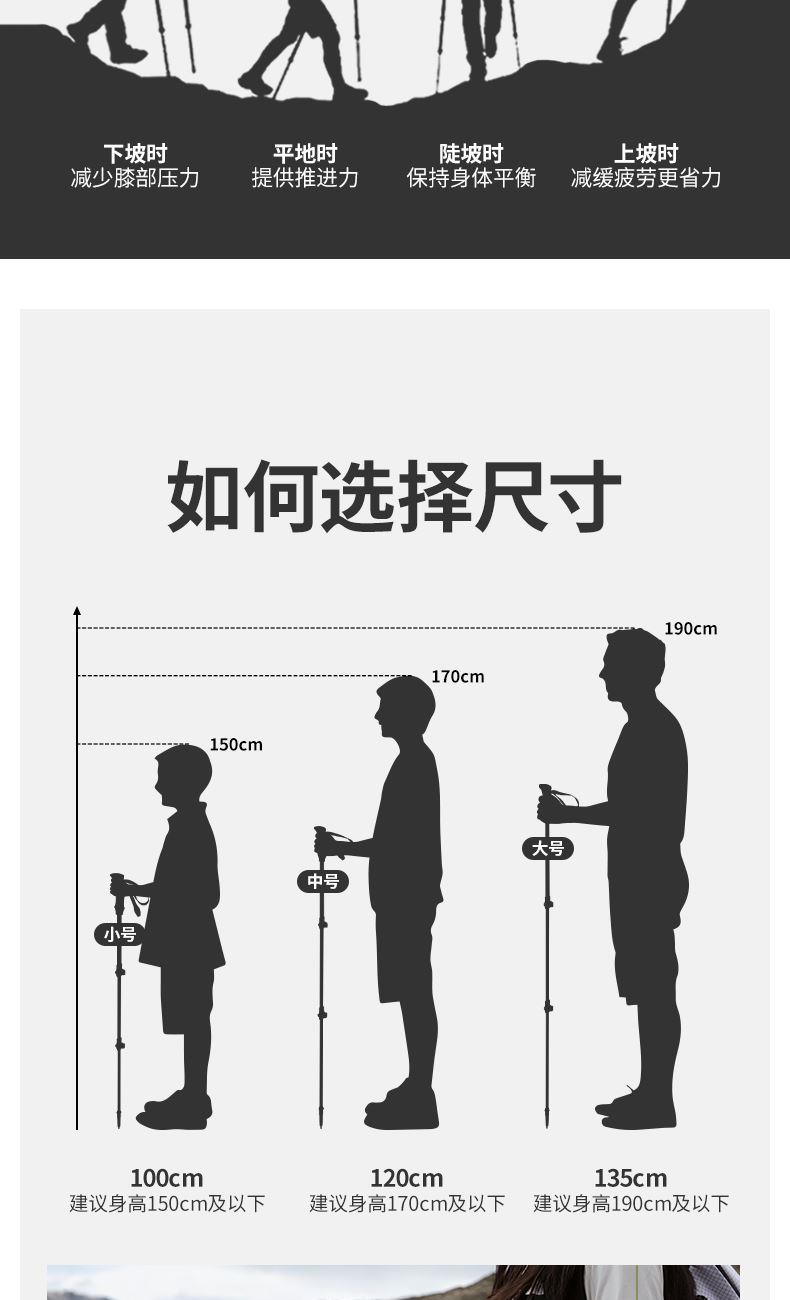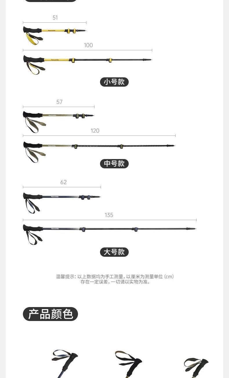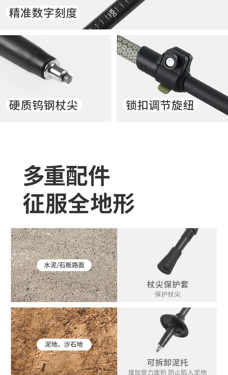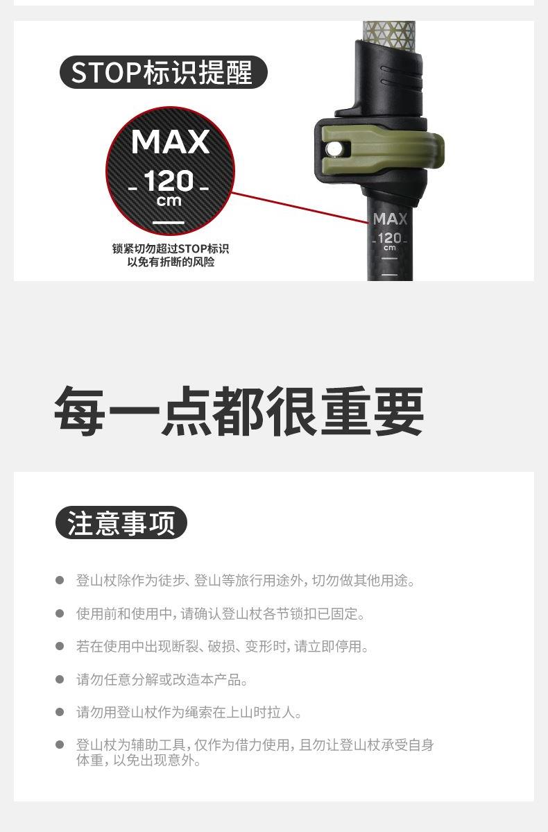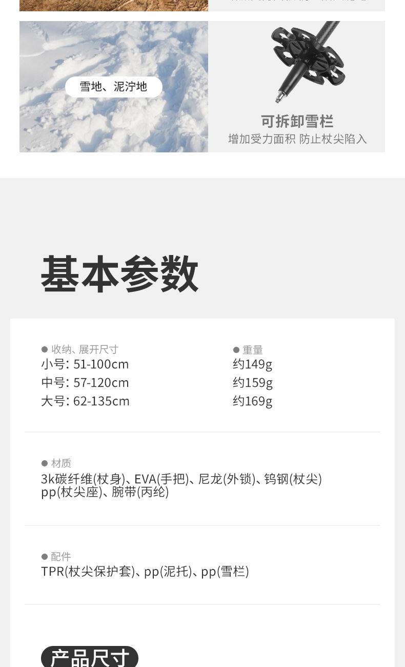 型号:CNK2300DS010 产品:初雪EXT1-三节碳纤维登山杖尺寸:10cm,120cm,135cm重量:约135g,159g,169g 颜色:多色 材质:碳纤维