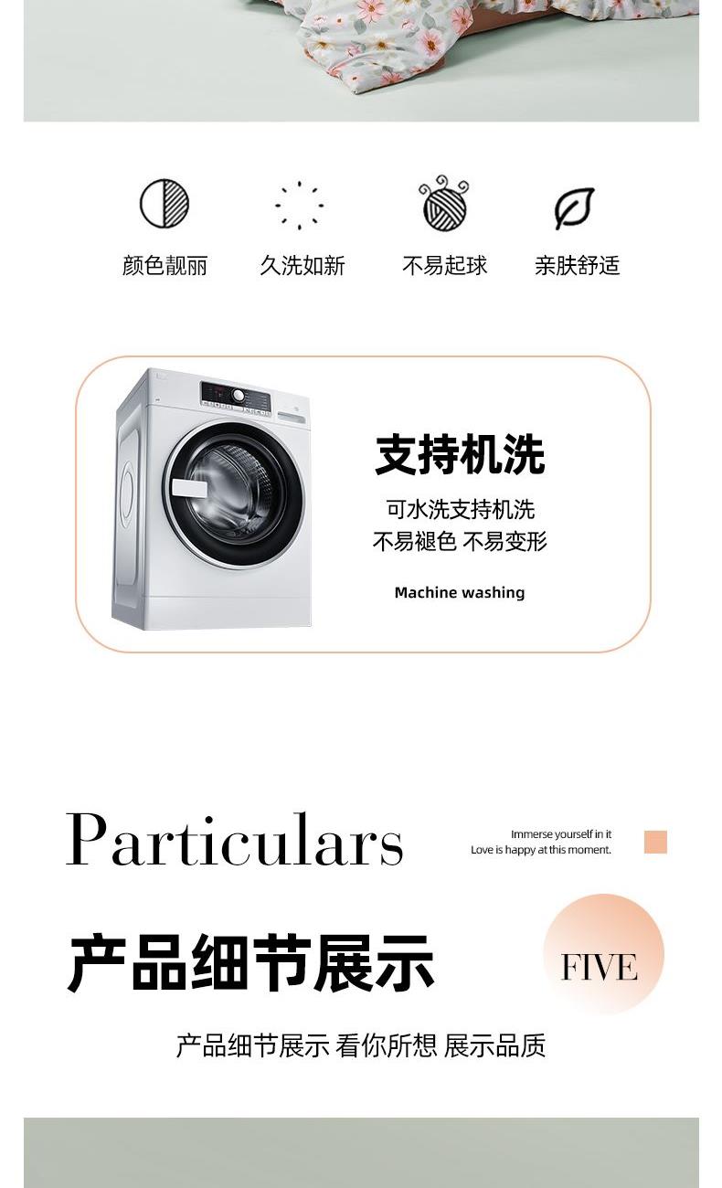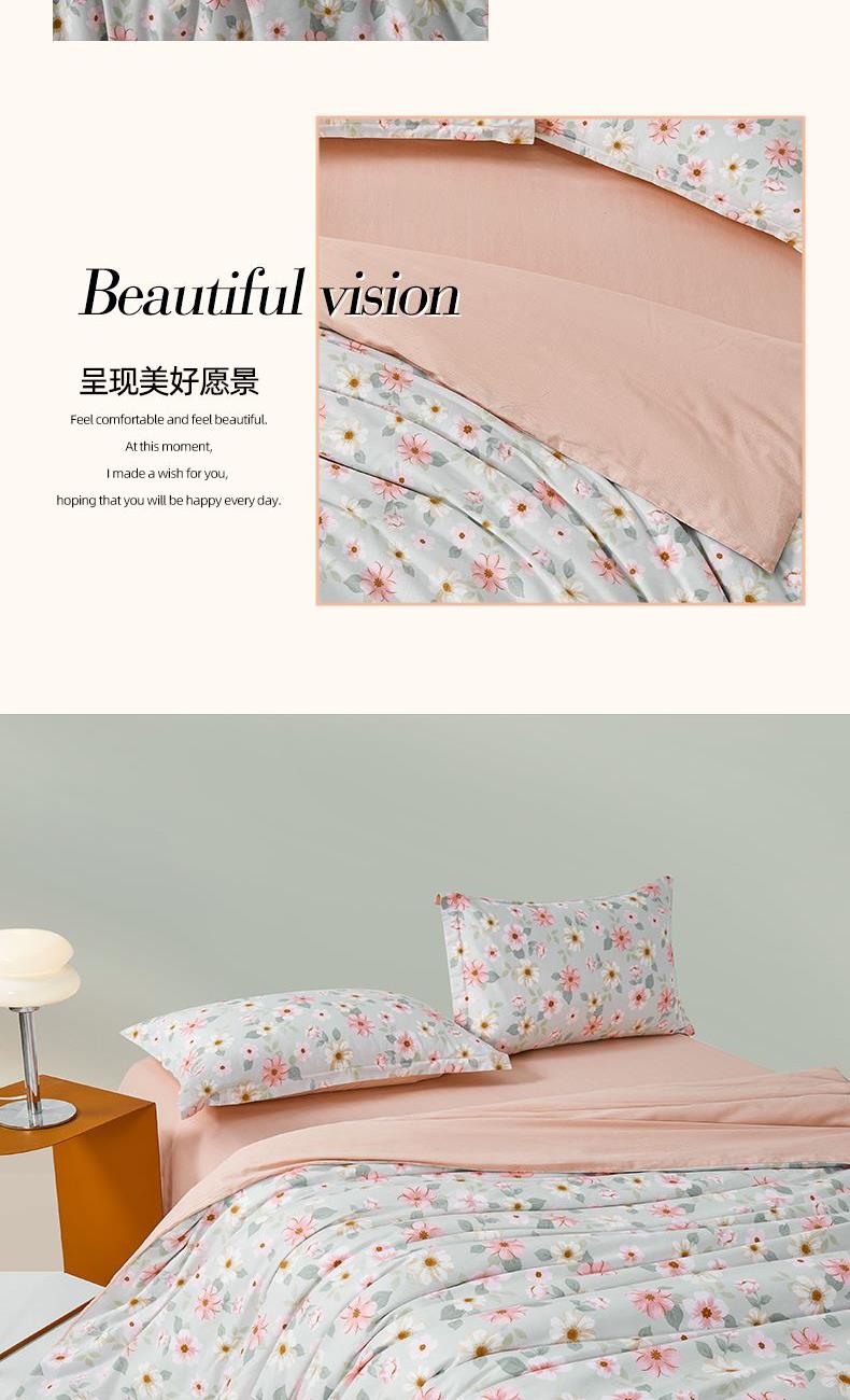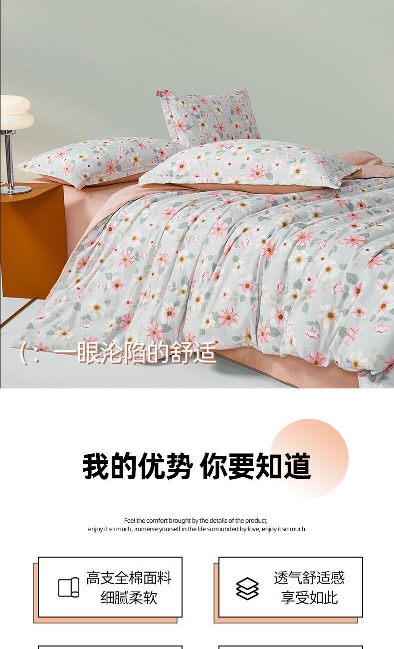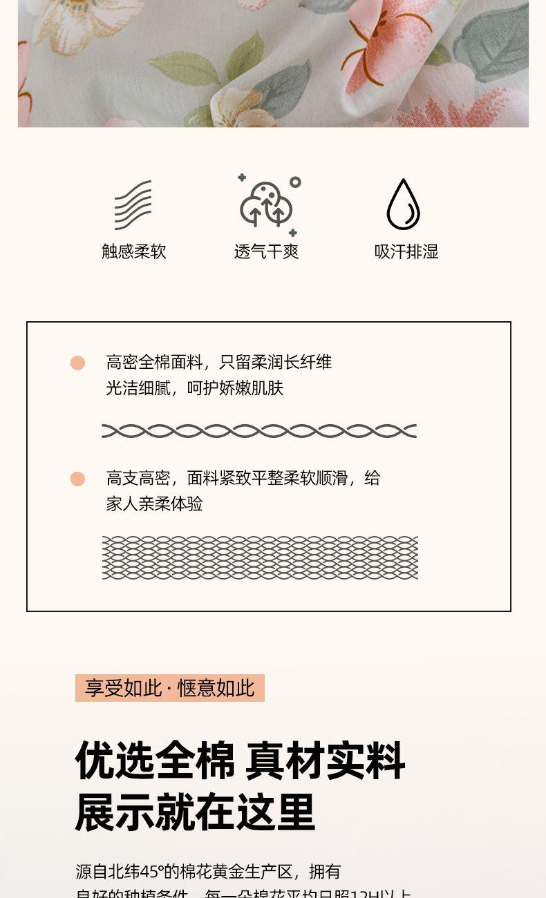 参数: 面料:10 0%棉 规格:被套200*230cm 床单250*245cm 枕套48*74cm*2个 卖点: 采用优质新疆棉,舒适透气,面料全工艺喷气印染技术,鲜亮不褪色。