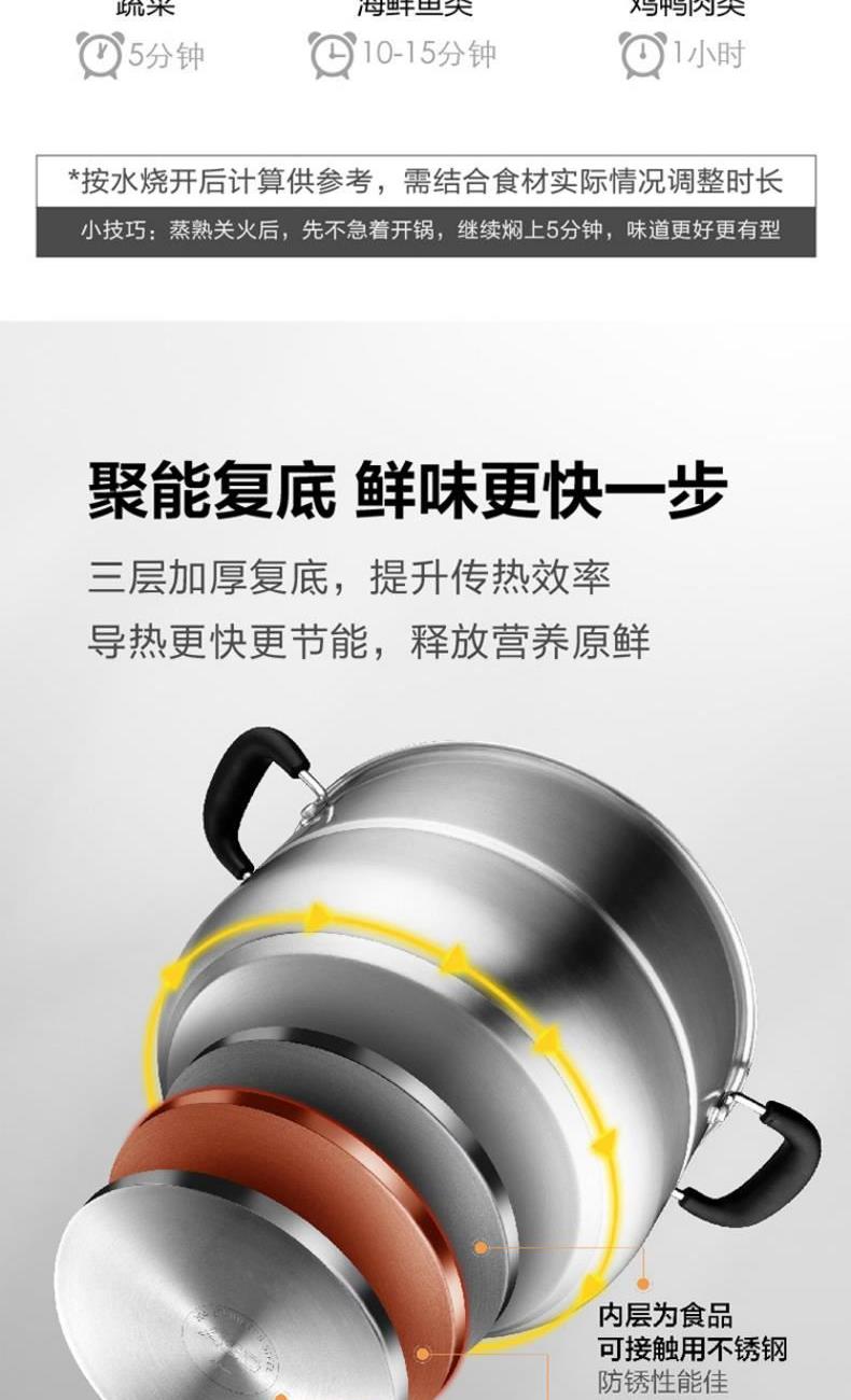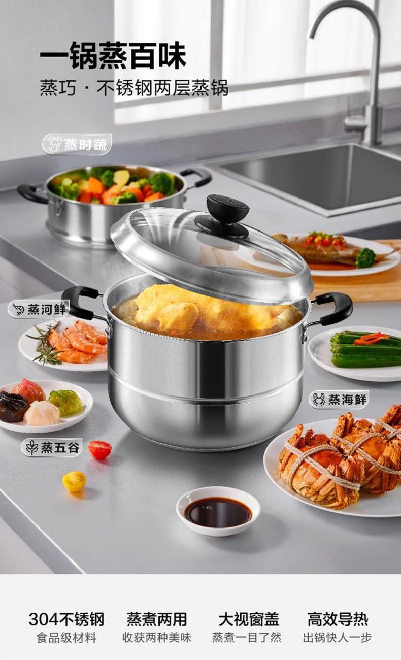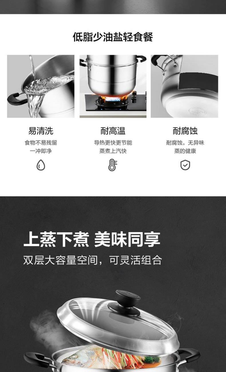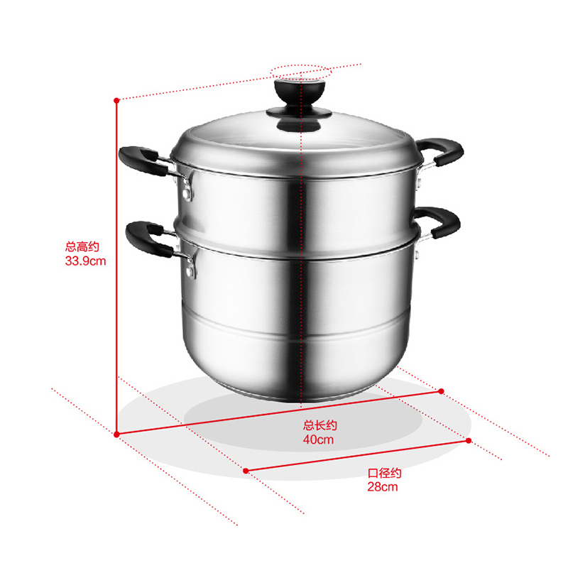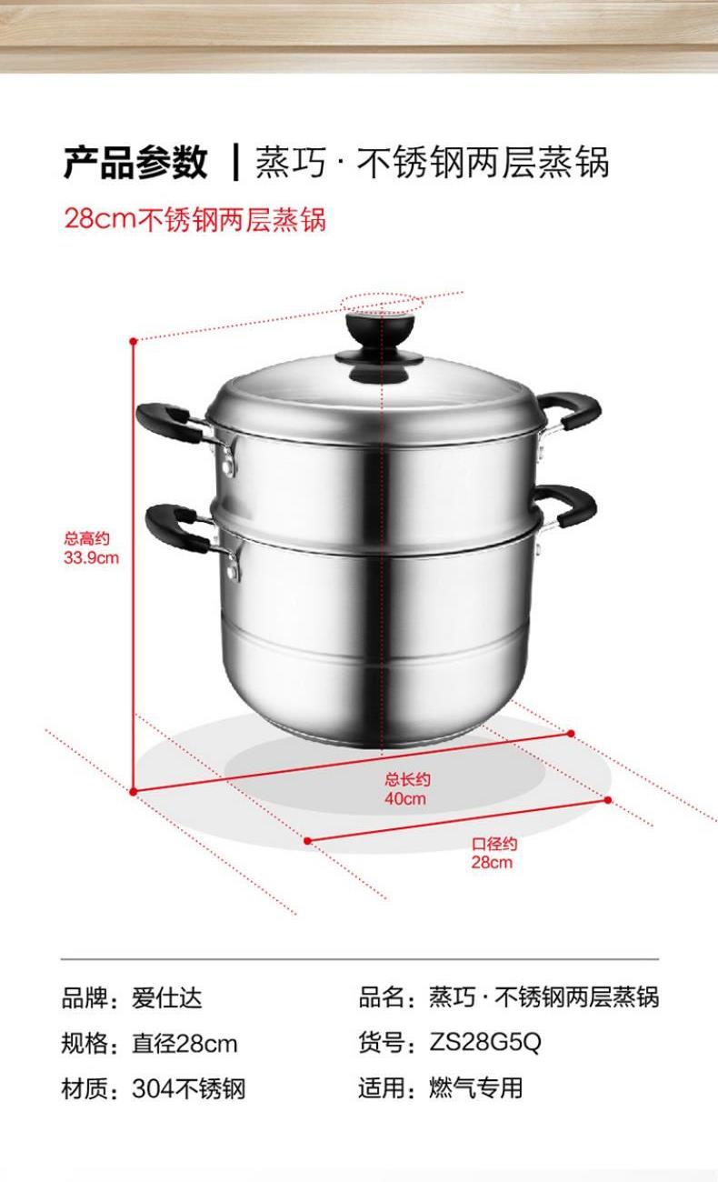 产品型号:ZS28G5Q 产品规格:直径28cm. 产品材质:304不锈钢。 适用炉具:燃气/电磁炉通用。 彩盒尺寸:360*300*250 1、304不锈钢,食品级材料。 2、蒸煮两用,收获两种美味。 3、大视窗盖,蒸煮一目了然。 4、高效导热,出锅快人一步。 5、上蒸下煮美味同享,双层大容量空间,可灵活组合。