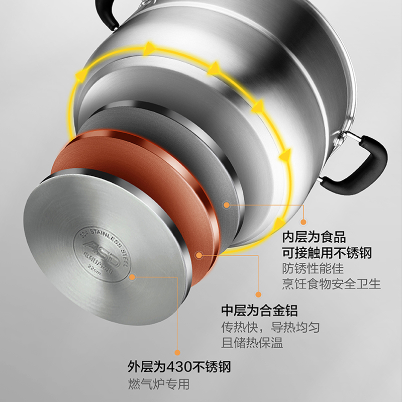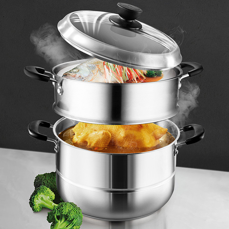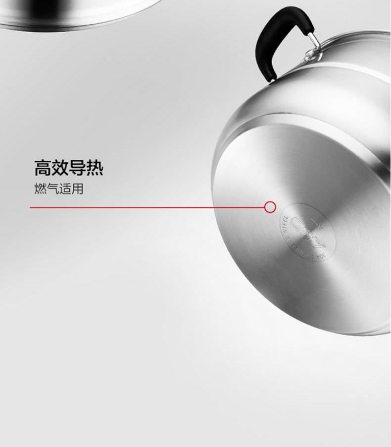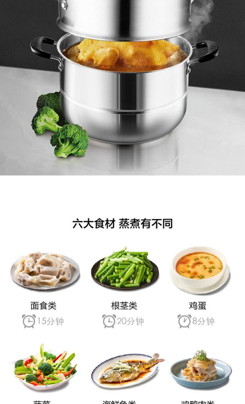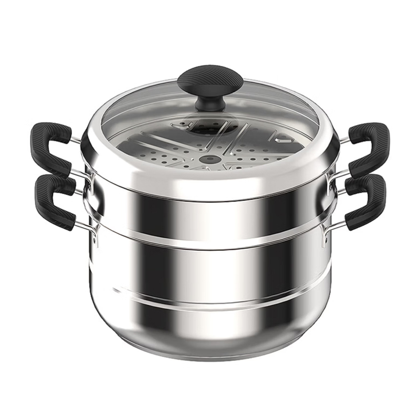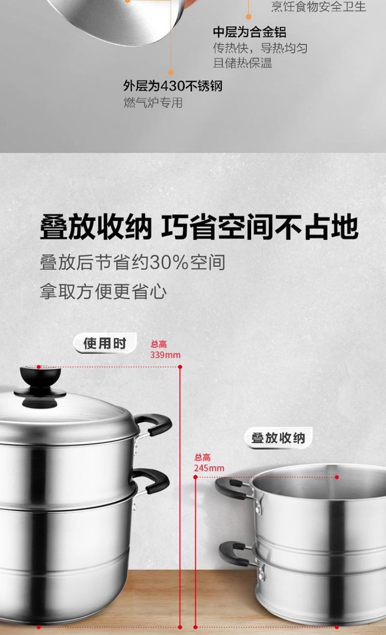 产品型号:ZS28G5Q 产品规格:直径28cm. 产品材质:304不锈钢。 适用炉具:燃气/电磁炉通用。 彩盒尺寸:360*300*250 1、304不锈钢,食品级材料。 2、蒸煮两用,收获两种美味。 3、大视窗盖,蒸煮一目了然。 4、高效导热,出锅快人一步。 5、上蒸下煮美味同享,双层大容量空间,可灵活组合。