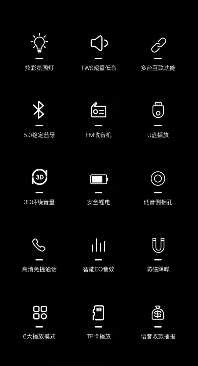 1.双机TWS互联震撼立体 强劲音质; 2.新增可调照明常亮设计,整夜陪伴音箱&夜灯便捷切换温馨灯效; 3.尽情享受沉浸式的音乐体验; 4.菱形钻石纹光随声动,360°氛围灯效 惊艳夺目