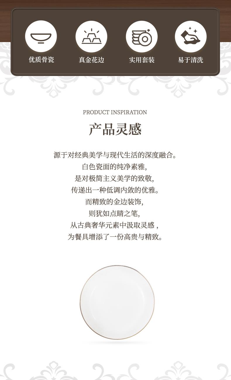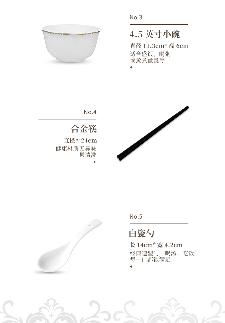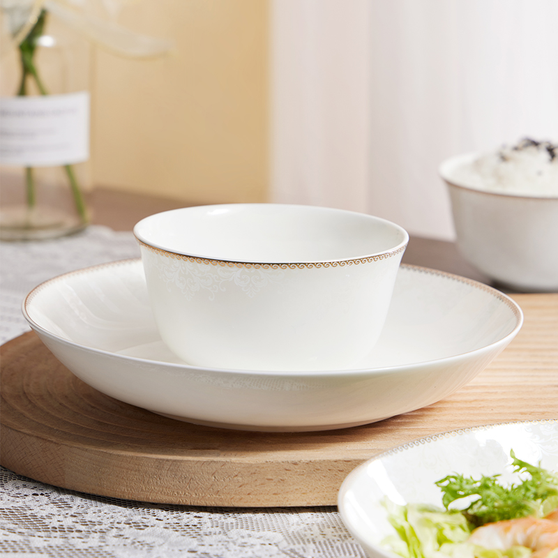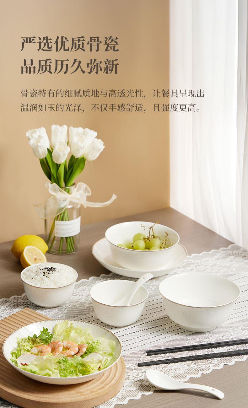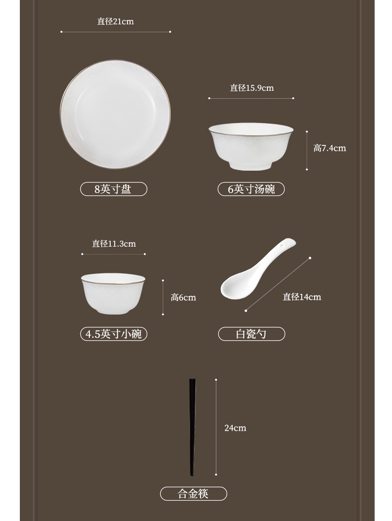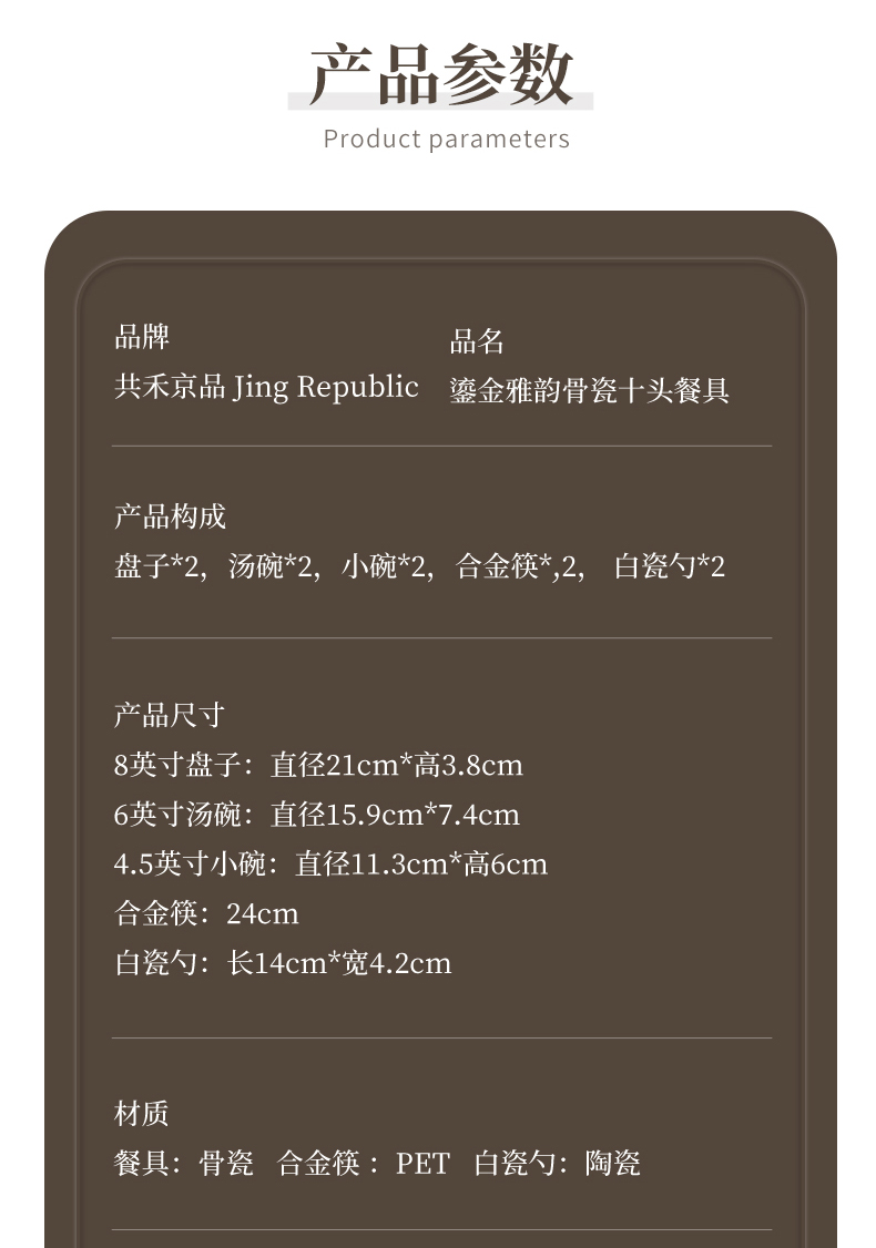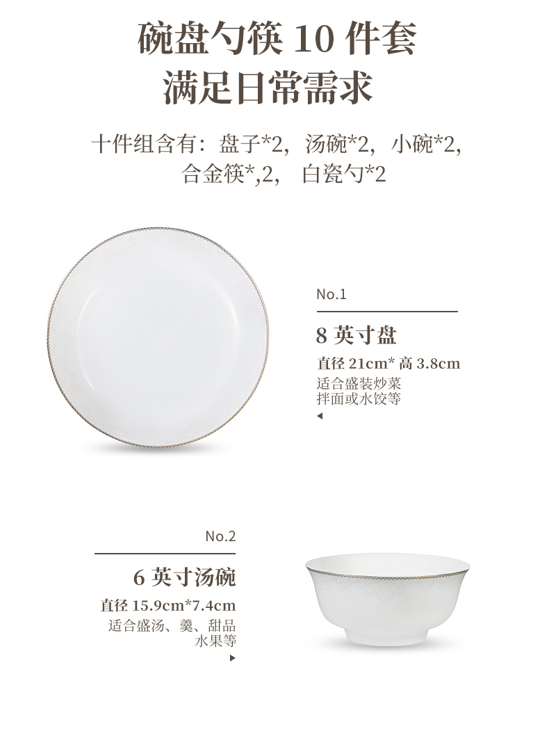 材质:餐具:骨瓷 合金筷:PET 勺子:陶瓷 包含:小碗*2,盘子*2,汤碗*2,白瓷勺*,2, 合金筷*2 尺寸:4.5英寸小碗:直径11.3cm*高6cm 8英寸盘子:直径21cm*高3.8cm 6英寸汤碗:直径15.9cm*7.4cm 白瓷勺:长14cm*宽4.2cm 合金筷:24cm 普盒装:39.5cm*15.5cm*31.5cm 产品卖点 ① 严选优质骨瓷,品质历久弥新 ② 精致金边装饰,搭配低调暗纹 ③ 10头碗盘构成,满足一家所需 ④ 釉面光滑润泽,精湛工艺更实用