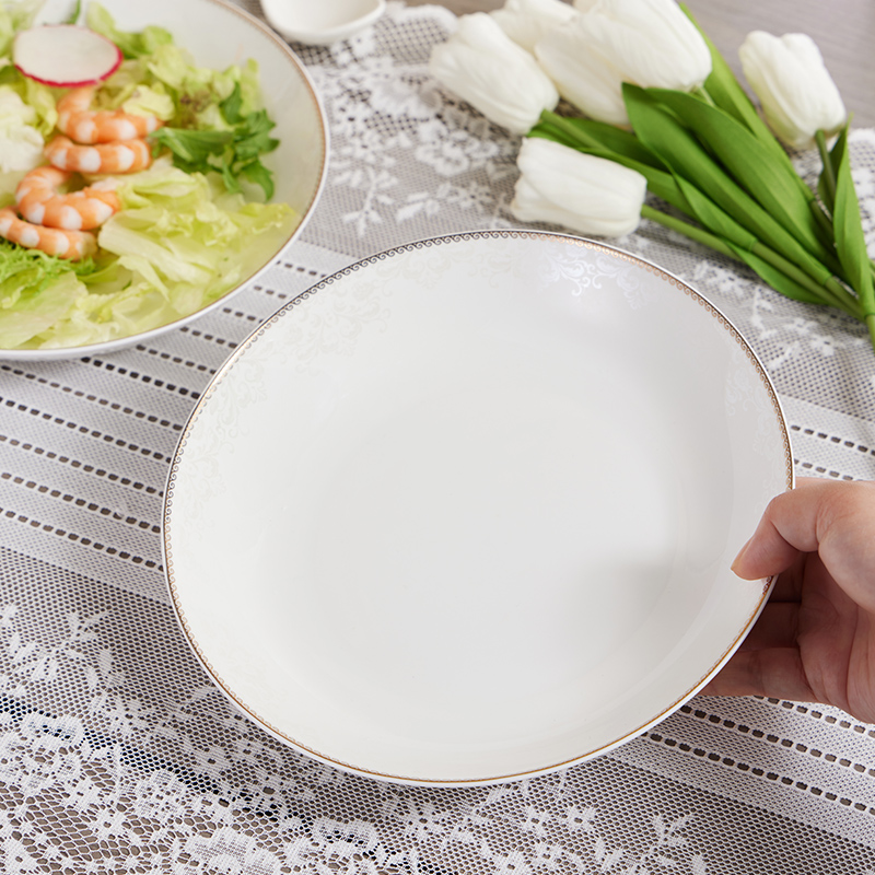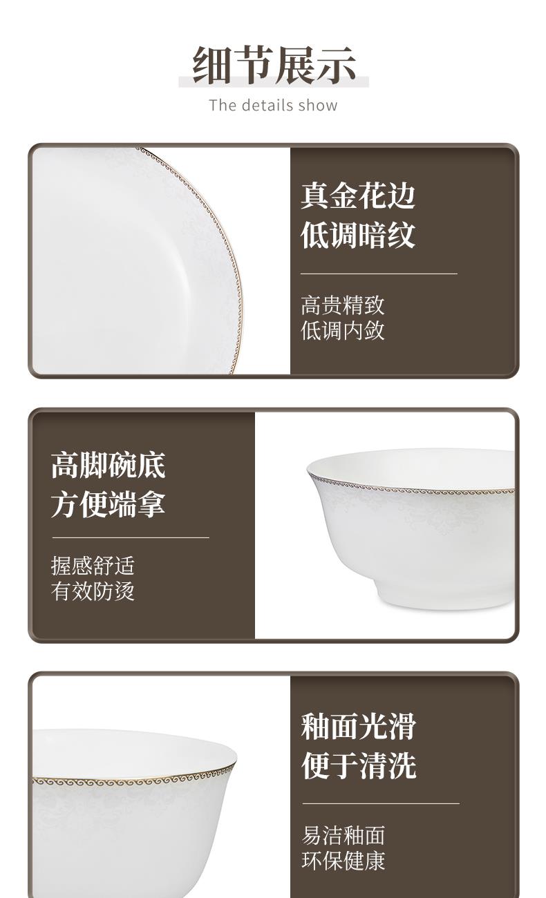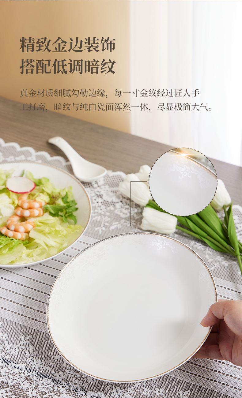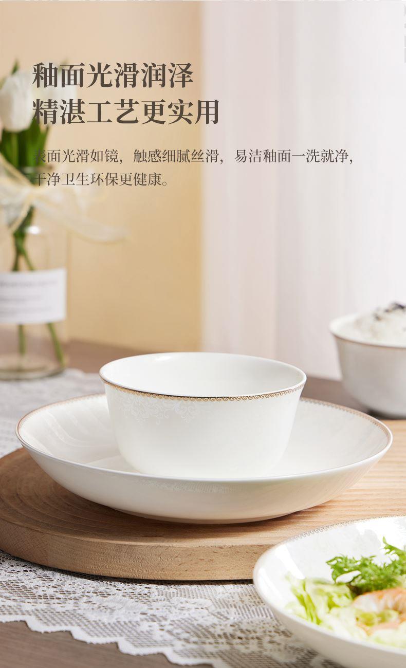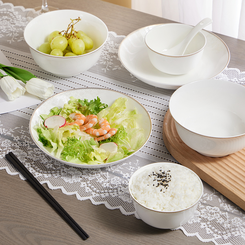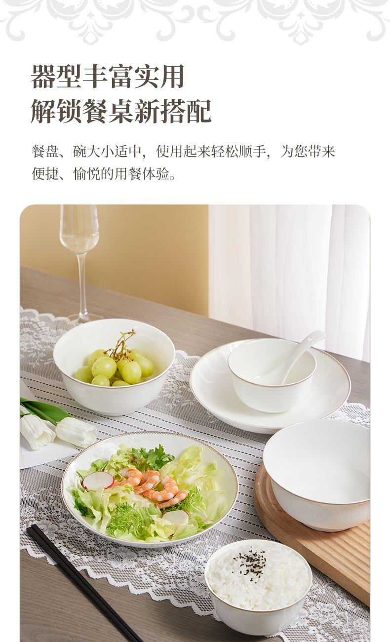 材质:餐具:骨瓷 合金筷:PET 勺子:陶瓷 包含:小碗*2,盘子*2,汤碗*2,白瓷勺*,2, 合金筷*2 尺寸:4.5英寸小碗:直径11.3cm*高6cm 8英寸盘子:直径21cm*高3.8cm 6英寸汤碗:直径15.9cm*7.4cm 白瓷勺:长14cm*宽4.2cm 合金筷:24cm 普盒装:39.5cm*15.5cm*31.5cm 产品卖点 ① 严选优质骨瓷,品质历久弥新 ② 精致金边装饰,搭配低调暗纹 ③ 10头碗盘构成,满足一家所需 ④ 釉面光滑润泽,精湛工艺更实用