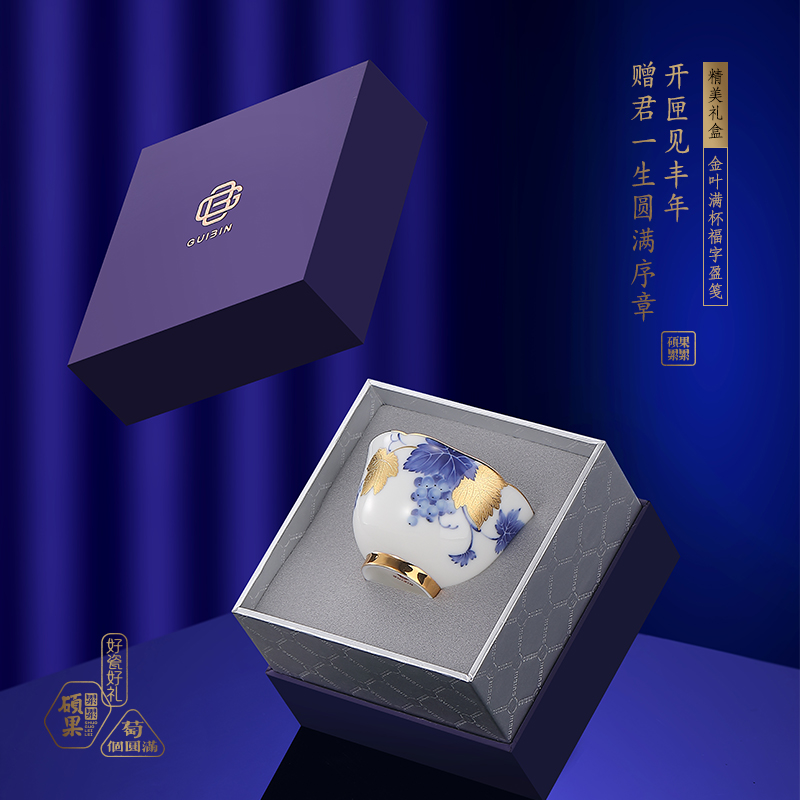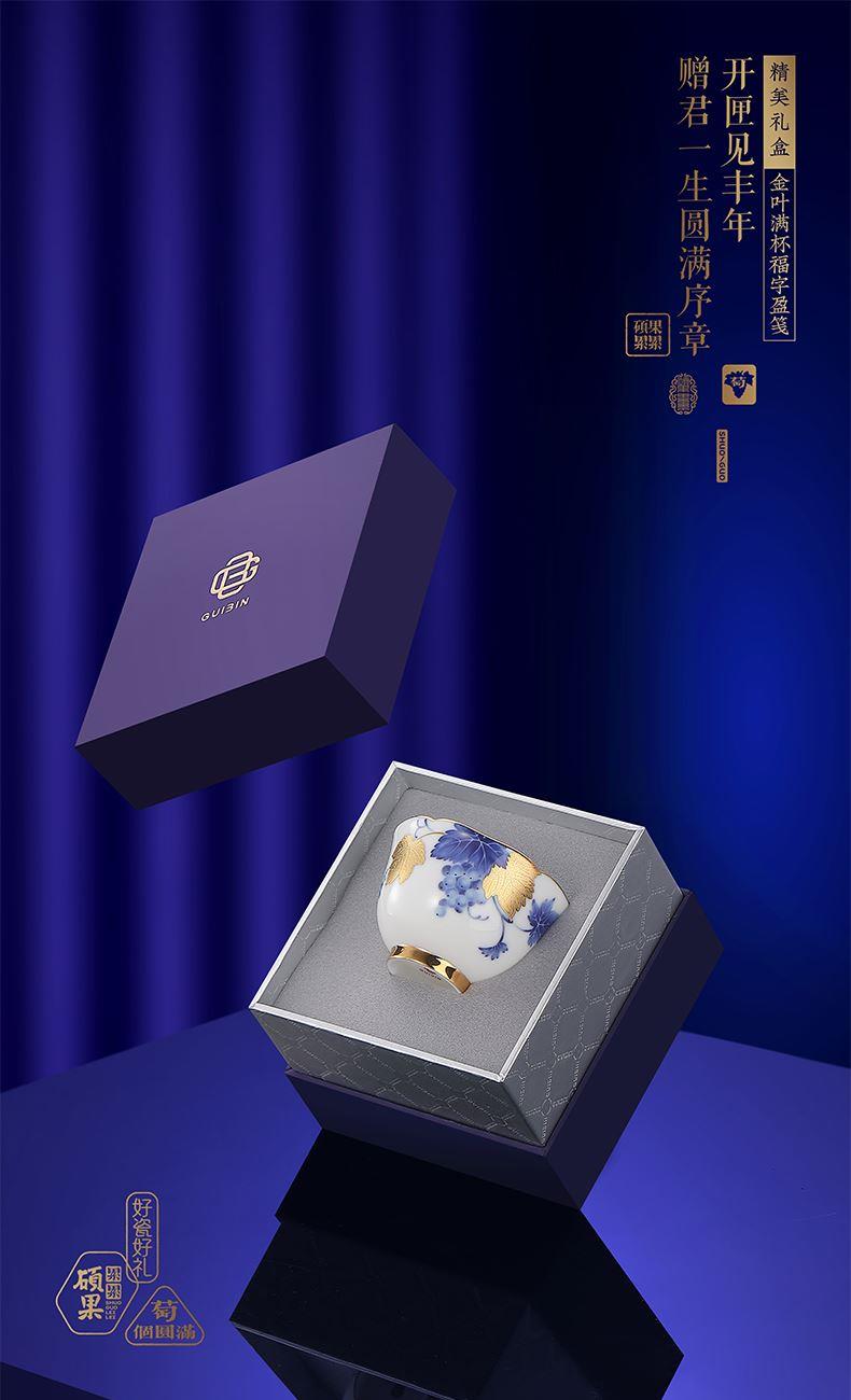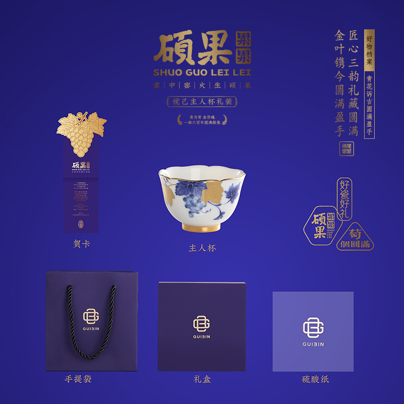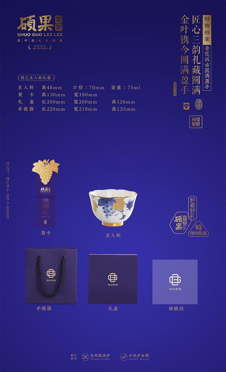 悦已主人杯礼装 1.主人杯:高46mm、口径:70mm、容量:75ml 2.贺卡:高130mm、宽100mm 3.礼盘:长200mm、宽200mm、高126mm 4.手提袋:长220mm、宽210mm、高135mm