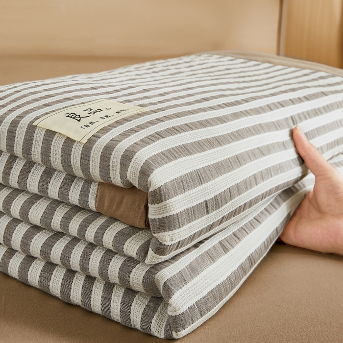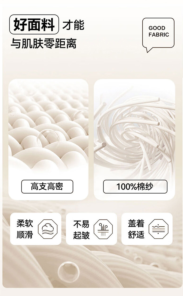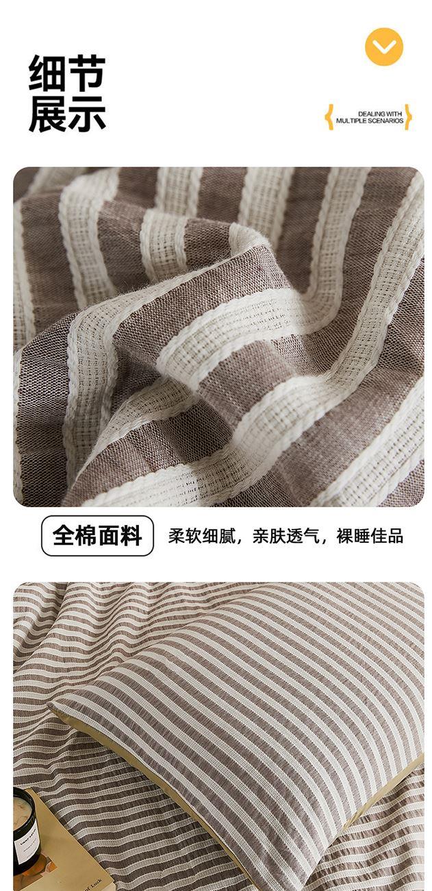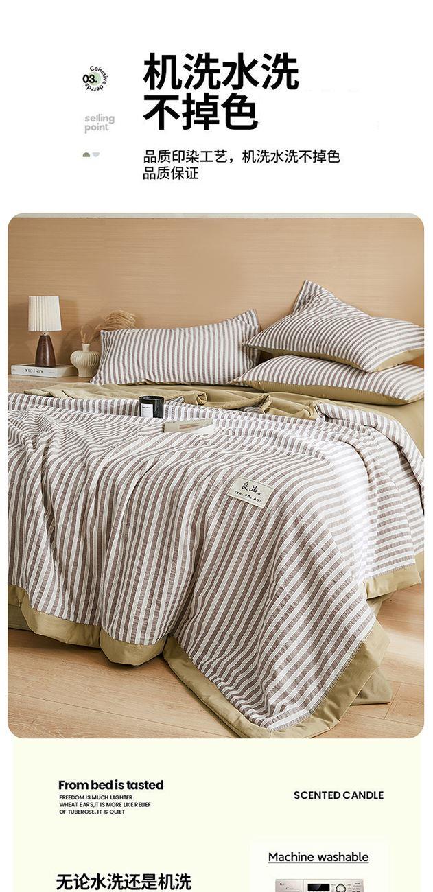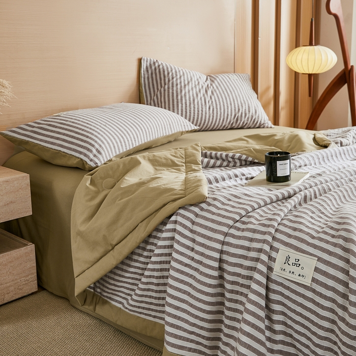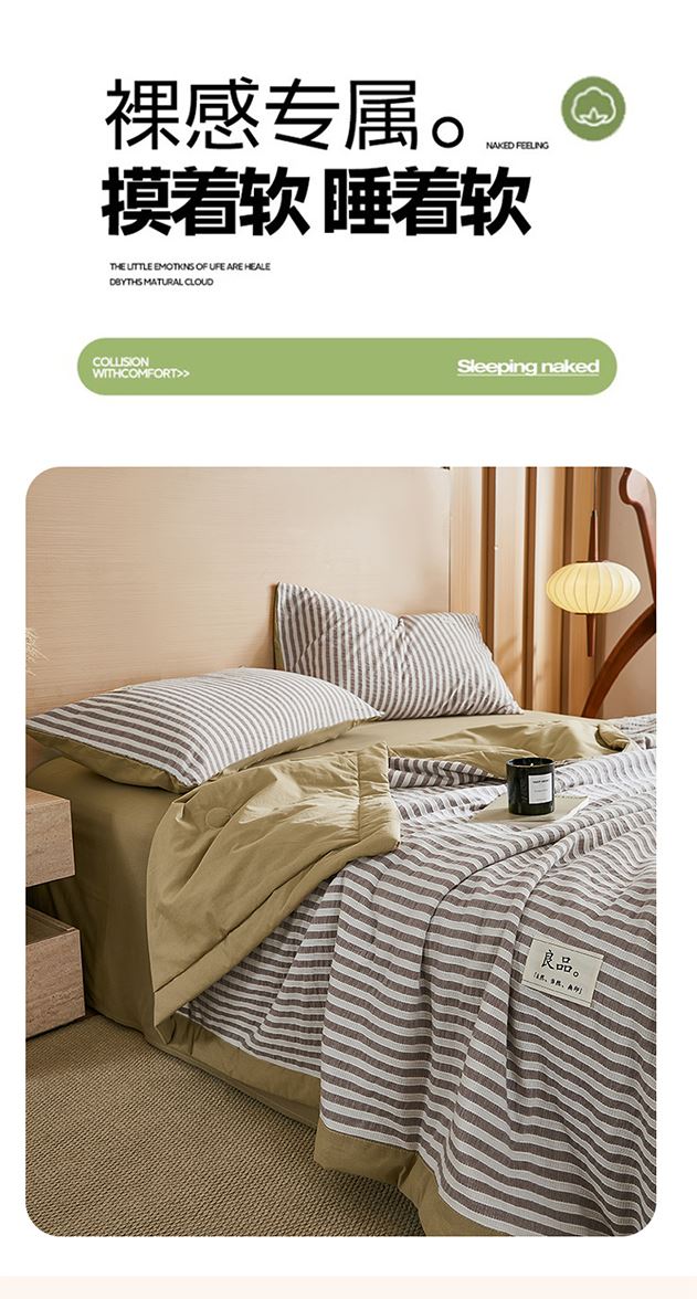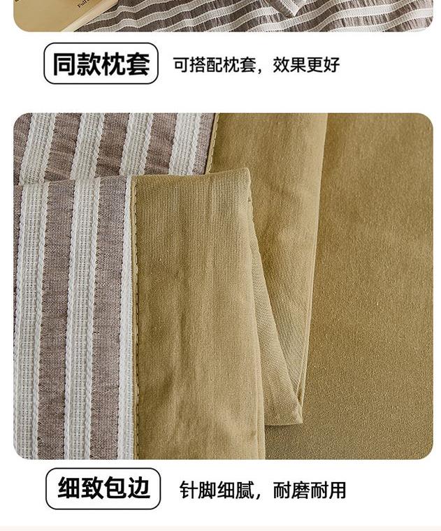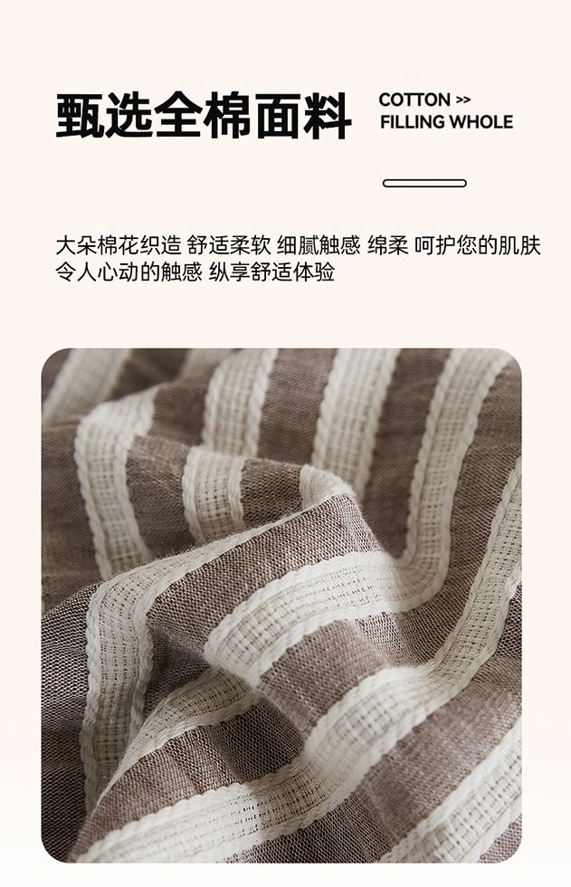 尺寸:200*230cm 面料:全棉 填充:10%大豆纤维+90%羽丝棉 填充克重:1200g 执行标准:GB/T22796-2021 安全类别:GB18401-2010 B类 1.用传统色织水洗工艺,保留全棉天然呼吸感的同时,赋予面料旧时光般的温柔触感。经纬纱线先染后织,呈现出朦胧复古的混色效果,比普通印花面料更具立体层次感。经过高温水洗处理,触感如轻抚微皱的宣纸般柔韧亲肤,越洗越显柔软随性。