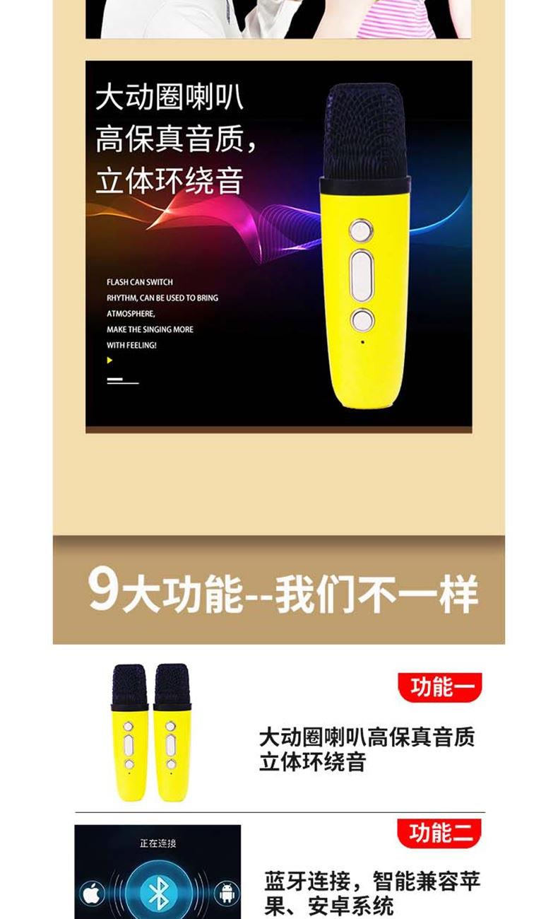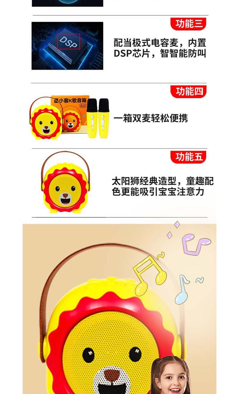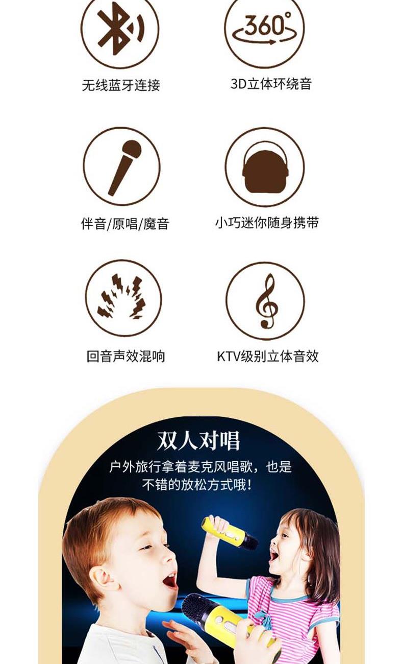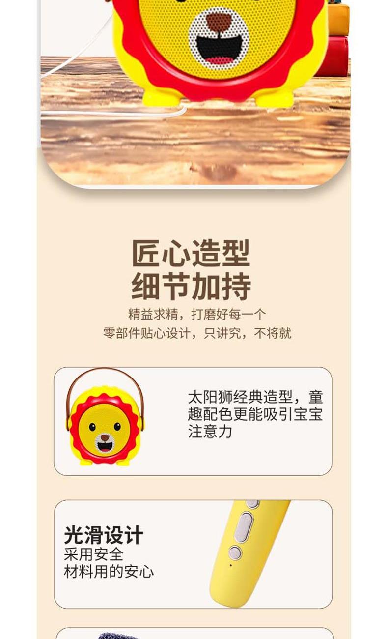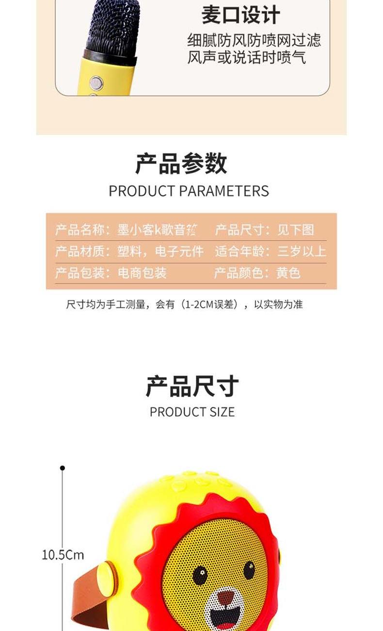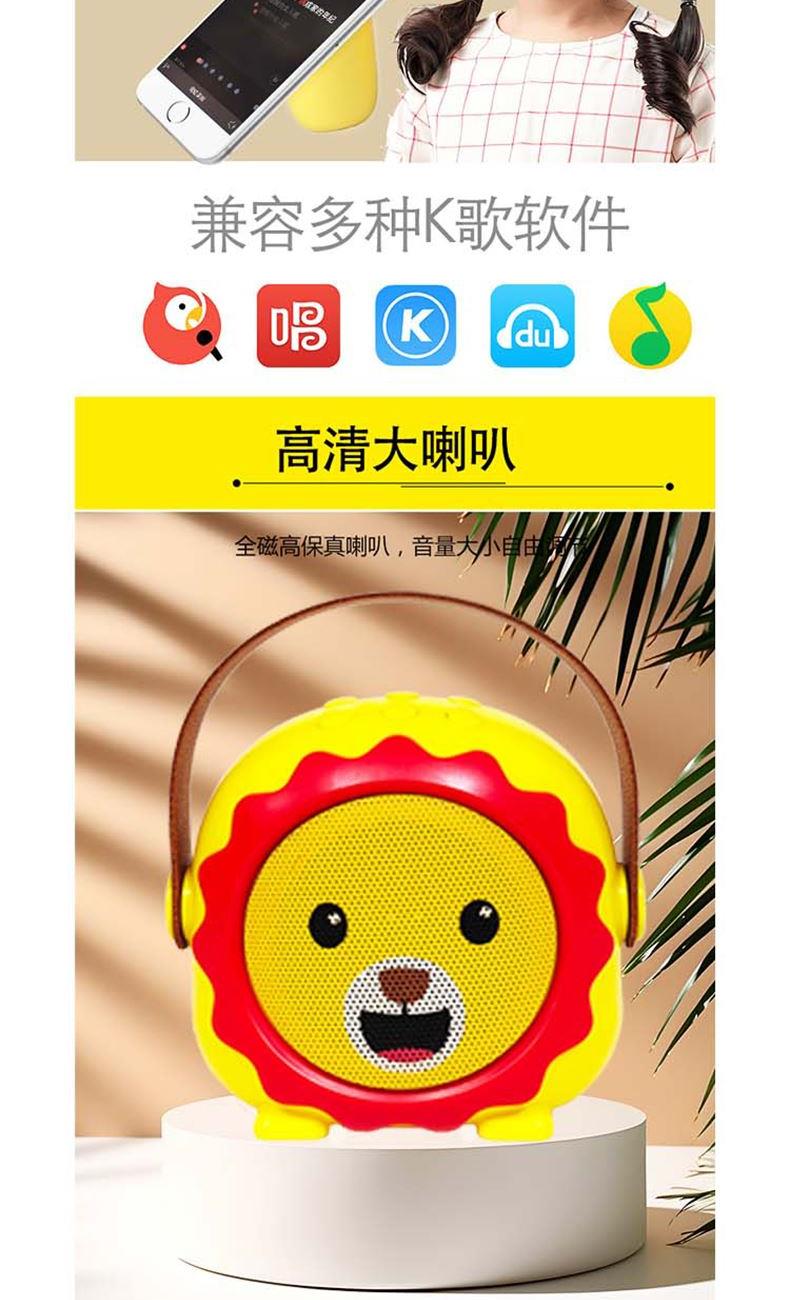 电池容量:1800mAh 产品重量:285g/490g 产品尺寸:9.5*7*9.5cm 彩盒尺寸:14*14*7.5cm 产品条码:6971070040675 产品特点 大动圈喇叭高保真音质,立体环绕音 蓝牙连接,智能兼容苹果、安卓系统 配背极式电容麦,内置DSP芯片,智能防啸叫 一箱双麦轻松便携