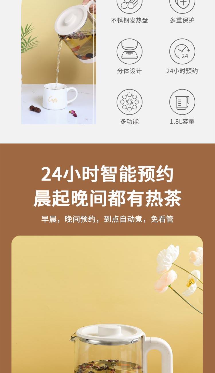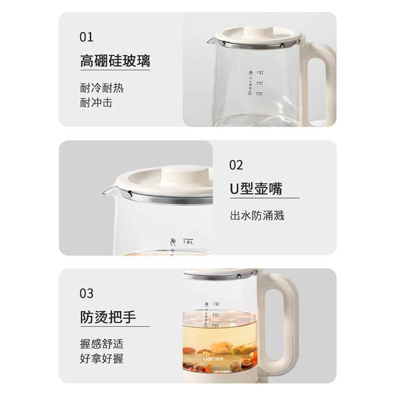 产品参数 额定电压:220V~ 额定频率:50Hz 额定功率:800W 额定容量:1.8L 产品净重:1.17kg 产品毛重:1.45kg 彩盒尺寸:270×210×230mm 产品特点 1、电子触摸式,操作简单; 2、壶身为高硼硅加厚玻璃,抗腐蚀,耐高温; 3、食品级不锈钢发热盘,耐腐蚀,安全卫生; 4、双重防干烧保护装置,干烧自动断电; 5、壶身可360度旋转; 带预约,定时功能; 6、28种功能选择。