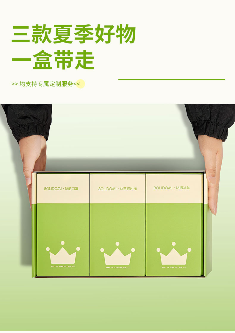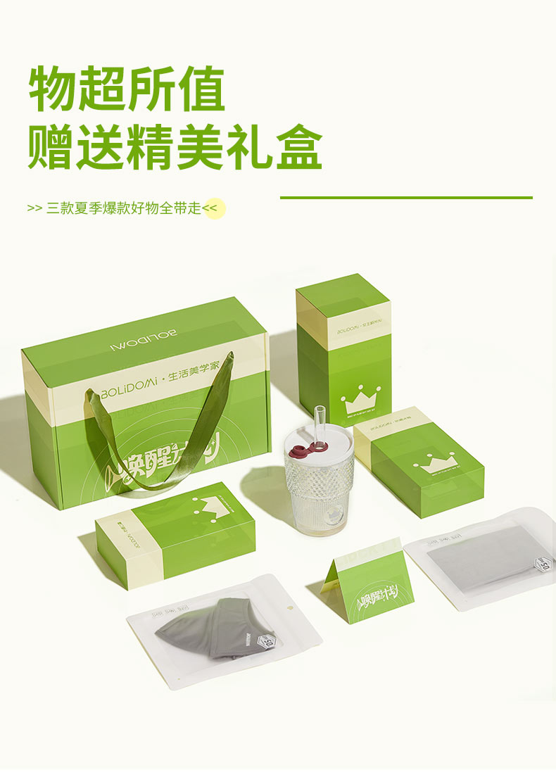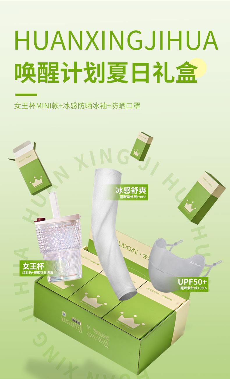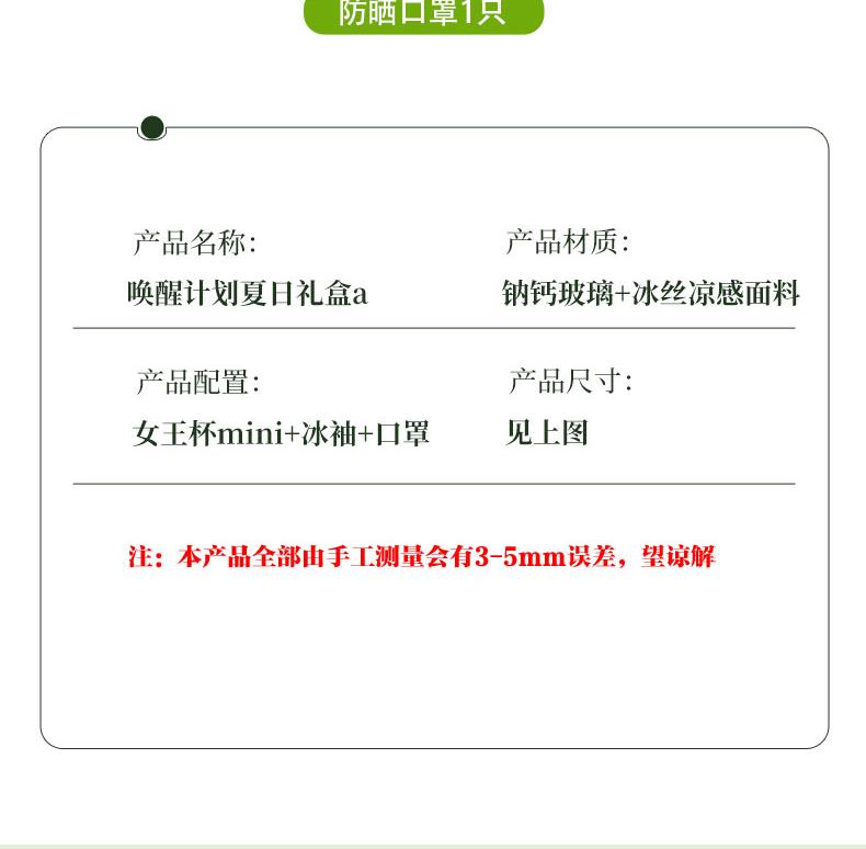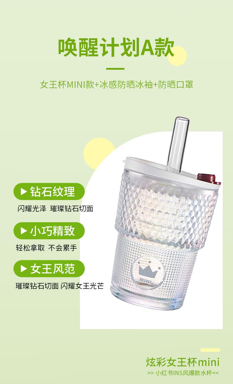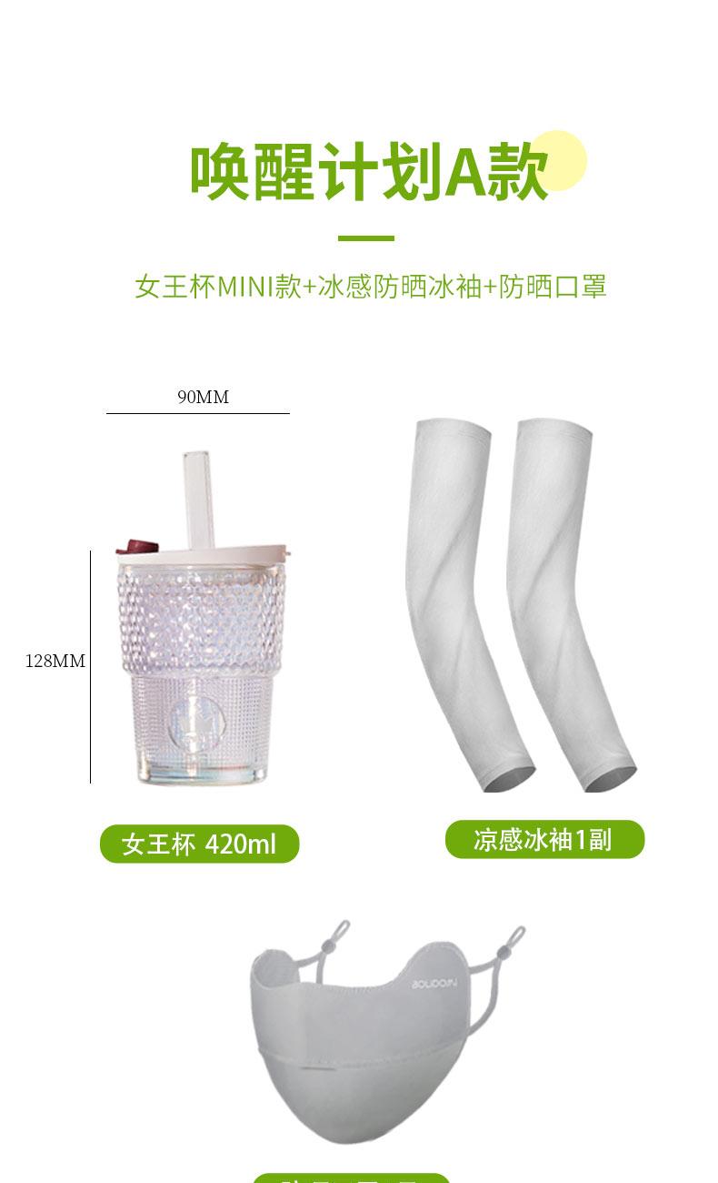 【组合】:水杯420ml*1、防晒口罩*1、防晒冰袖*1 【材质】:高白料钠钙玻璃、食品级PP、食品级硅胶、锦纶 【彩盒尺寸】:311*106*190mm 【外箱尺寸】:64*40*45cm 【毛重】:12KG 【69码】: 6972526481707 产品卖点:1、行走的钻石艺术」--INS风钻石切割纹路设计,攻克传统水杯设计同质化痛点。黄金容量攻防战:420ML「奶茶VS温水」双场景通杀,单手可握设计破解大容量水杯笨重困局。 2.蕉下同款防晒口罩【UPF50+认证>98%隔绝紫外线】 3.定制款防晒冰袖【UPF50+认证>实验室级别防晒体验】
