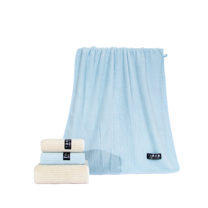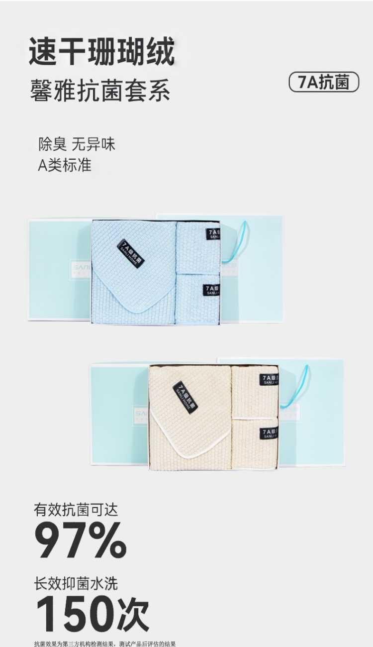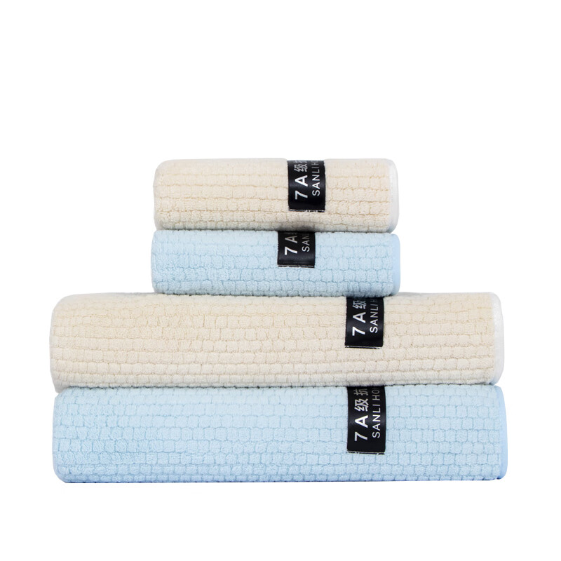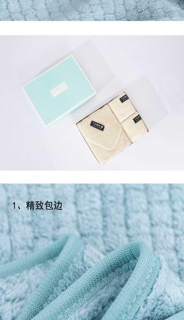 型号:G8110 G3110 材质:珊瑚绒 规格:35*76、70*140cm 克重:55g 200g 颜色:米色 蓝色 组合方式:毛巾两条浴巾一条 箱容:20盒/箱 条形码:6933720438515 珊瑚绒提花工艺,立体图案。云柔亲肤,像绒毛动物一样柔软,呵护娇嫩肌肤。8瓣核“芯倍增吸水力,借助毛细管芯吸效应:增大纤维接触面积,达成吸汗速干效果,亲肤更放心