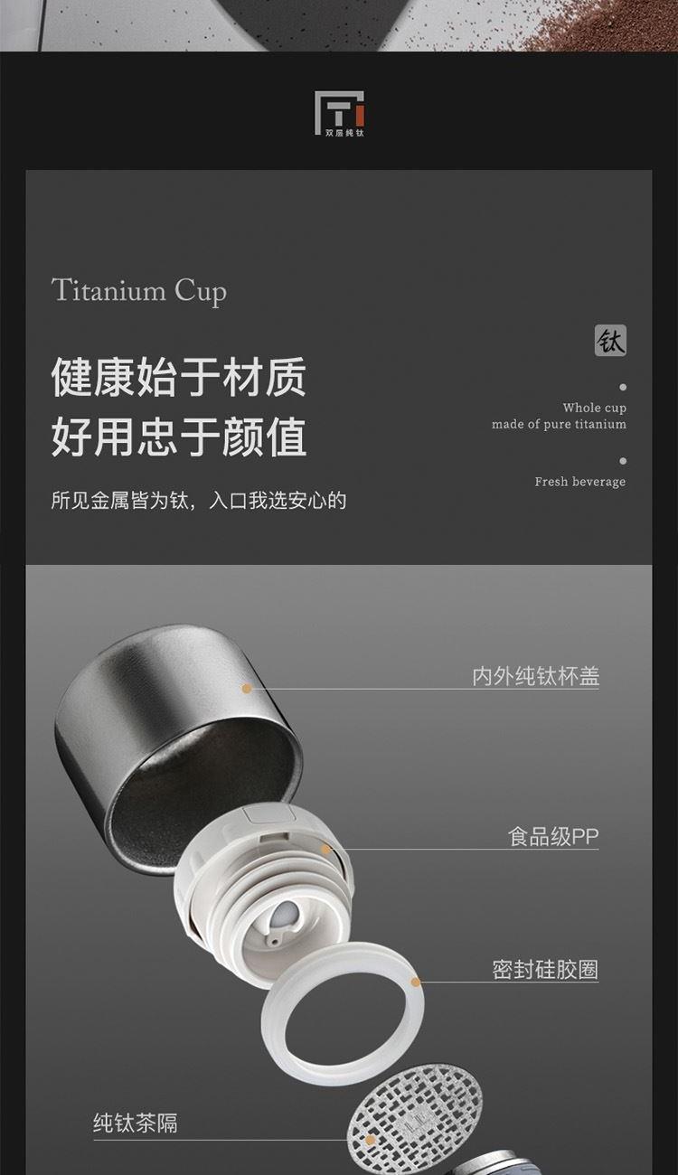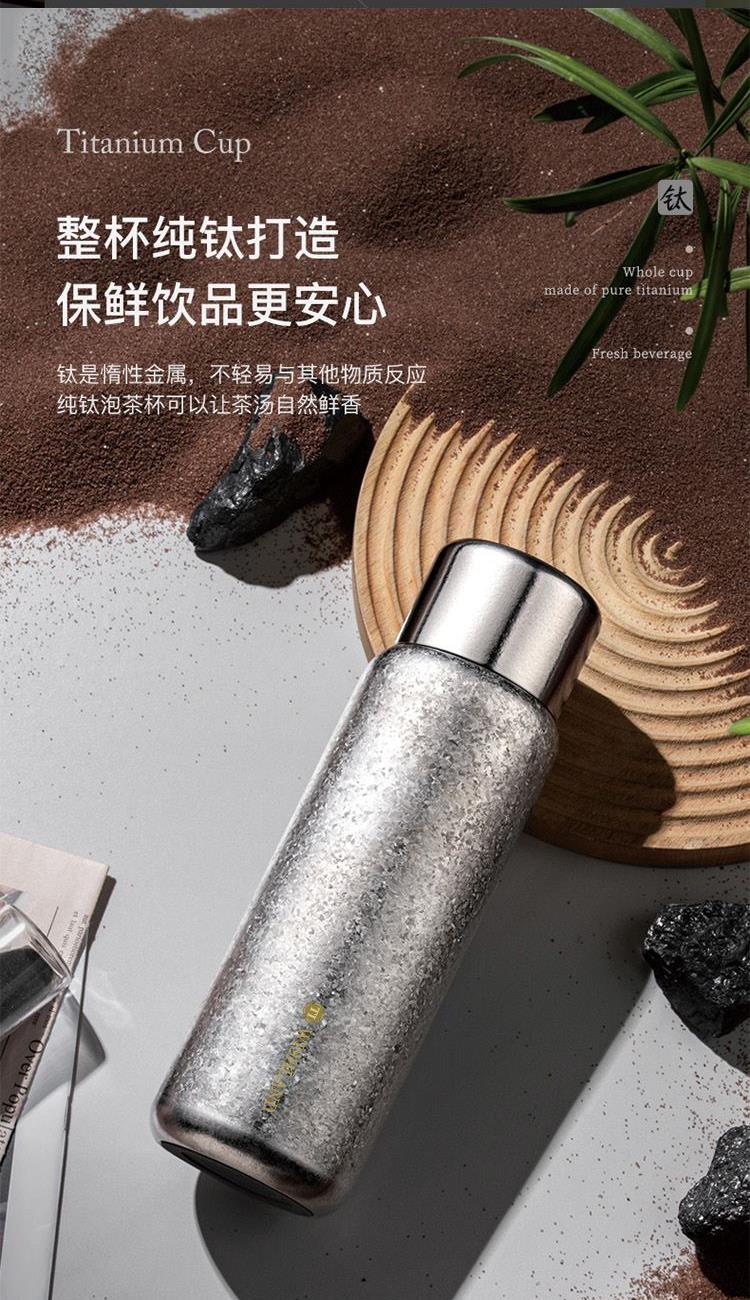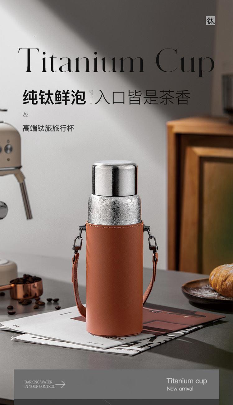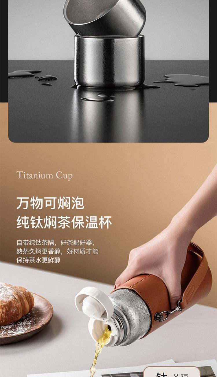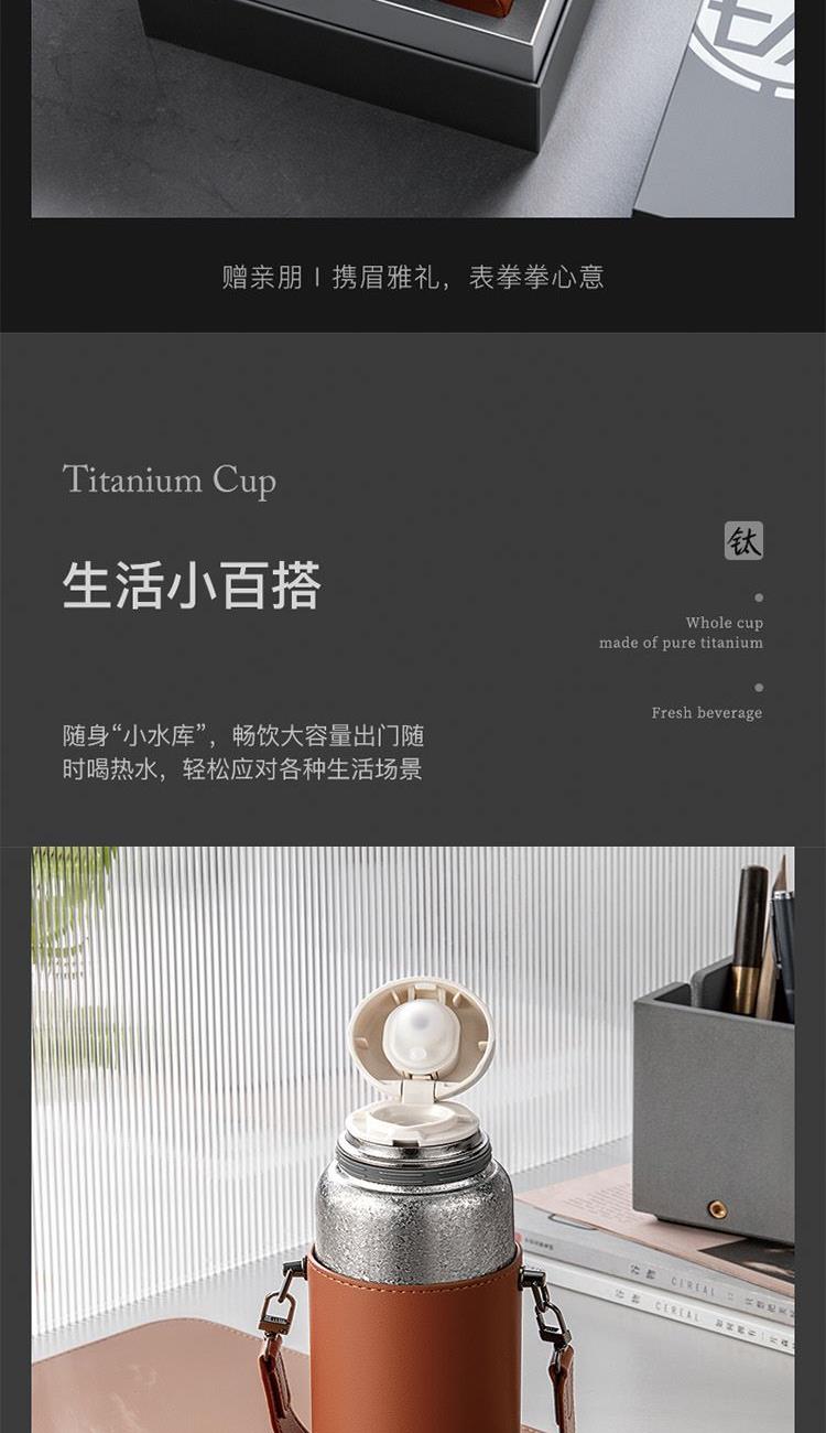 产品参数:1、产品容量:450ml 2、材质:内外纯钛 3、产品净重:247g±10g 4、包装标准:大/小礼盒+礼袋 5、颜色:皓月银、冰川蓝 6、尺寸信息:高:20cm,直径7.5cm 产品特点: 1、整杯纯钛打造,保鲜饮品更安全;2、一键按压开关,轻松畅快补水;3、倒饮、直饮两种饮水方式,饮水不受限,开启趣味饮水时刻; 4、自带纯钛茶隔,熟茶久焖更香醇; 5、精致皮革杯套,可拎可背,出街必备。