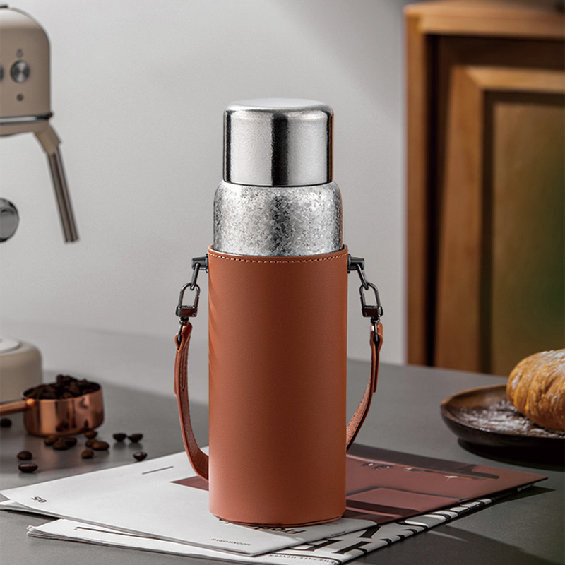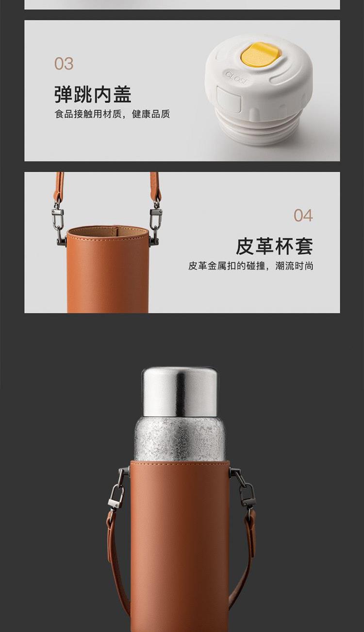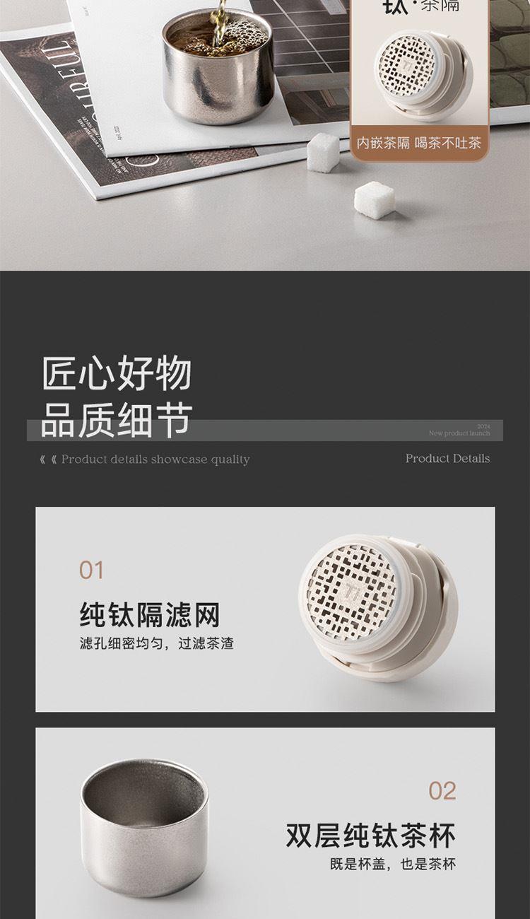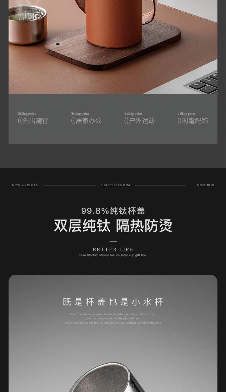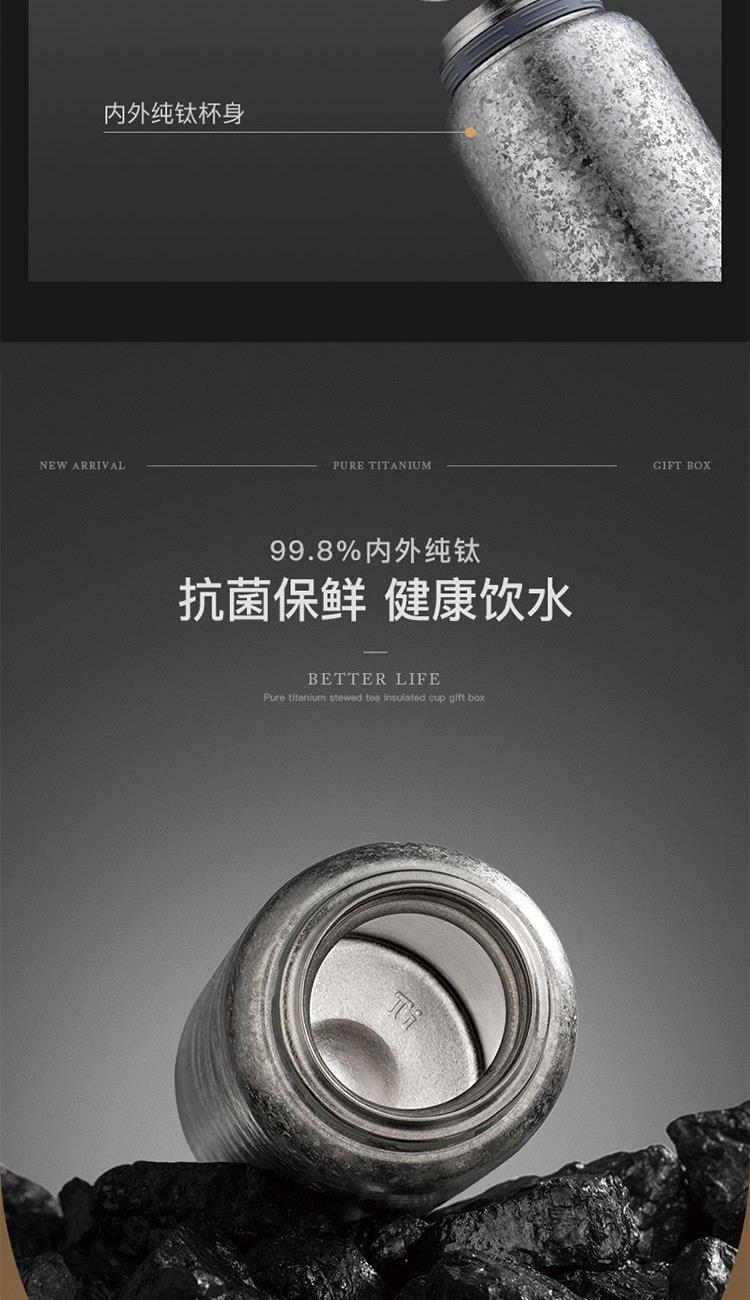 产品参数:1、产品容量:450ml 2、材质:内外纯钛 3、产品净重:247g±10g 4、包装标准:大/小礼盒+礼袋 5、颜色:皓月银、冰川蓝 6、尺寸信息:高:20cm,直径7.5cm 产品特点: 1、整杯纯钛打造,保鲜饮品更安全;2、一键按压开关,轻松畅快补水;3、倒饮、直饮两种饮水方式,饮水不受限,开启趣味饮水时刻; 4、自带纯钛茶隔,熟茶久焖更香醇; 5、精致皮革杯套,可拎可背,出街必备。