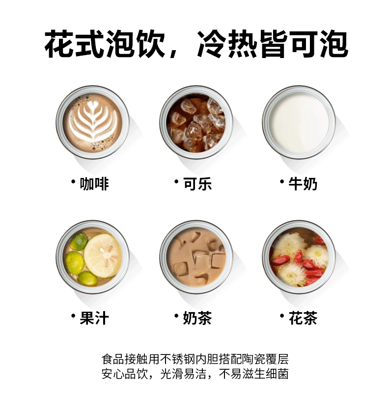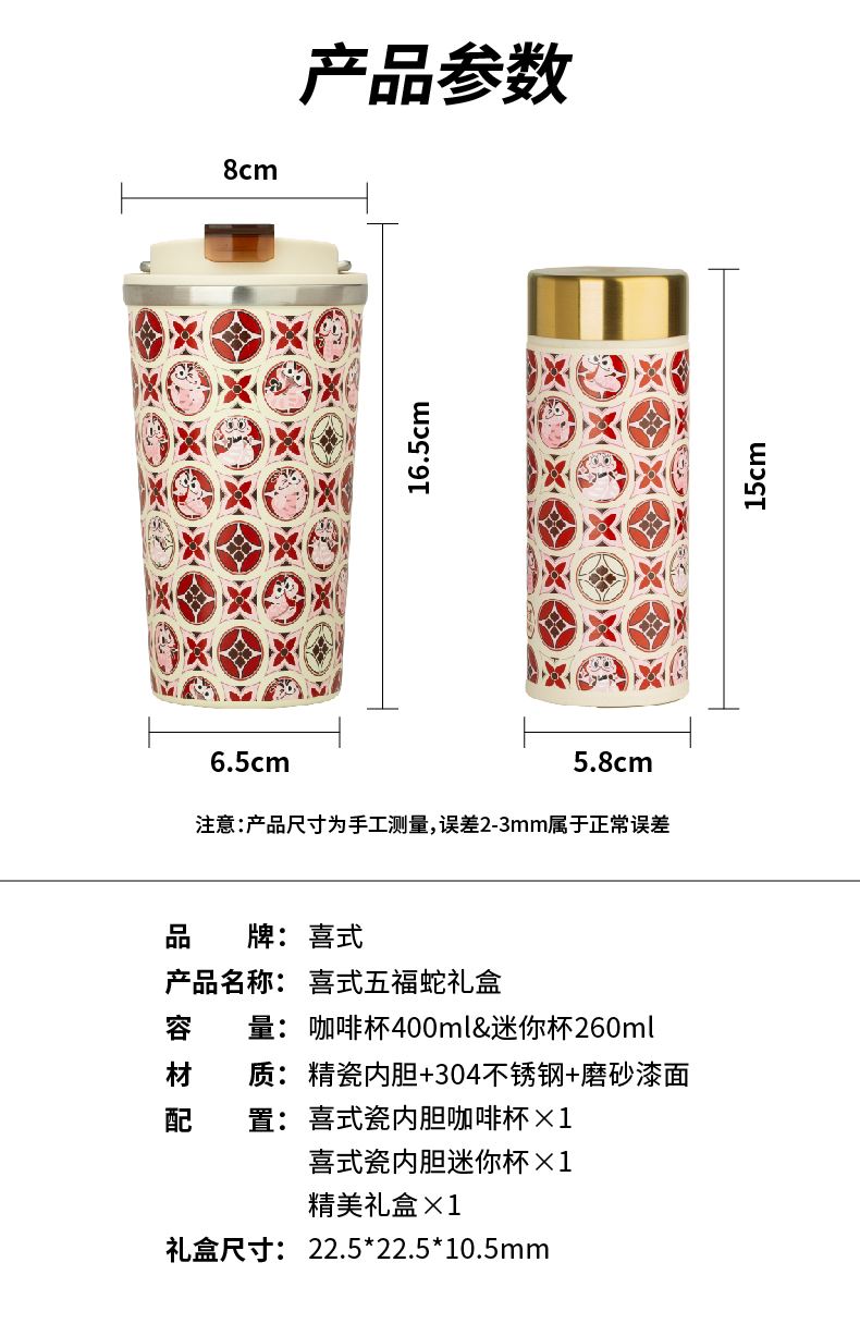 规格:咖啡杯400ml+杯保温杯260ml 精品套装组合 1.黑科技陶瓷内胆:无金属异味 保温 锁鲜 耐酸碱,冷热酸甜都不惧怕 2.百搭魔法杯:咖啡、红茶、果汁、牛奶、都可泡 3.瓷内胆,不易留茶垢,方便清洗更省心 4.使用新型3D喷墨印刷技术,展现凹凸立体质感,将颜色和细微图案一层一层精心的重叠,再现图案的触感 5.杯盖有隐形拉手,出门一提就走 6.硅胶杯垫,既防滑耐磨又静音,有效保护杯底,车载不怕洒水