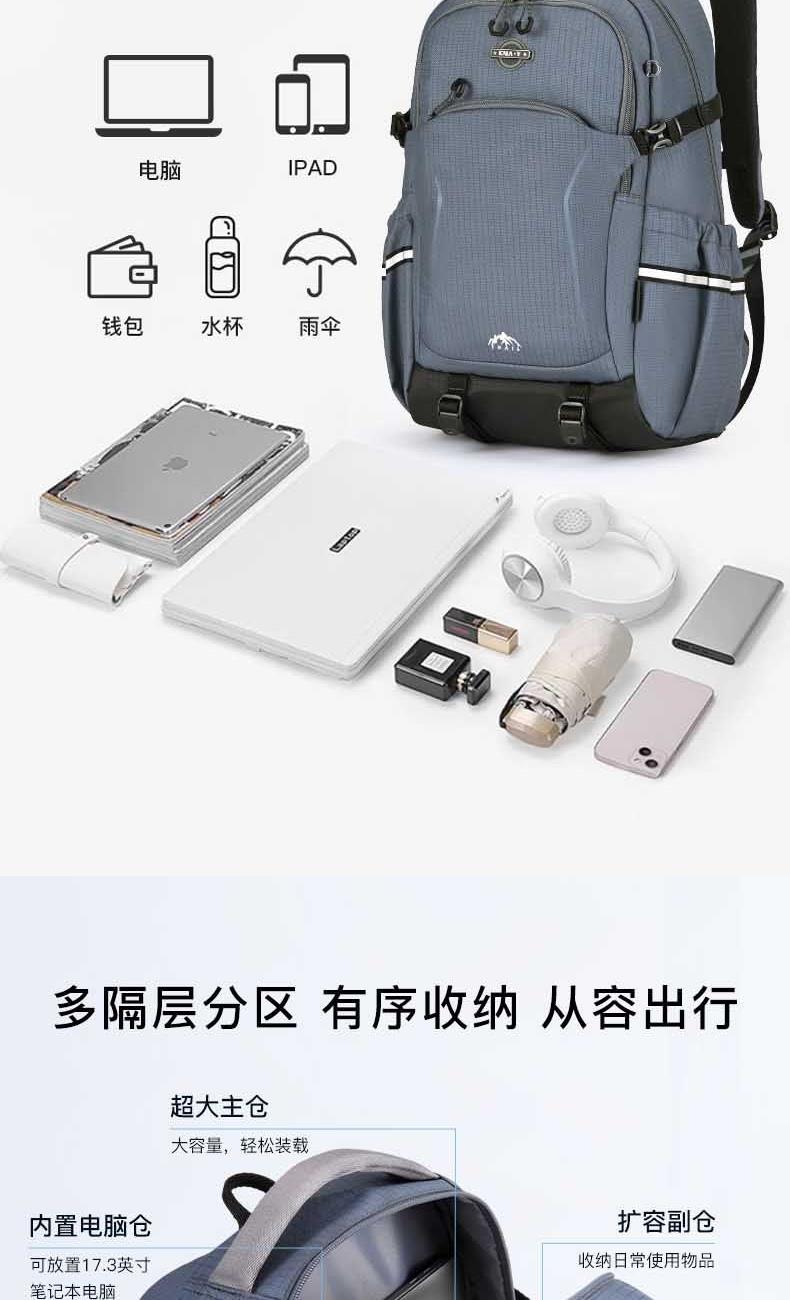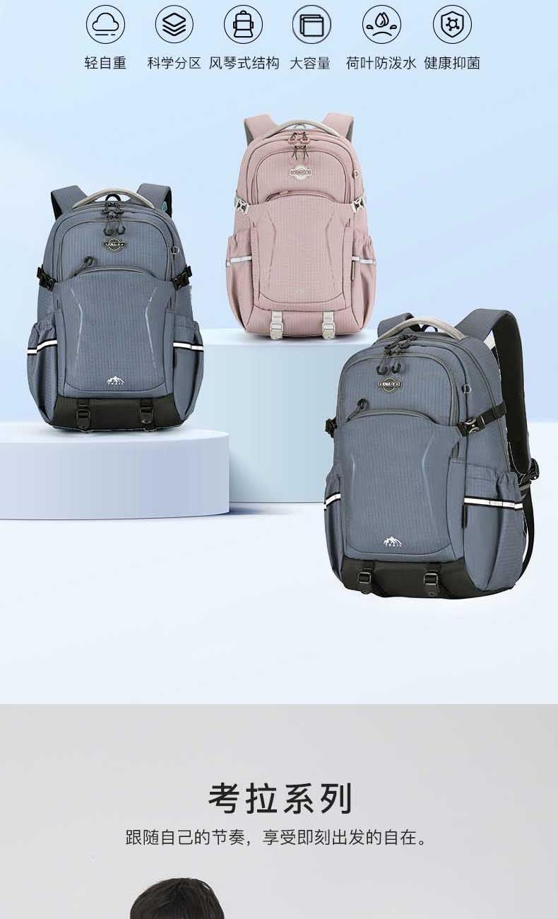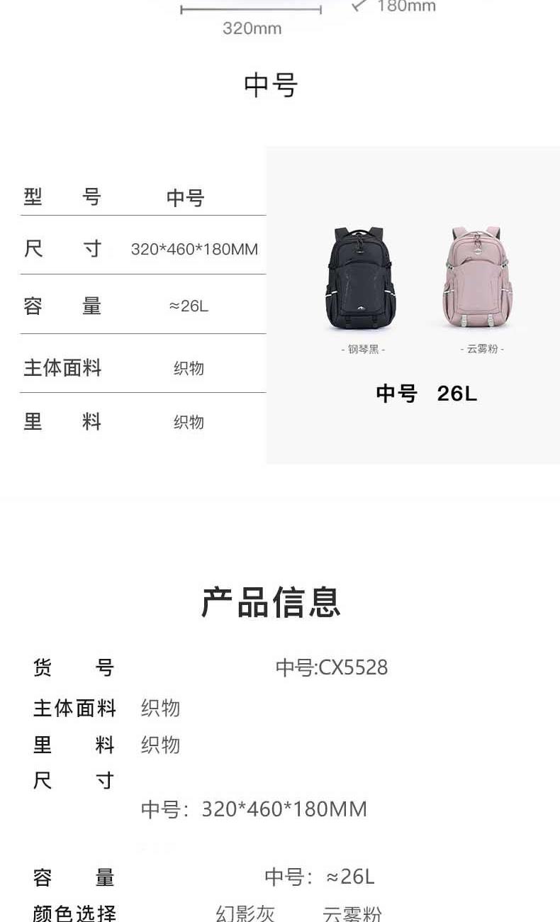 货号:CX5528 主体面料:织物;里料:织物 颜色: 幻影灰 定位:165CM以上/ 休闲双肩包 净重:0.74kg 26L