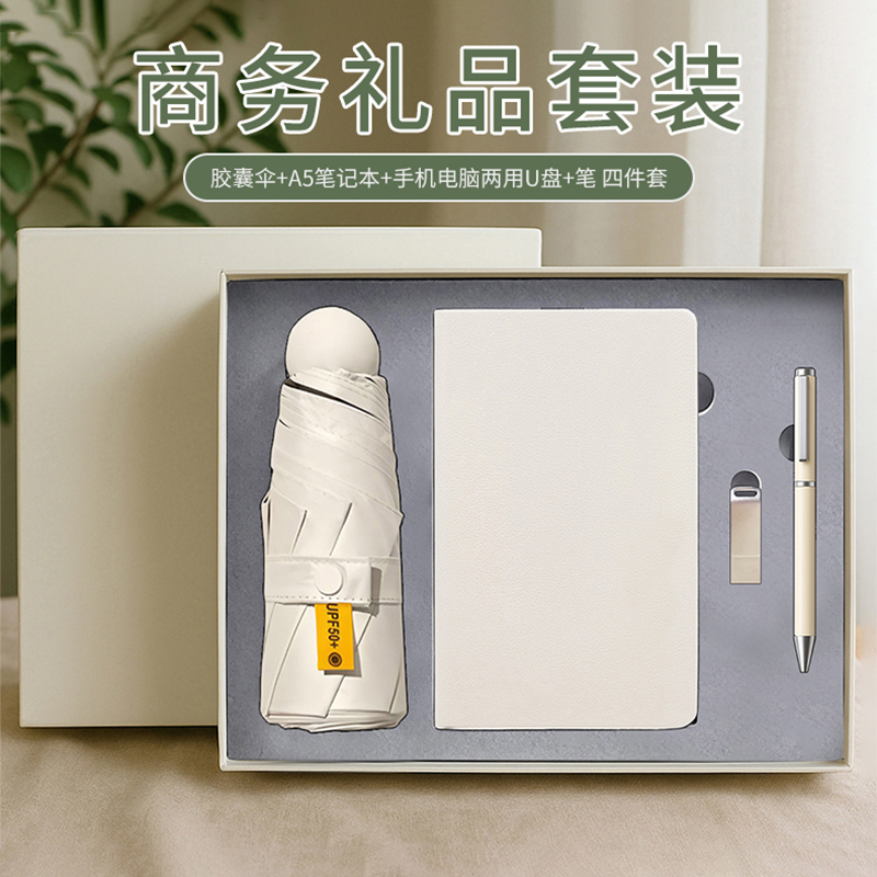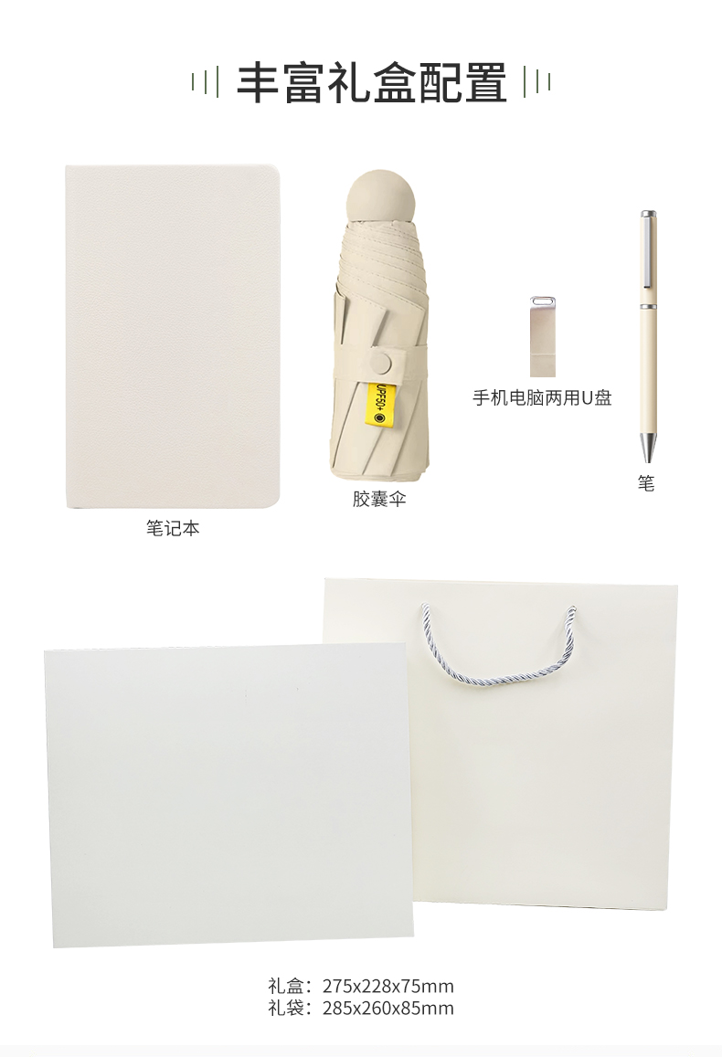 礼盒配置: 1、A6硬皮PU笔记本 2、金属烤漆笔 3、旋转手机电脑两用16G U盘(Type-C/USB) 4、21寸5折6骨钢胶囊伞(高密度碰击黑胶布) 5、包装盒尺寸:275x227x75mm 6、手提袋尺寸:286x260x85mm 7、颜色:米白色/黑色 8、重量:25kg/箱