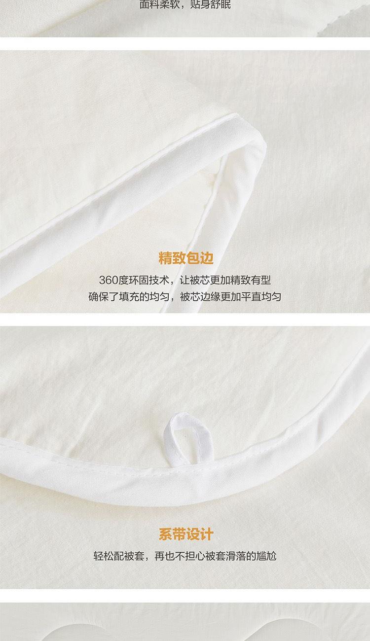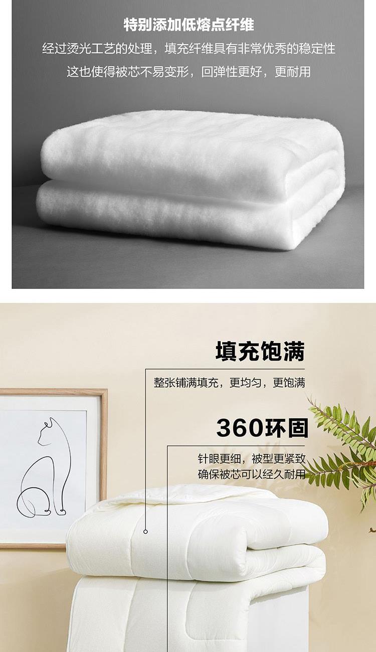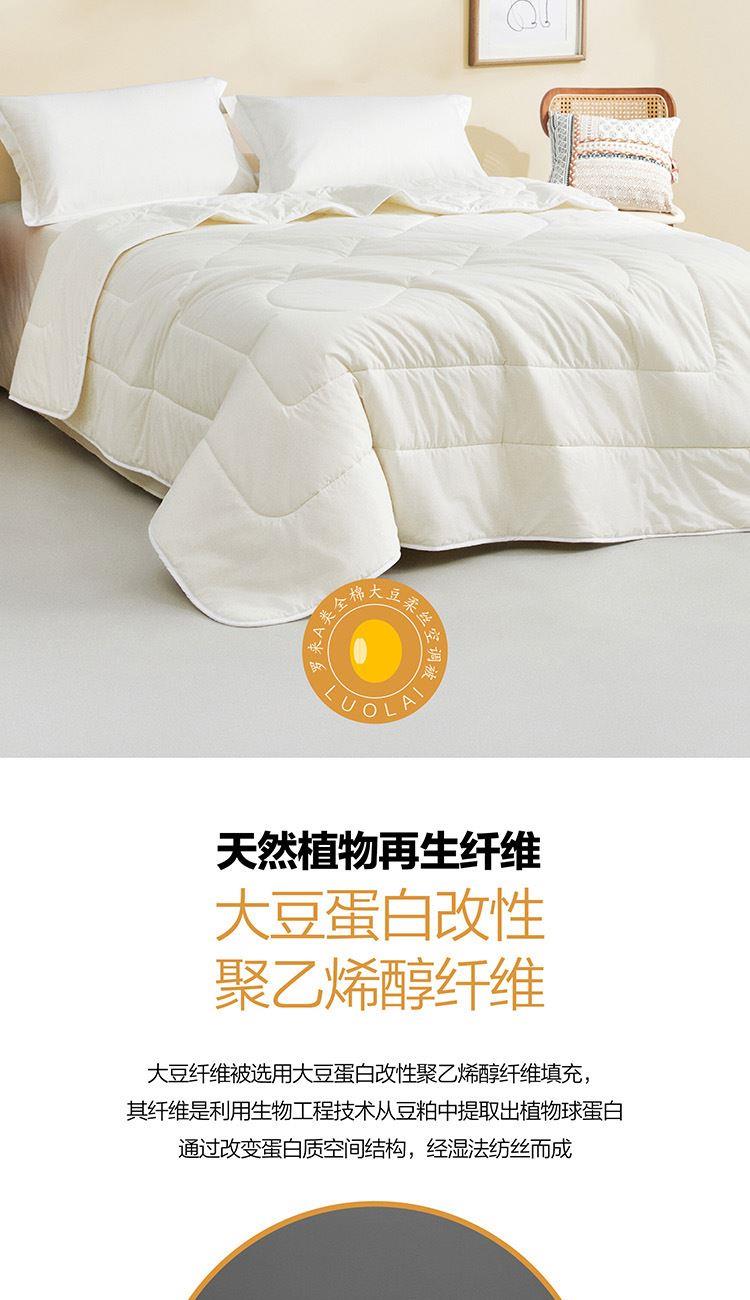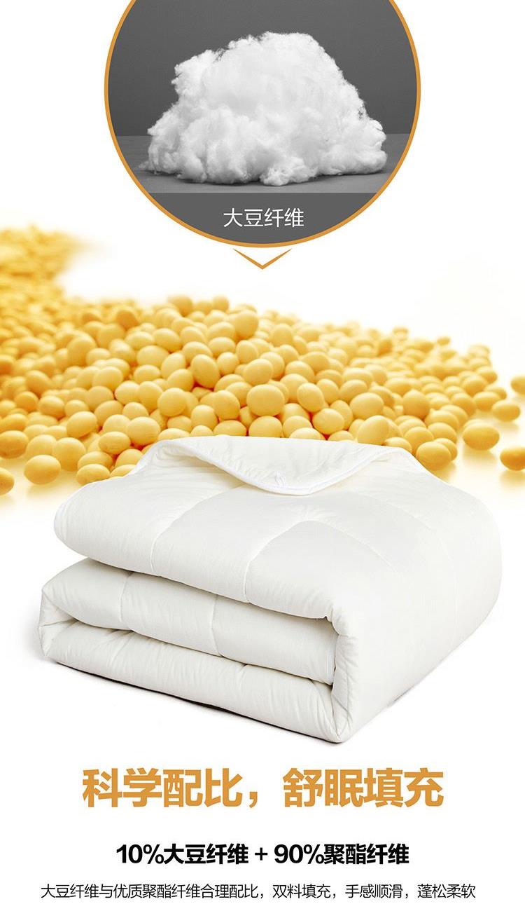 面料材质: 棉 填充材质: 聚乙烯醇+ 聚酯纤维 规格尺寸:200*230cm 填充重量:500g 外箱尺寸: 54*44*76cm 全棉水洗面料,柔软亲肤,具有良好的吸湿透气性,手洗和机洗均适宜,方便清洁: 填充大豆纤维与中空纤维黄金配比,大豆蛋白改性聚乙烯醇纤维,属再生植物蛋白纤维类,被誉为“新世纪的健康纤维”,软糯轻盈,云感舒适;