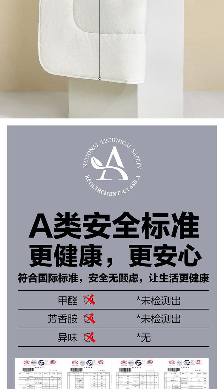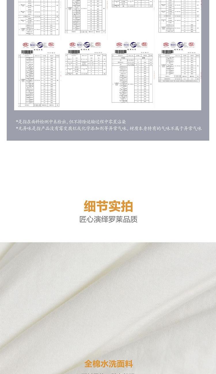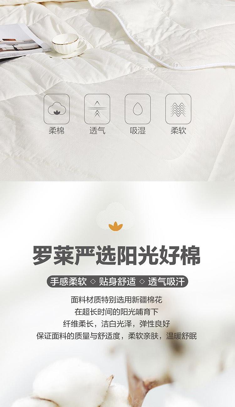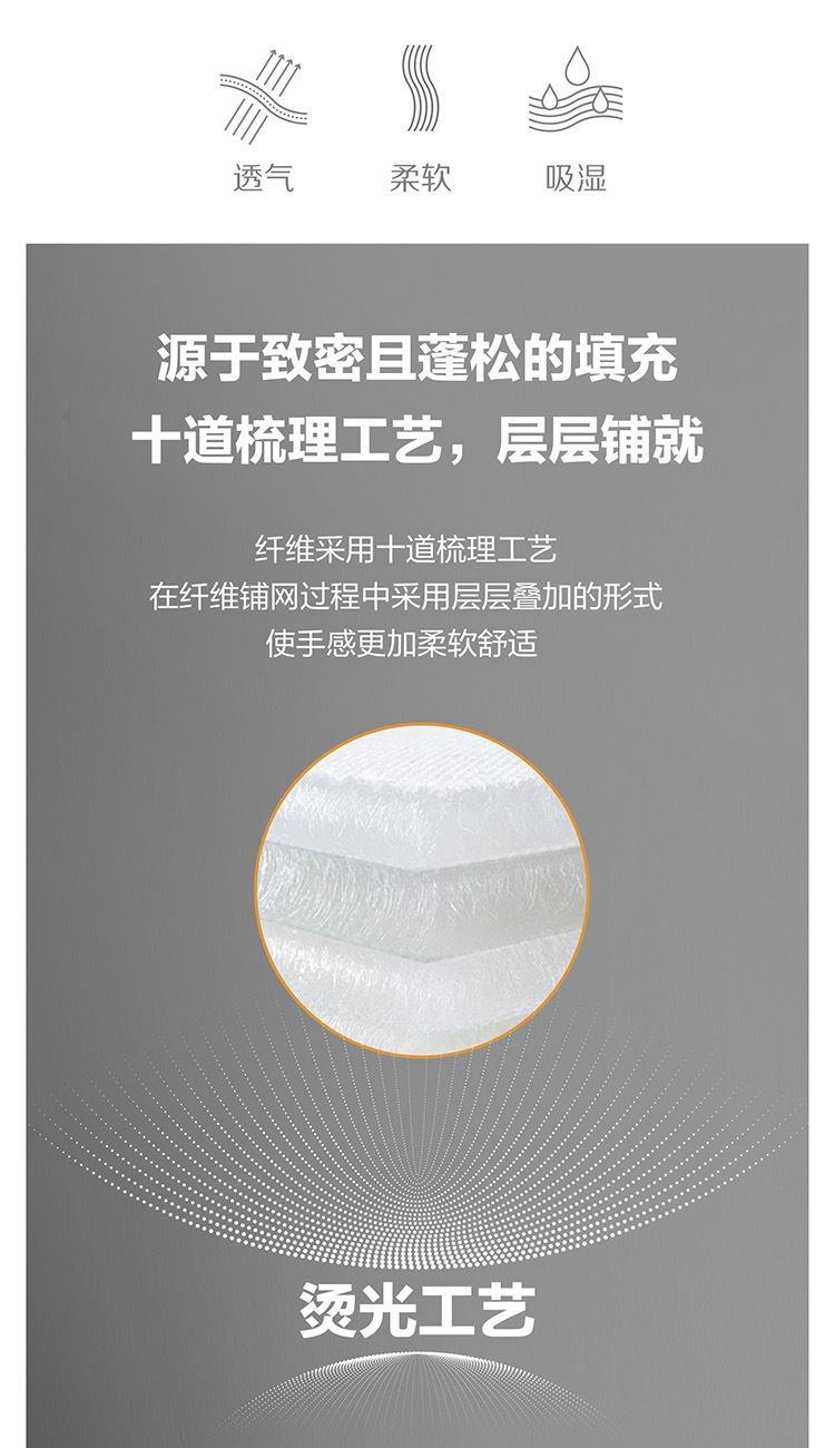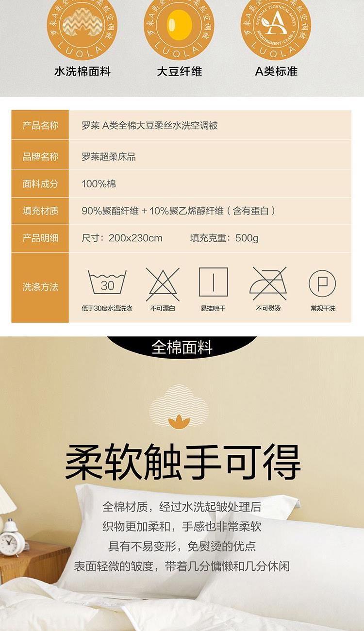 面料材质: 棉 填充材质: 聚乙烯醇+ 聚酯纤维 规格尺寸:200*230cm 填充重量:500g 外箱尺寸: 54*44*76cm 全棉水洗面料,柔软亲肤,具有良好的吸湿透气性,手洗和机洗均适宜,方便清洁: 填充大豆纤维与中空纤维黄金配比,大豆蛋白改性聚乙烯醇纤维,属再生植物蛋白纤维类,被誉为“新世纪的健康纤维”,软糯轻盈,云感舒适;