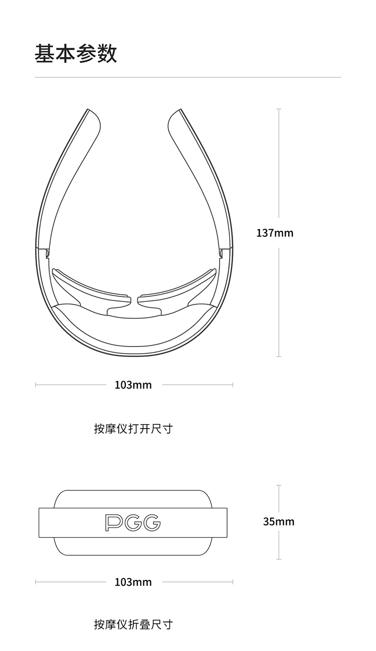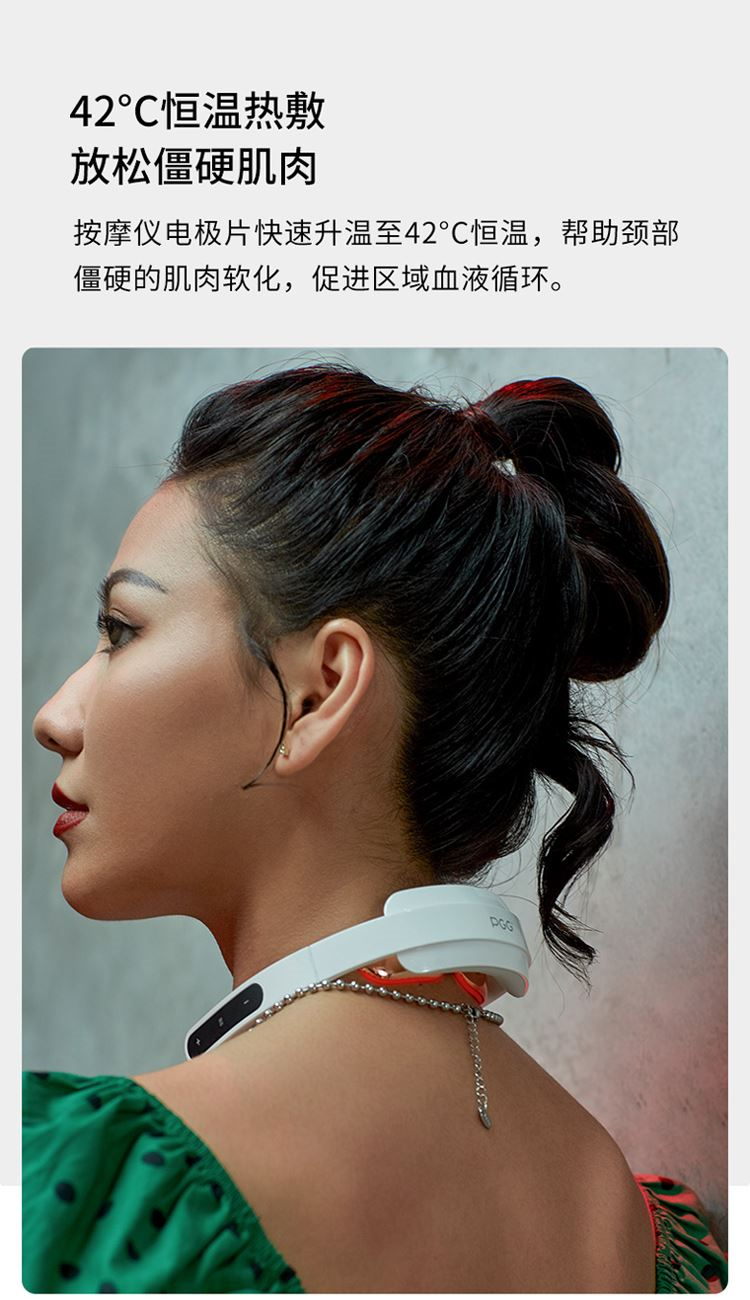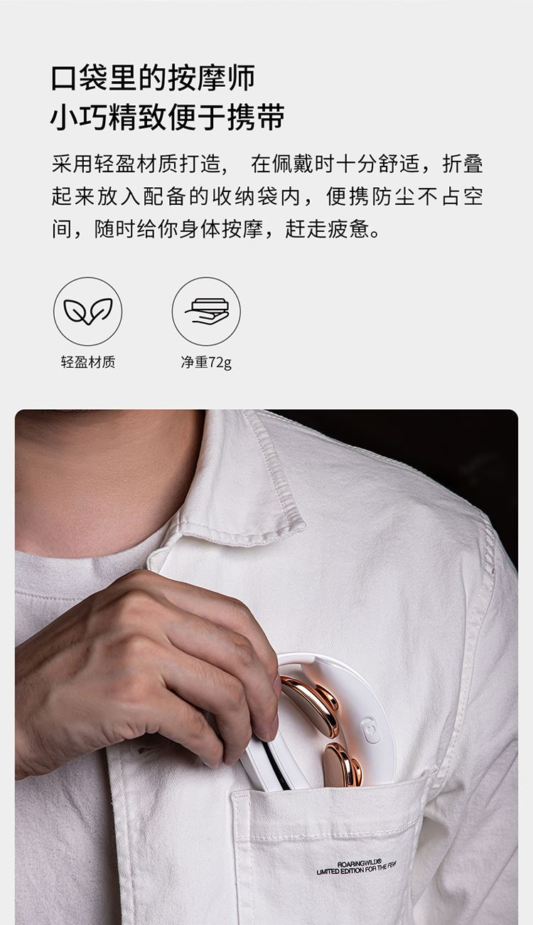产品颜色 皓月白、魅影红、深空灰、梦幻蓝 产品材质 PC/硅胶 产品重量 72g 电池容量 450mAh 充电时间 1H10min 模式调节 5种 续航时间 M1模式+1档+加热:120分钟/8次;M5模式+15档+加热:120分钟/8次 热敷温度 40~45℃ 额定输入 5V/1A 产品功能 ●可折叠易收纳肩颈按摩仪,小巧精致得可装进小包包,随身携带按摩。 ●TENS电脉冲产生刺激,舒缓颈部紧绷与劳累,快速升温至42℃,软化僵硬肌肉。 ●模拟5种仿真人按摩手法,匹配15档力度调节,满足不同按摩需求。 ●采用高韧度硅胶材料,弹性灵活,粗细脖子都可戴。 ●荣获「2021德国红点产品设计大奖」