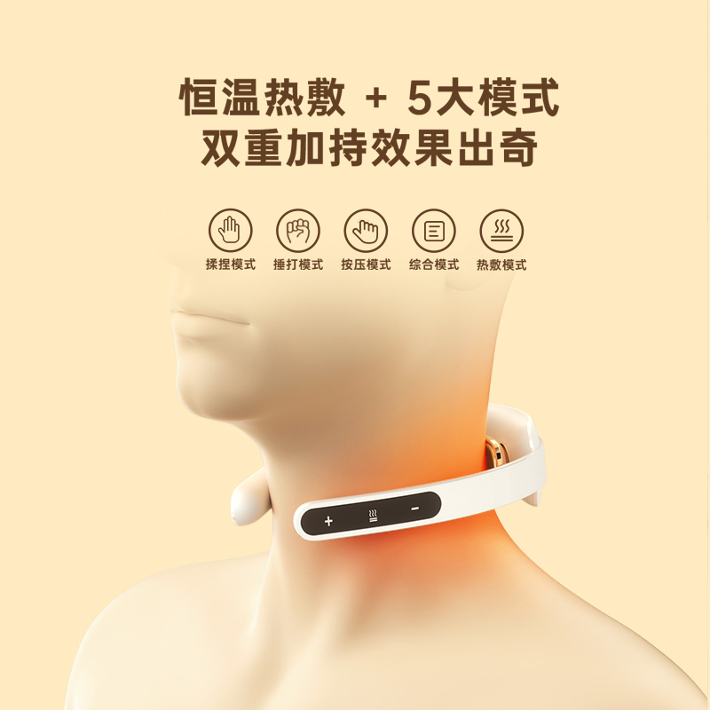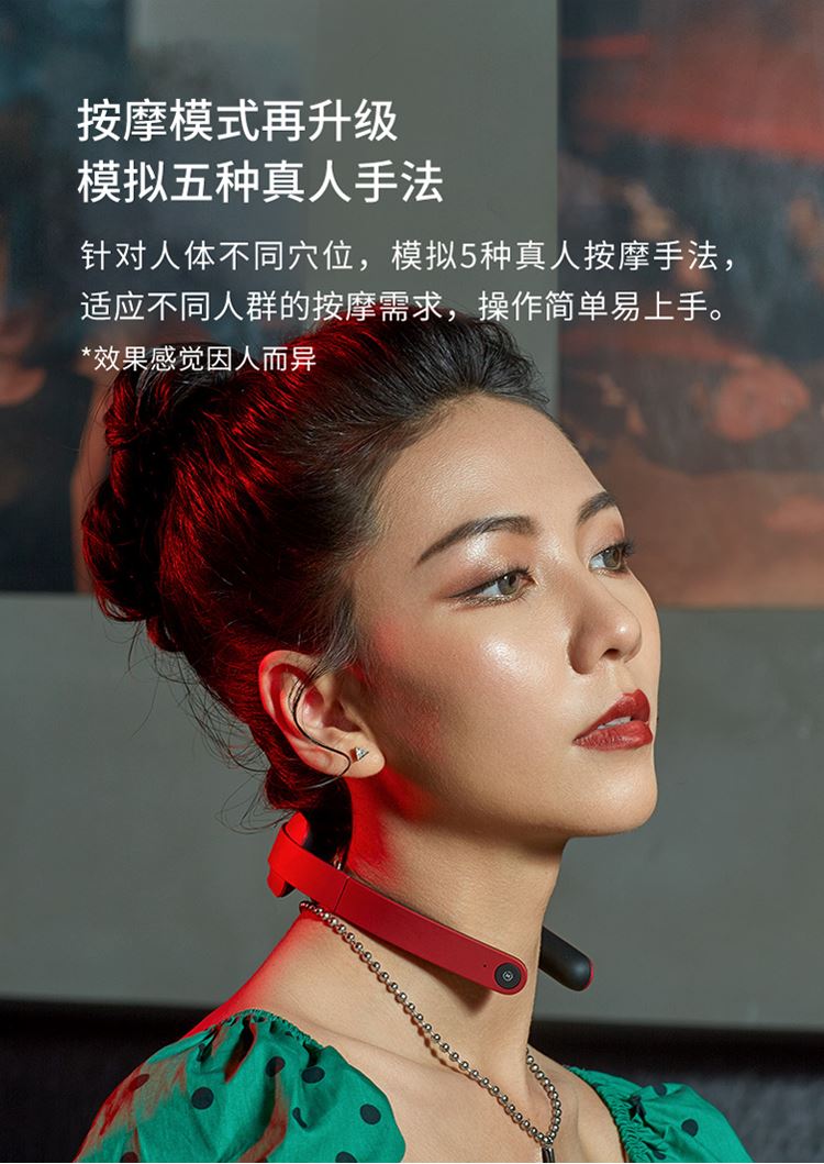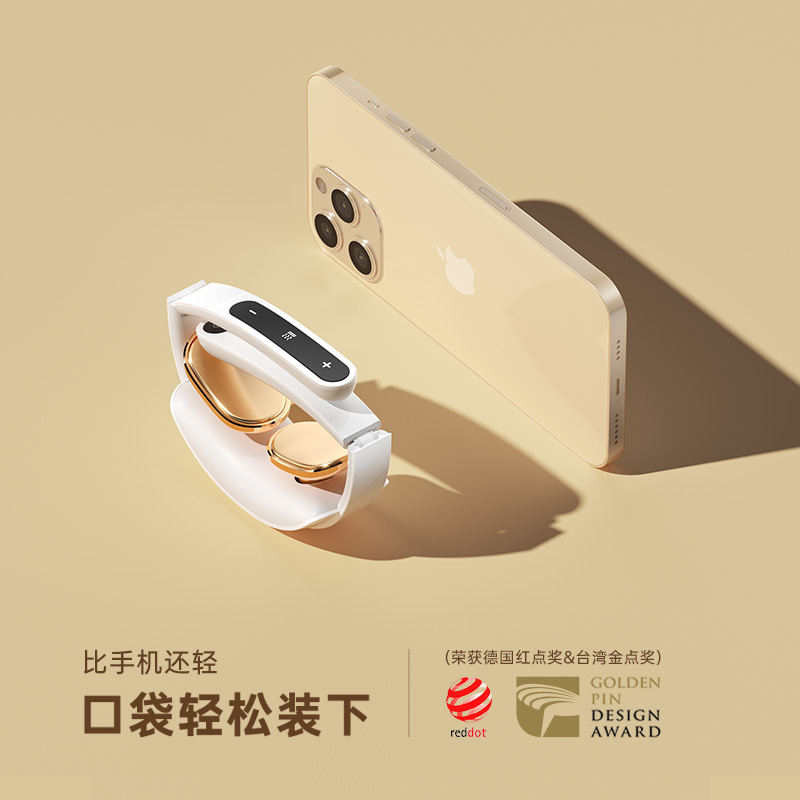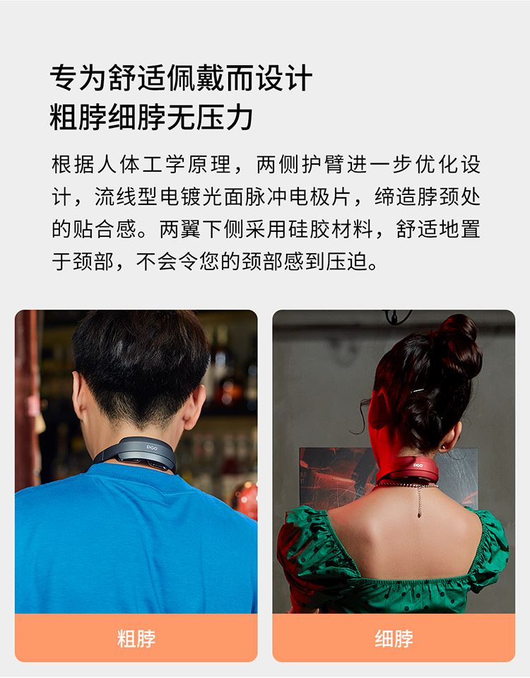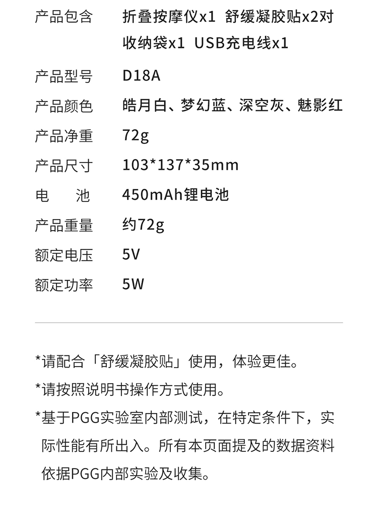 产品颜色 皓月白、魅影红、深空灰、梦幻蓝 产品材质 PC/硅胶 产品重量 72g 电池容量 450mAh 充电时间 1H10min 模式调节 5种 续航时间 M1模式+1档+加热:120分钟/8次;M5模式+15档+加热:120分钟/8次 热敷温度 40~45℃ 额定输入 5V/1A 产品功能 ●可折叠易收纳肩颈按摩仪,小巧精致得可装进小包包,随身携带按摩。 ●TENS电脉冲产生刺激,舒缓颈部紧绷与劳累,快速升温至42℃,软化僵硬肌肉。 ●模拟5种仿真人按摩手法,匹配15档力度调节,满足不同按摩需求。 ●采用高韧度硅胶材料,弹性灵活,粗细脖子都可戴。 ●荣获「2021德国红点产品设计大奖」