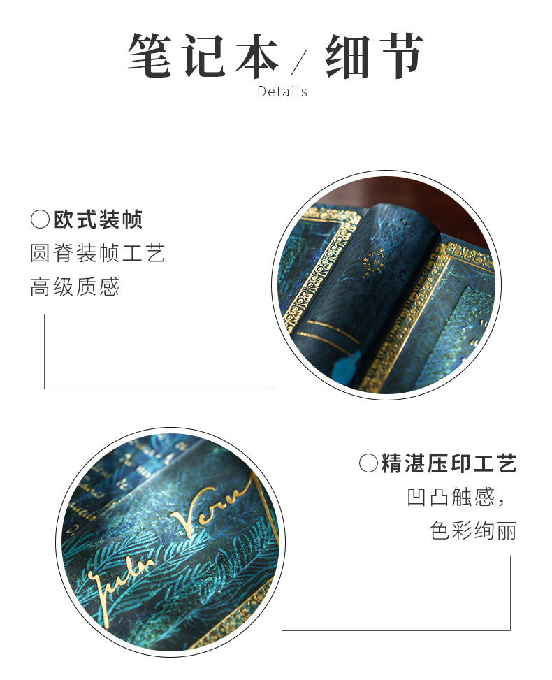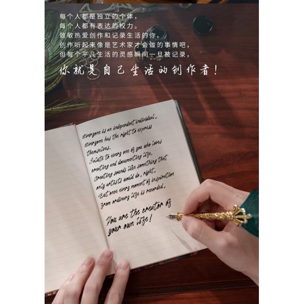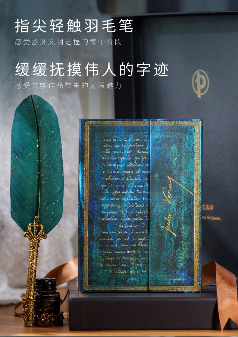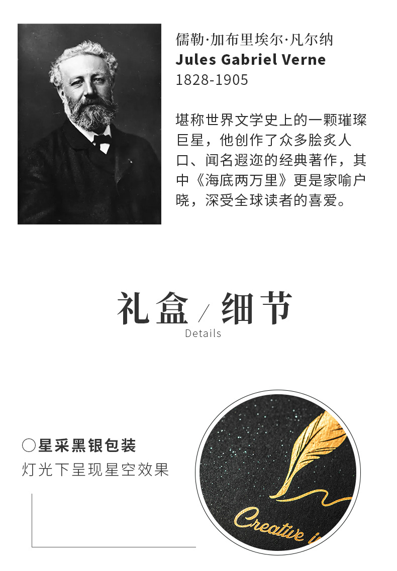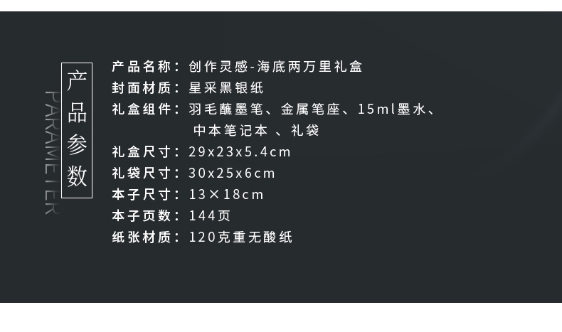 产品:海底两万里羽毛笔礼盒套装 创作灵感:封面收录了法国科幻小说家、冒险小说家凡尔纳1866年创作的长篇小说《海底两万里》手稿及签名,背面印刷着尼莫船长观察“一只巨大尺寸的乌贼”的插画。 封面材质:星采黑银纸 礼盒组件:羽毛蘸墨笔、金属笔座、15ml墨水、中本笔记本、礼袋 礼盒尺寸:290*230*54mm 礼袋尺寸:300*250*60mm 本子尺寸:125*180mm 本子页数:144页 纸张材质:120克重无酸纸