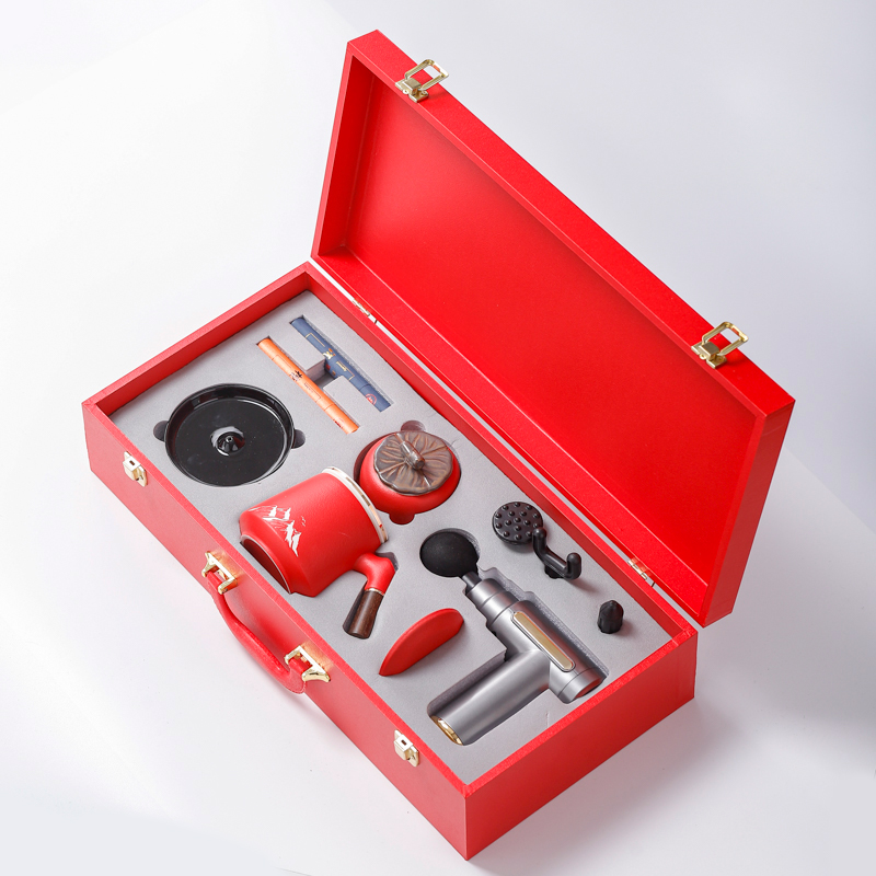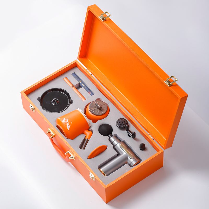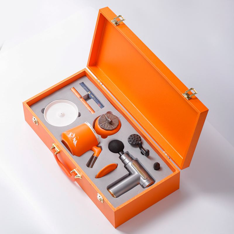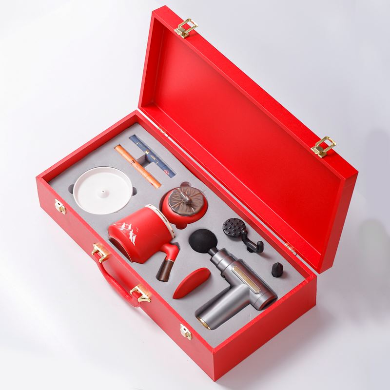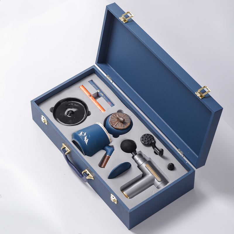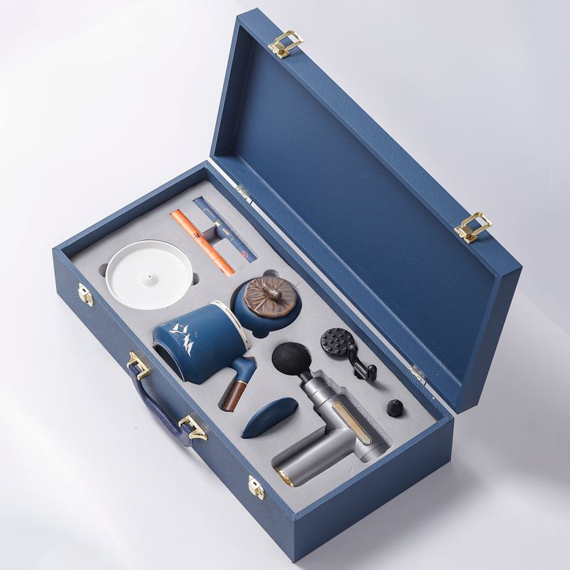 配 制: 1办公杯1筋膜枪 1香盘 2条香 1茶叶罐 锦盒 规格: 办公杯14.5*10.4cm 礼盒38.2*11cm 茶叶罐9.6*9cm 工艺:香道套装,配香盘,2条线香。专业级筋膜枪,6档变速,4种按摩头,液晶触屏,深度缓解肌肉酸胀。商务实用性礼品,上班族刚需产品。