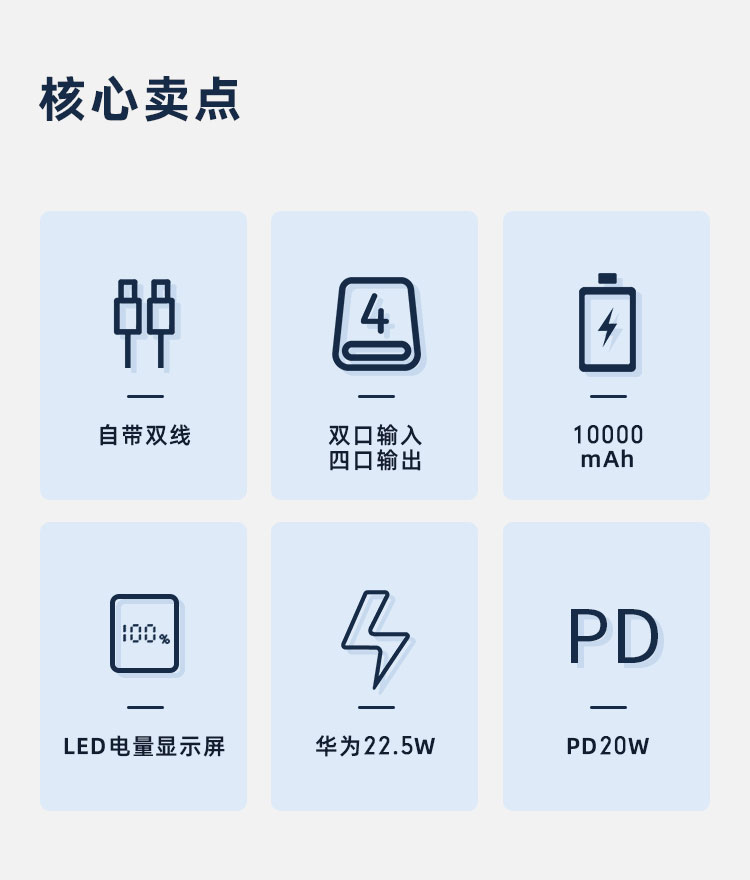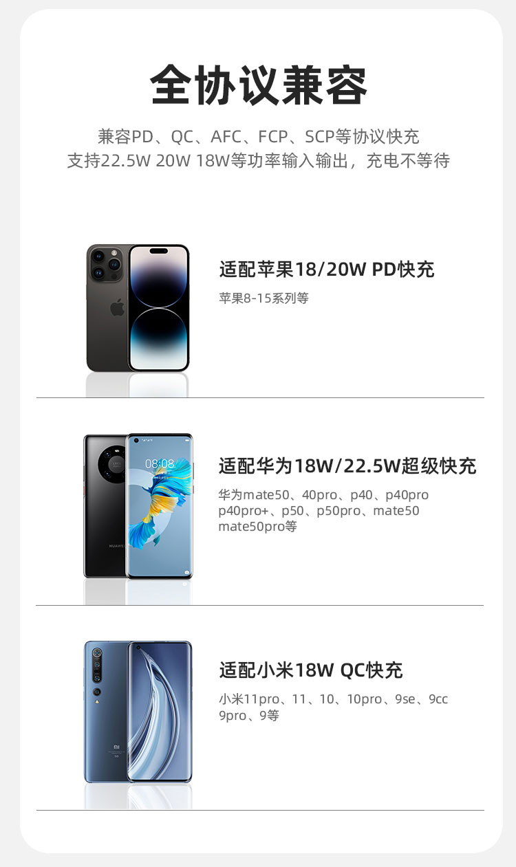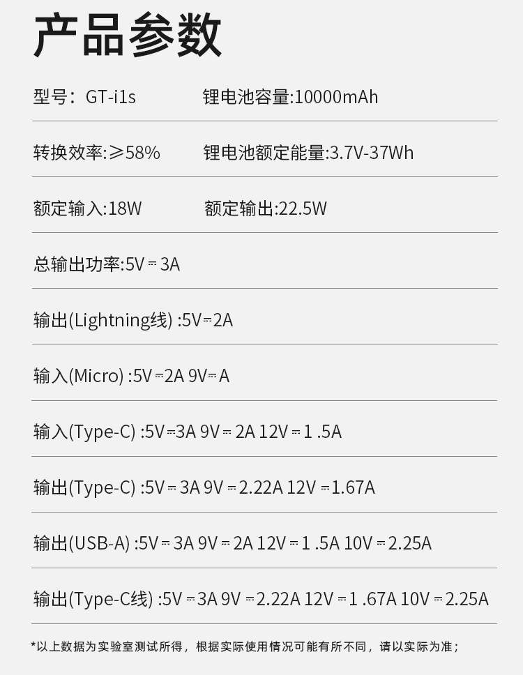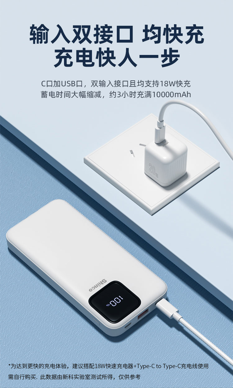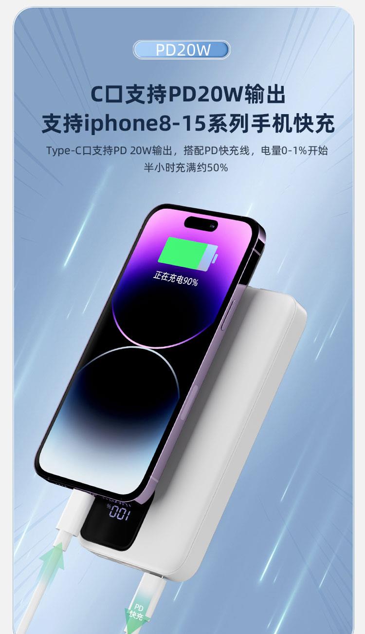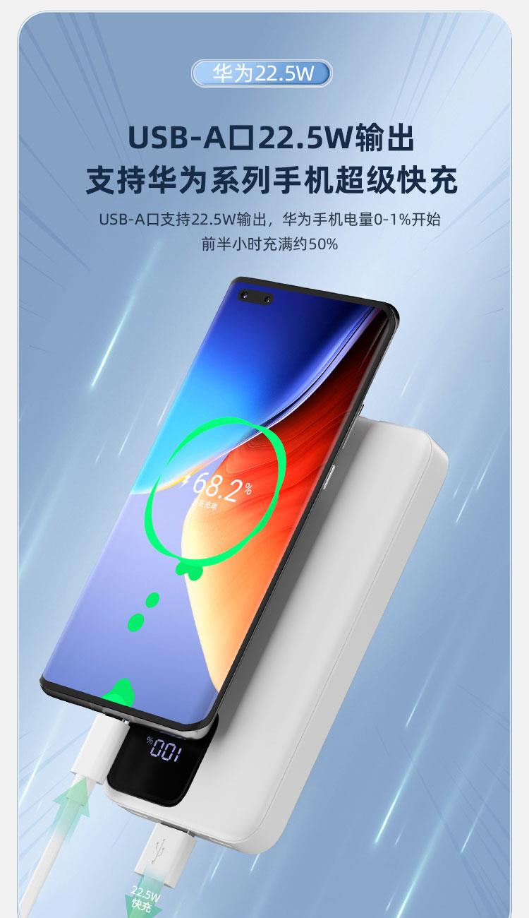 4:Type-C口支持PD 20W输出,搭配PD快充线,USB-A口支持22.5W输出