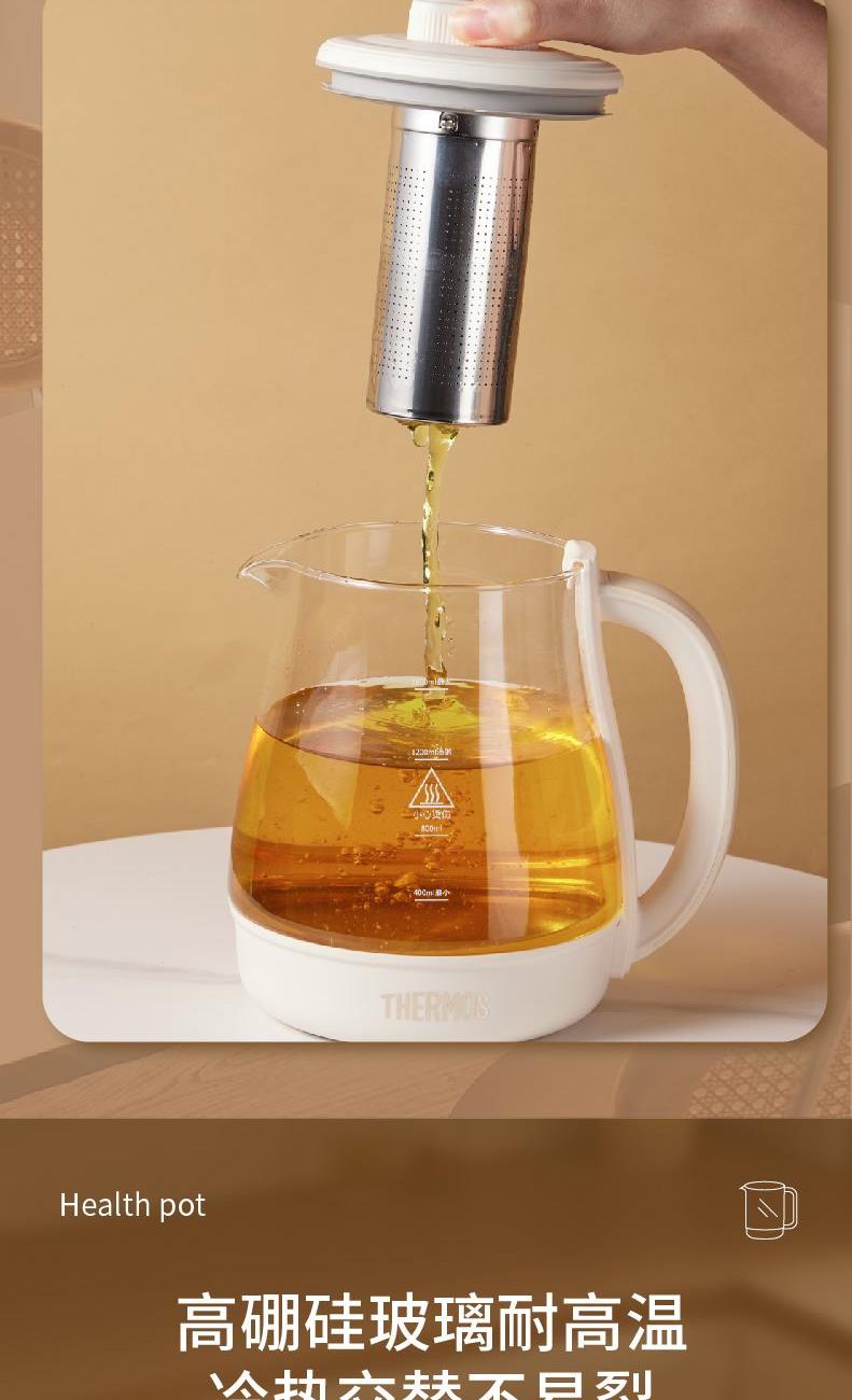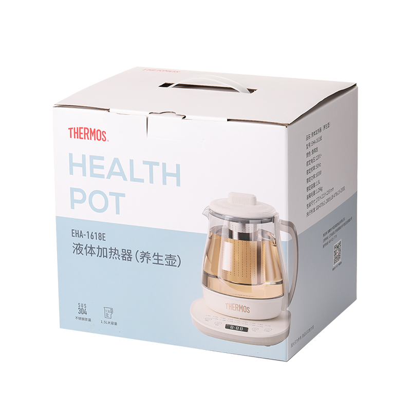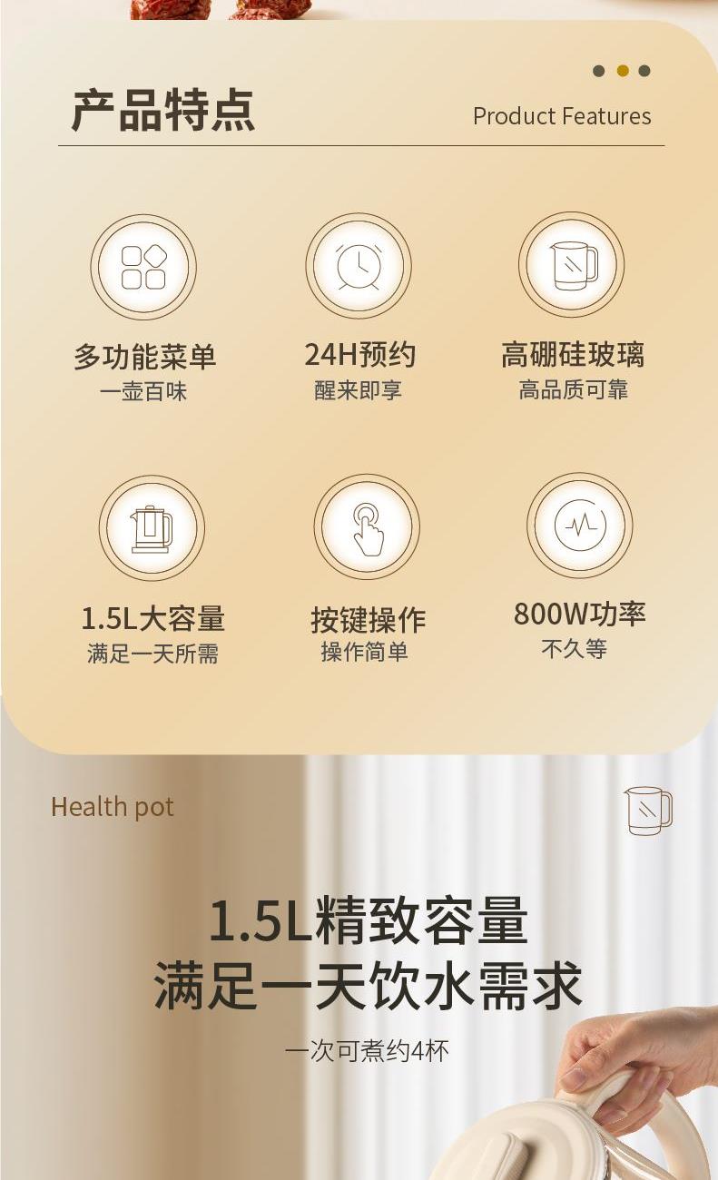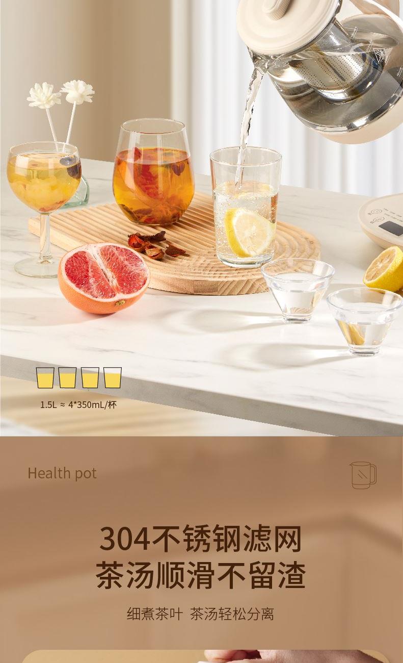 产品材质: PP+SUS304不锈钢+清光高硼硅 产品参数:额定功率:220V~50Hz 800W 产品容量:1.5L 包装尺寸:彩盒 :280*215*260 单产品重量:0.97Kg 含彩盒重量:1.3Kg 产品介绍: 1.16大菜单承包润养日常 2.1.5升容量独享分享都合适, 3.发热盘密封技术不易卡食物残渣; 4.只留茶香,不见茶渣304不锈钢滤网