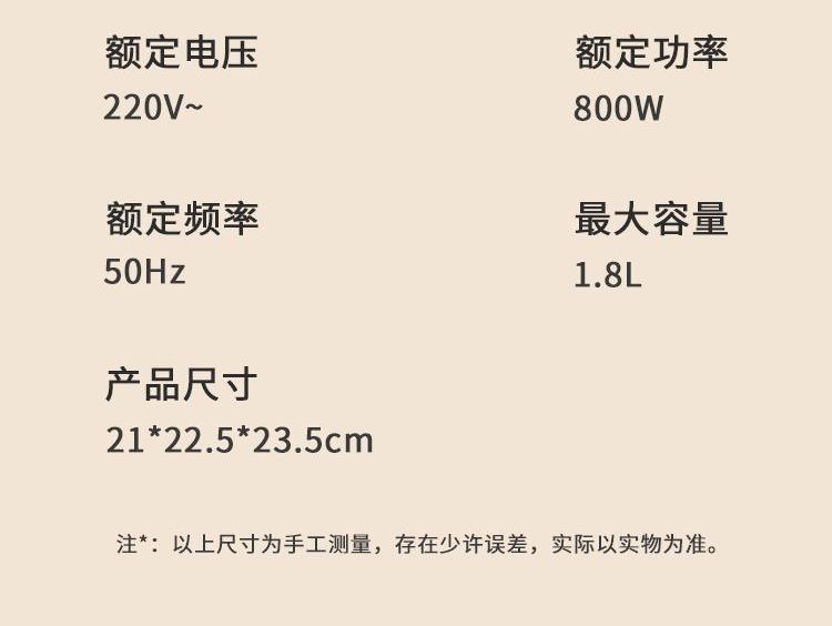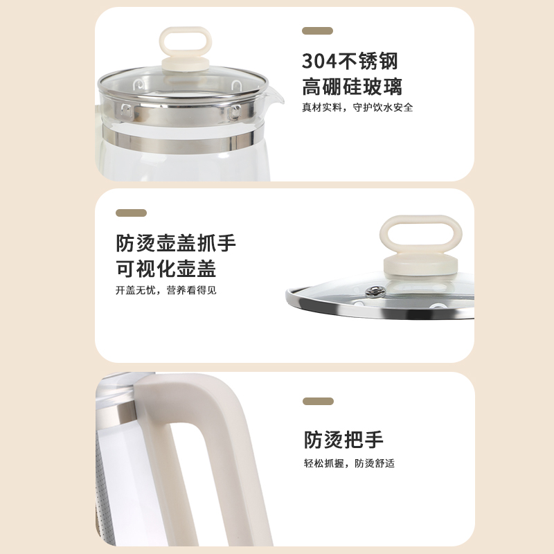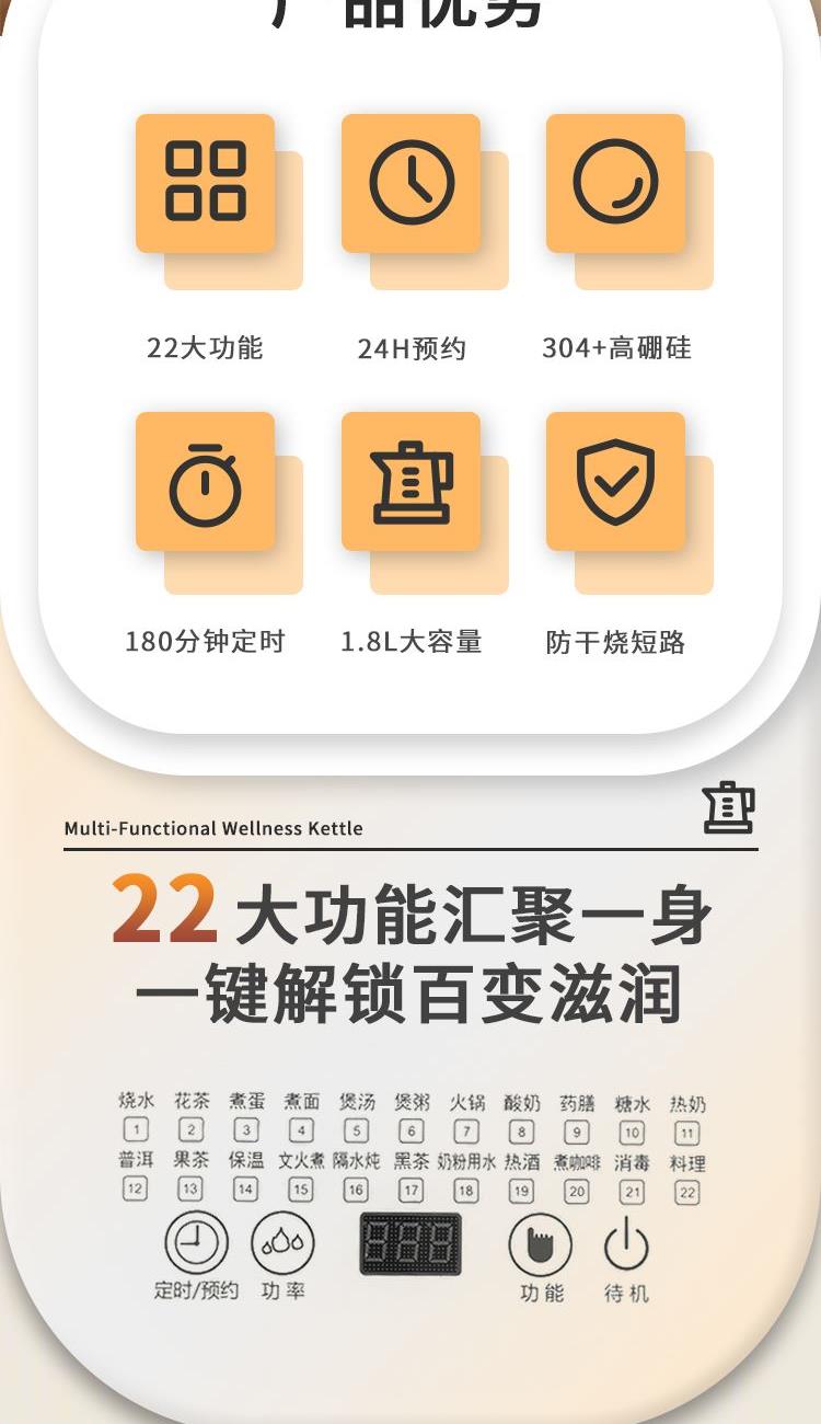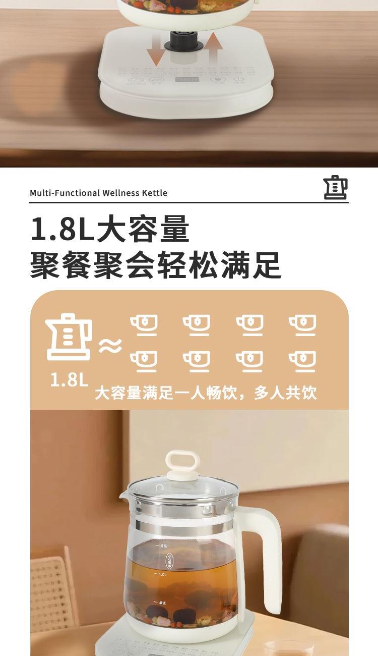 产品参数 额定电压:220V~ 额定频率:50Hz 额定功率:800W 额定容量:1.8L 产品净重:1.3kg 产品毛重:1.6kg 彩盒尺寸:290×220×265mm 产品特点 1、电子触摸式,操作简单; 2、壶身为高硼硅加厚玻璃,抗腐蚀,耐高温; 3、食品级不锈钢发热盘,耐腐蚀,安全卫生; 4、双重防干烧保护装置,干烧自动断电; 5、壶身可360度旋转; 带预约,定时功能; 6、22种功能选择。