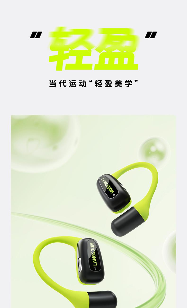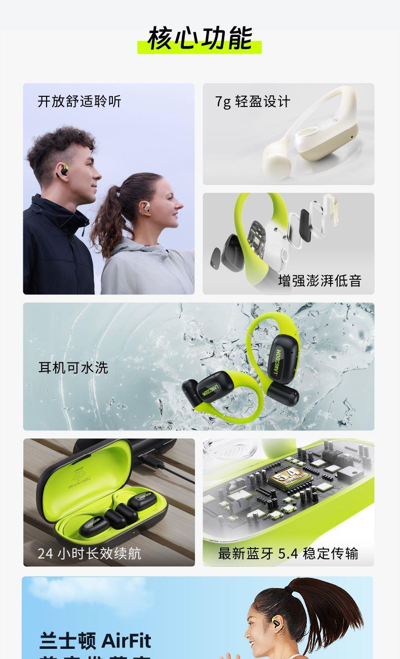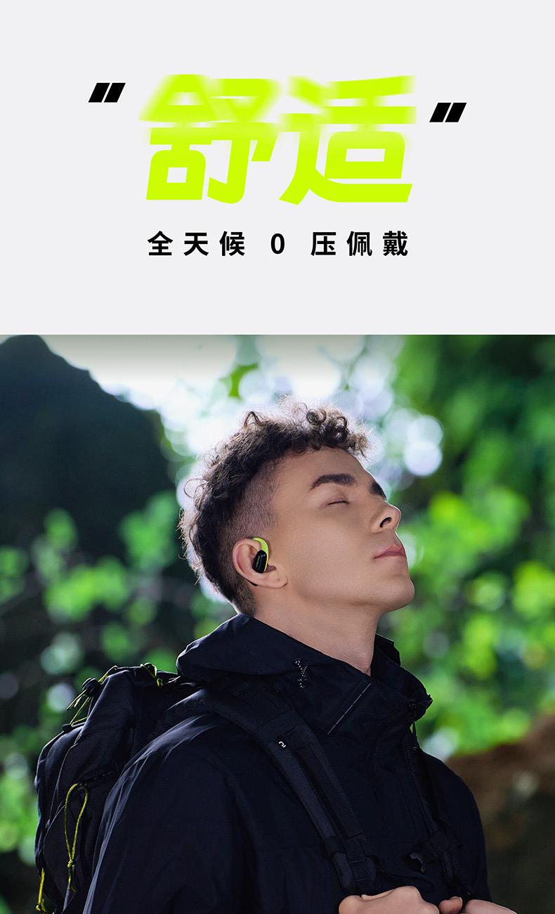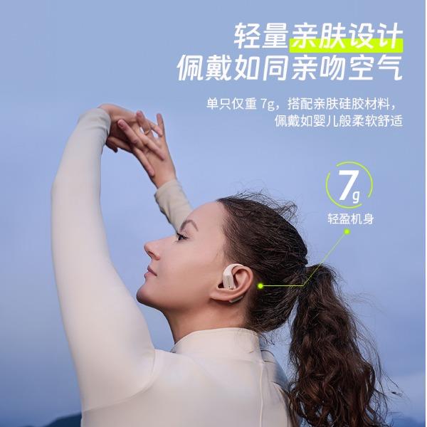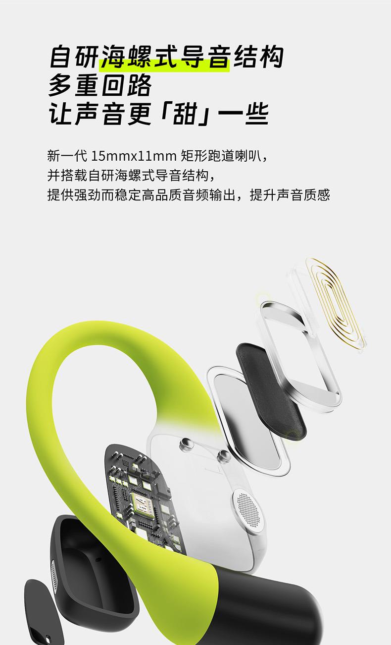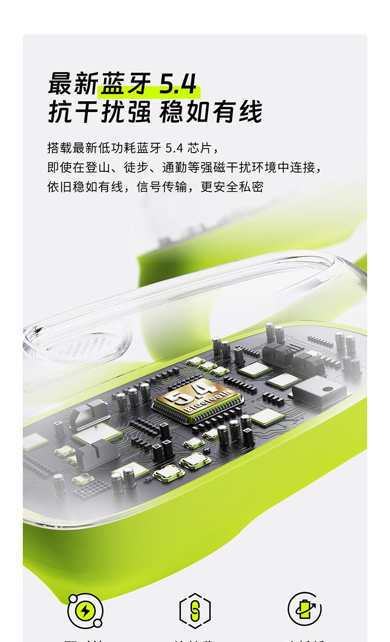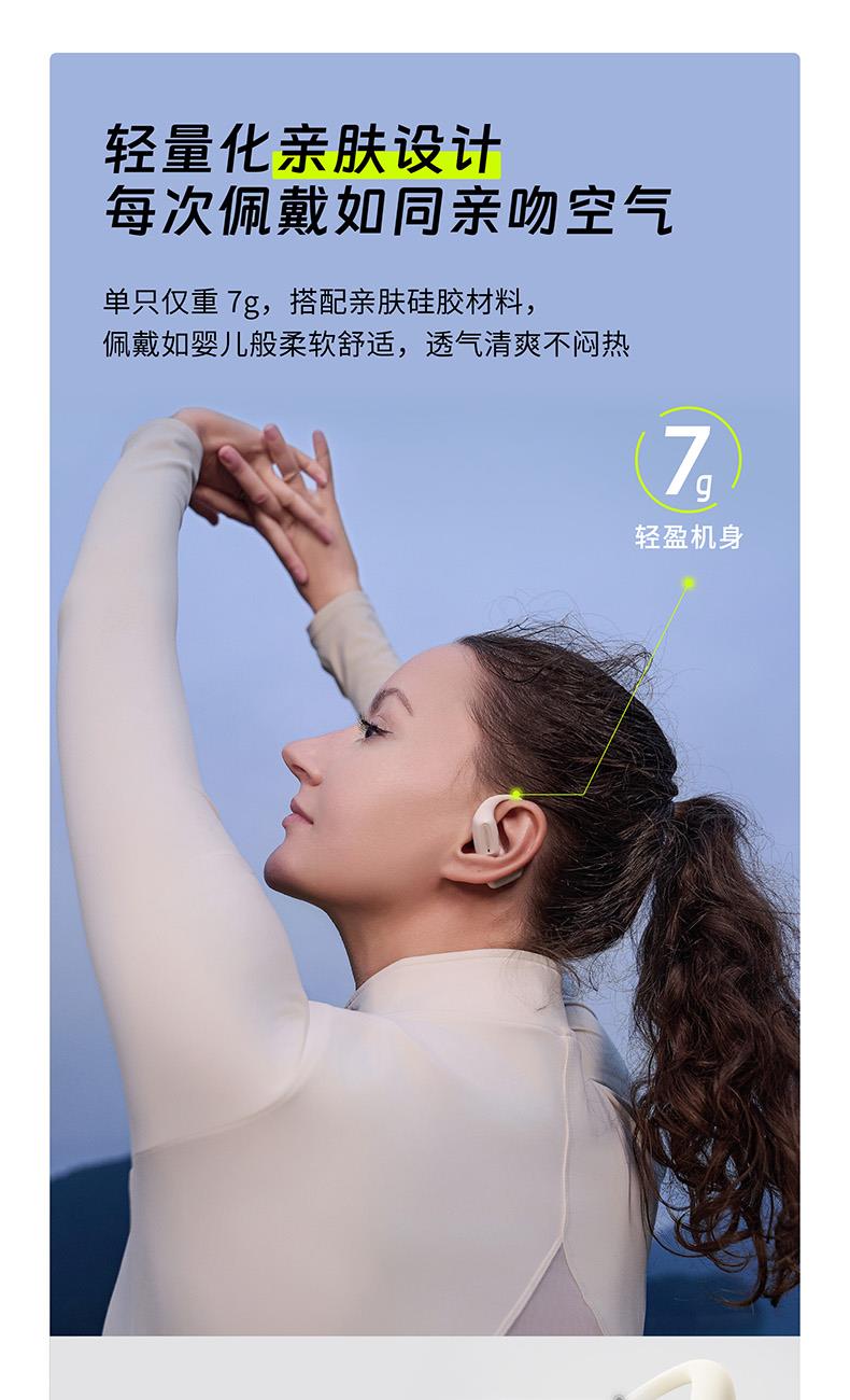 颜色:萤火绿/素雅黑/灵动白 电池容量:55mAh*2/400mAh 包装尺寸:125*200*60mm 外箱尺寸:650*320*435mm 续航时间:24小时 充电时间:2小时 蓝牙版本:V5.4 防水级别:IPX5可水洗 佩戴舒适度高,液态硅胶全天戴 7g超轻,比2张A4纸轻无压迫 仿生海螺结构,低音增强20% IPX5防水可水洗,运动无惧雨汗 AI智能降噪,迎风骑行通话清晰 开放聆听兼环境音,续航24h 2000+运动达人认可旗舰音质
