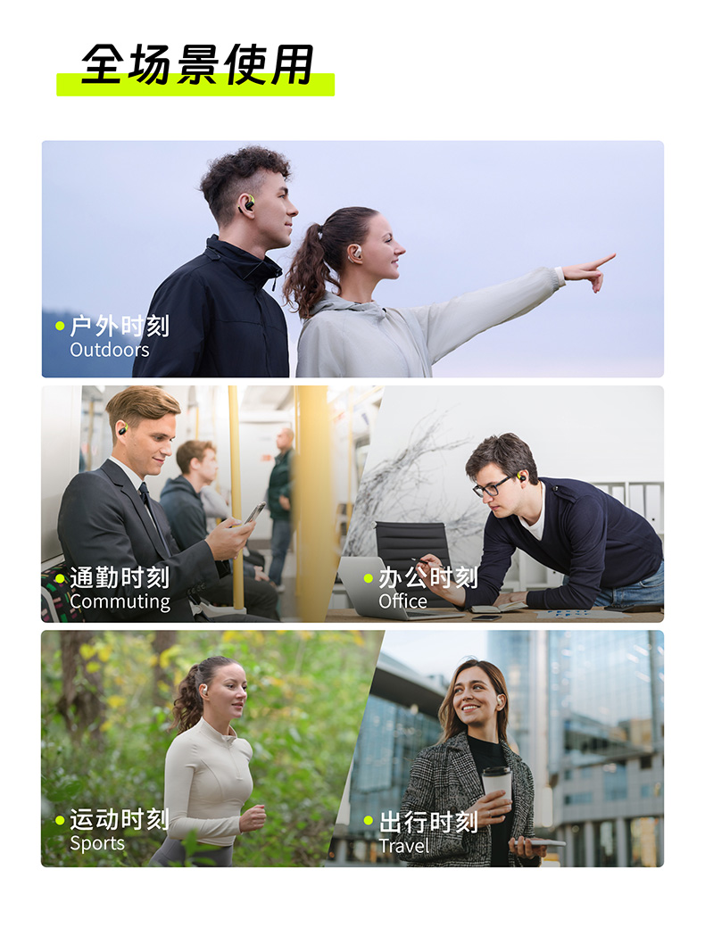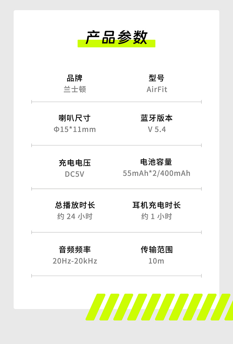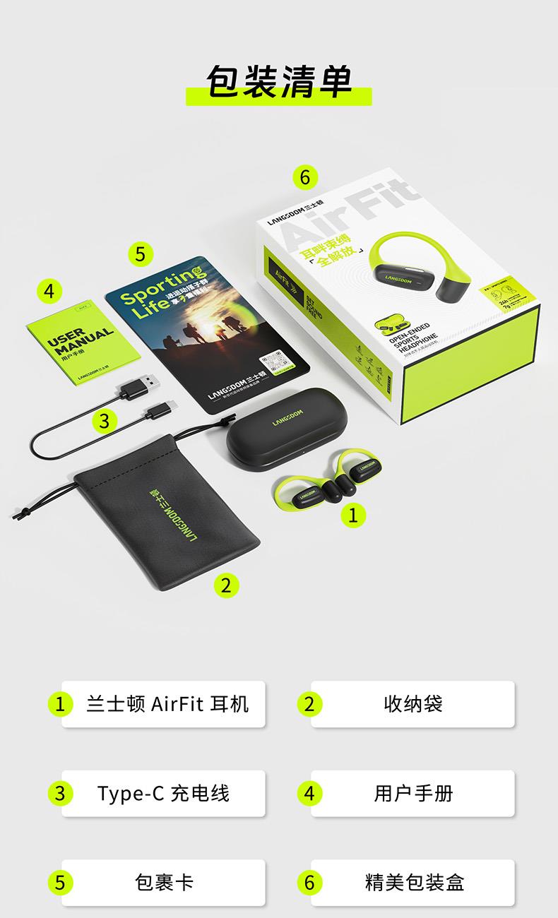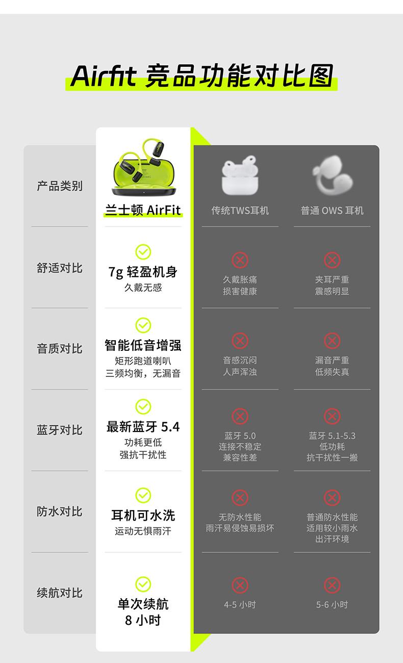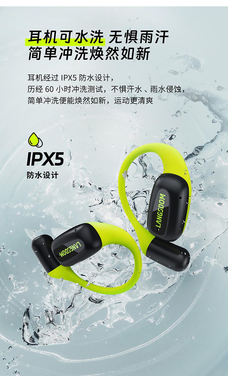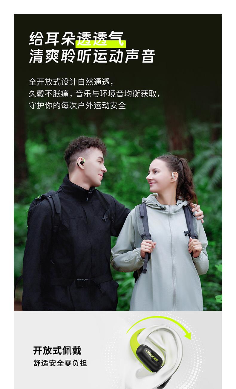 颜色:萤火绿/素雅黑/灵动白 电池容量:55mAh*2/400mAh 包装尺寸:125*200*60mm 外箱尺寸:650*320*435mm 续航时间:24小时 充电时间:2小时 蓝牙版本:V5.4 防水级别:IPX5可水洗 佩戴舒适度高,液态硅胶全天戴 7g超轻,比2张A4纸轻无压迫 仿生海螺结构,低音增强20% IPX5防水可水洗,运动无惧雨汗 AI智能降噪,迎风骑行通话清晰 开放聆听兼环境音,续航24h 2000+运动达人认可旗舰音质