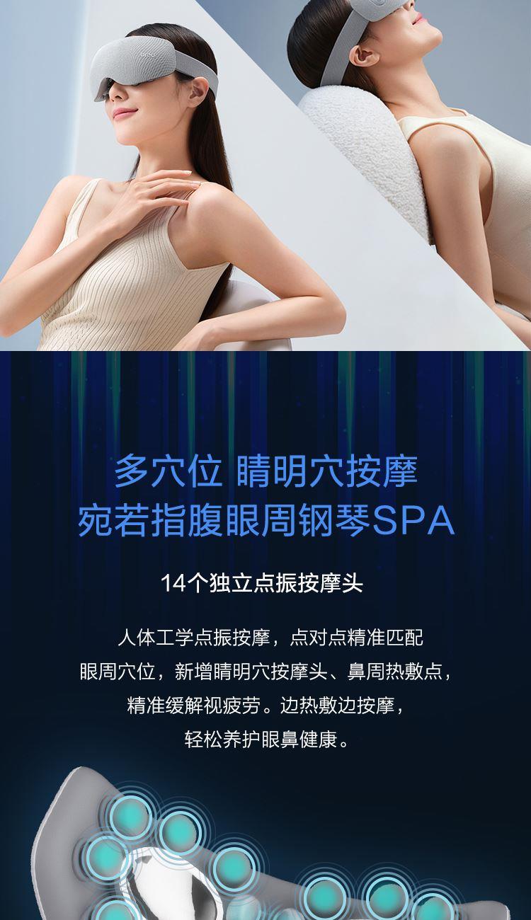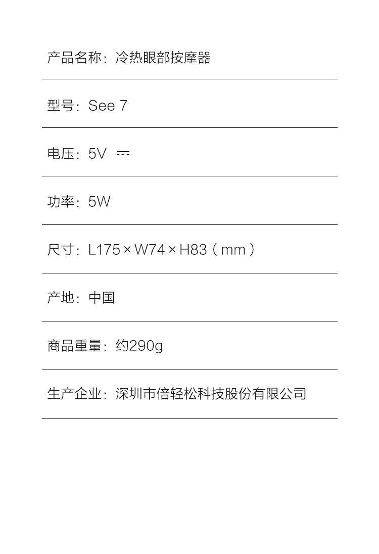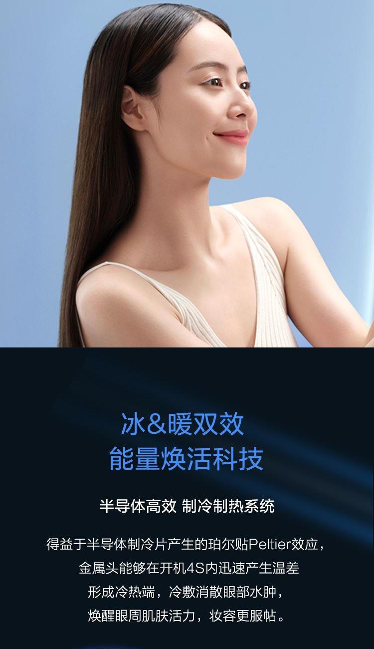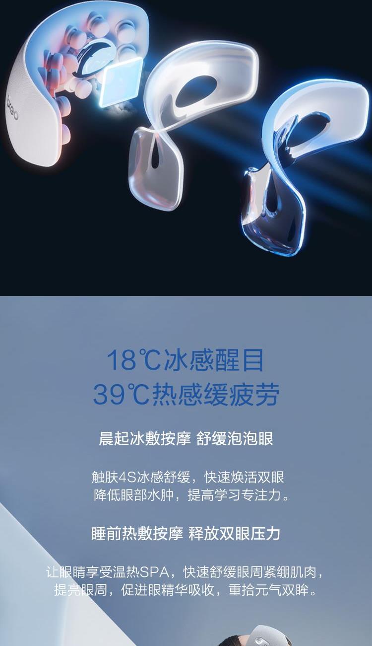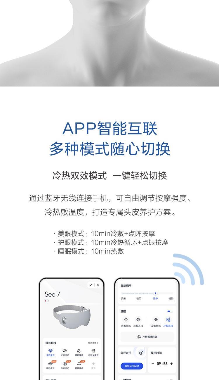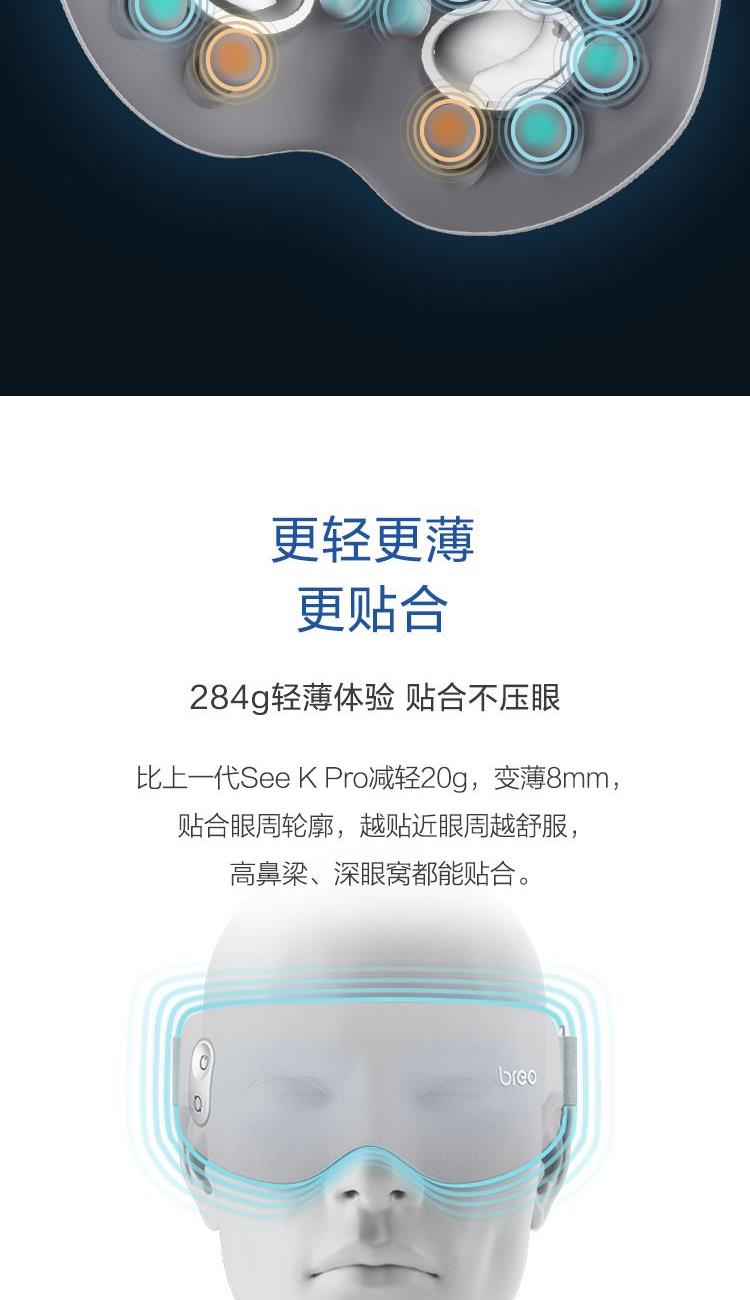 1冰2暖3按摩 焕亮双眼快上加快 冰暖双效 能量焕活科技,半导体制冷技术+NTC测温探头: 4S速冷起雾,18°C冰感醒眼:冰敷快速提亮眼周,淡泡泡眼,快人一步 4S速热暖眼,39°C热感淡纹:热敷快速促进眼精华吸收,淡纹淡黑眼圈 多点穴位按摩,睛明穴按摩,14个独立点振按摩头: 人体工学点对点匹配穴位,点振按摩,缓解眼疲劳 鼻周热敷+按摩:边热敷边按摩,养护眼鼻健康 APP智能操控,3+4多种模式:本地模式:美眼、护眼、睡眠 链接APP后:新增自定义模式 284g轻薄体验:比上一代See K Pro减轻20g,变薄8mm