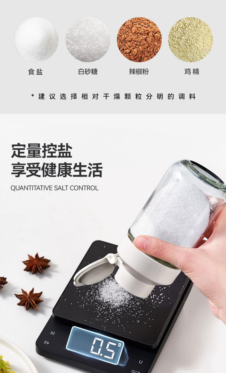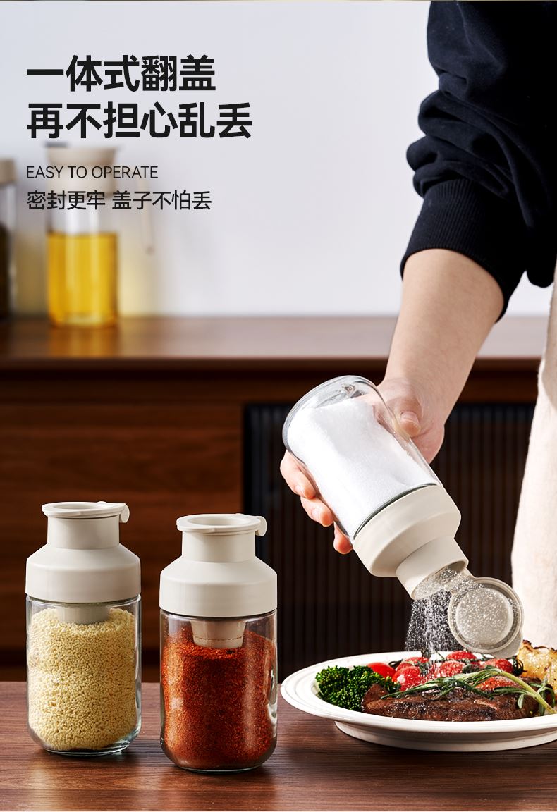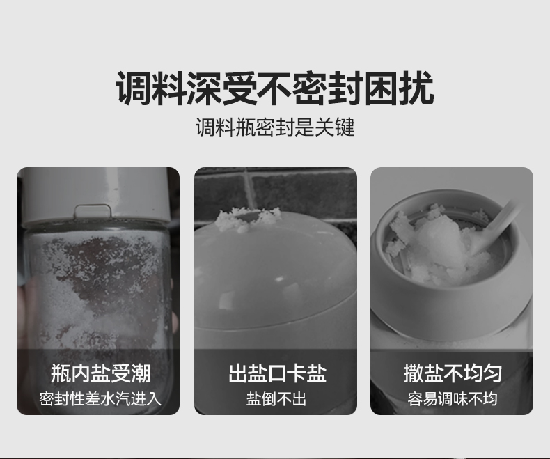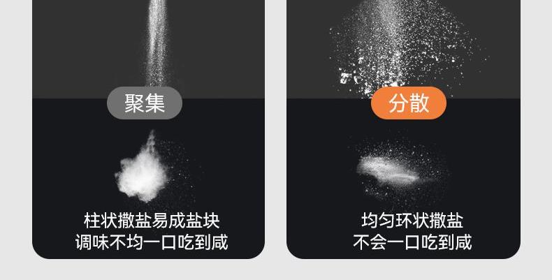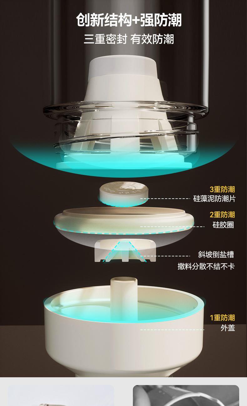 均匀定量撒盐,3重密封不结块 创新结构+强防潮,三重密封 有效防潮 直角导流仓撒盐更均匀,防潮升级内置干燥块 一体式翻盖再不担心乱丢,密封更牢 盖子不怕丢 不止装盐多调料可装,定量控盐享受健康生活
