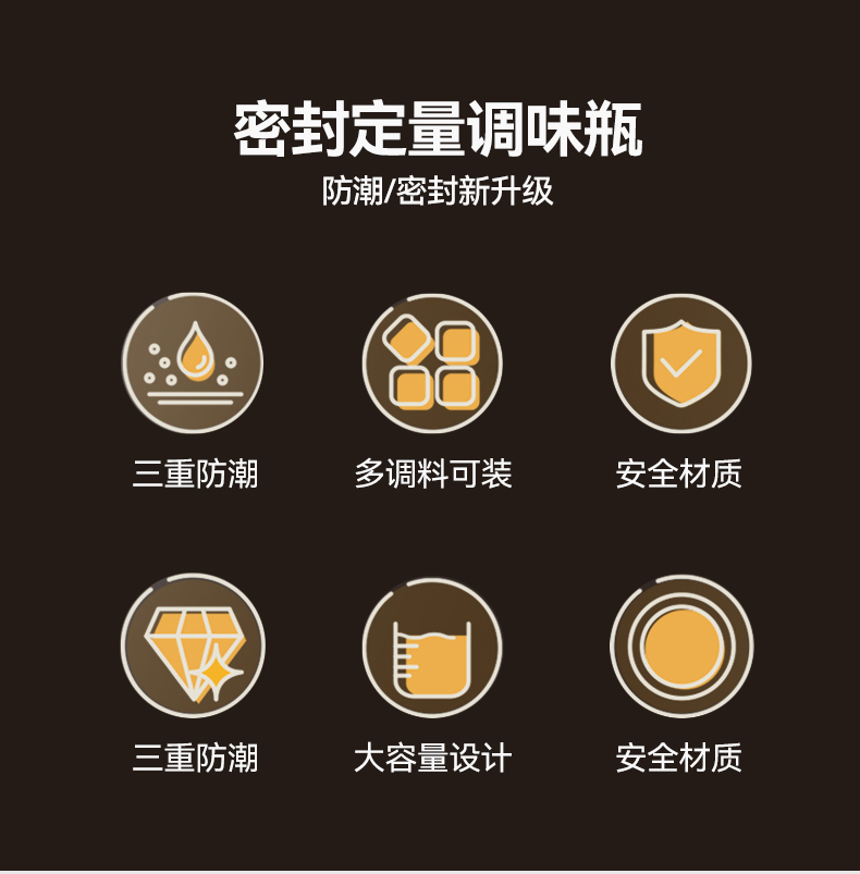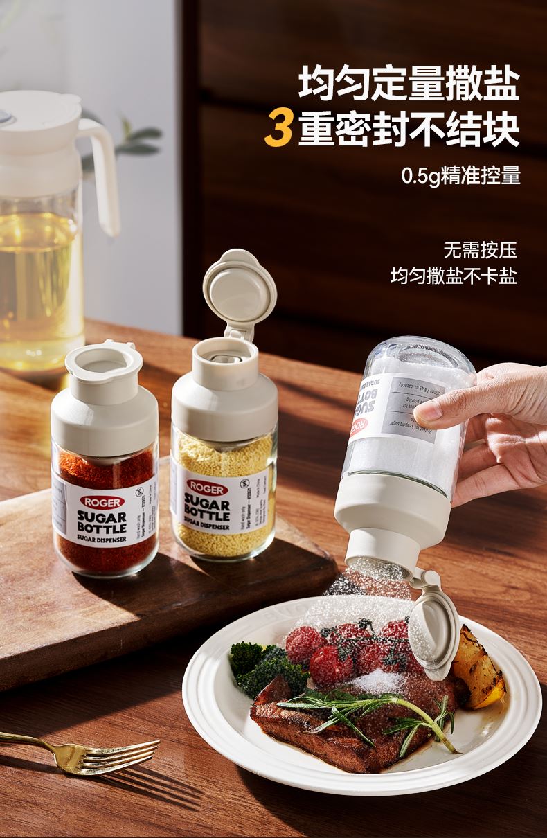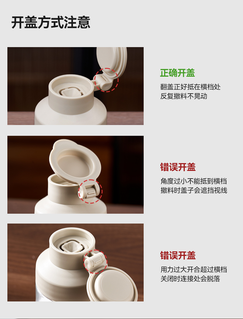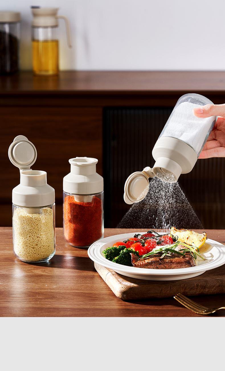 均匀定量撒盐,3重密封不结块 创新结构+强防潮,三重密封 有效防潮 直角导流仓撒盐更均匀,防潮升级内置干燥块 一体式翻盖再不担心乱丢,密封更牢 盖子不怕丢 不止装盐多调料可装,定量控盐享受健康生活
