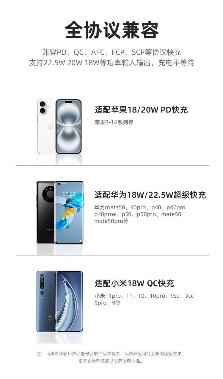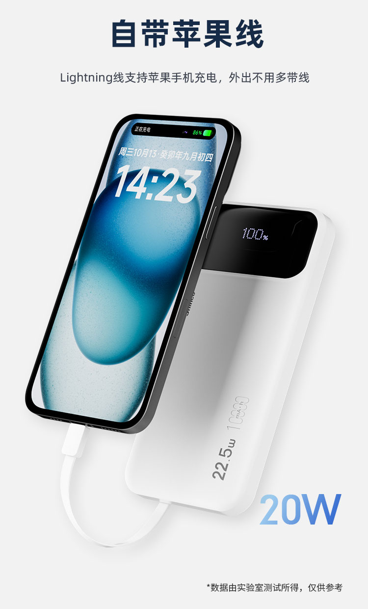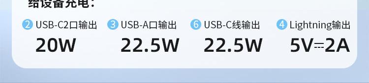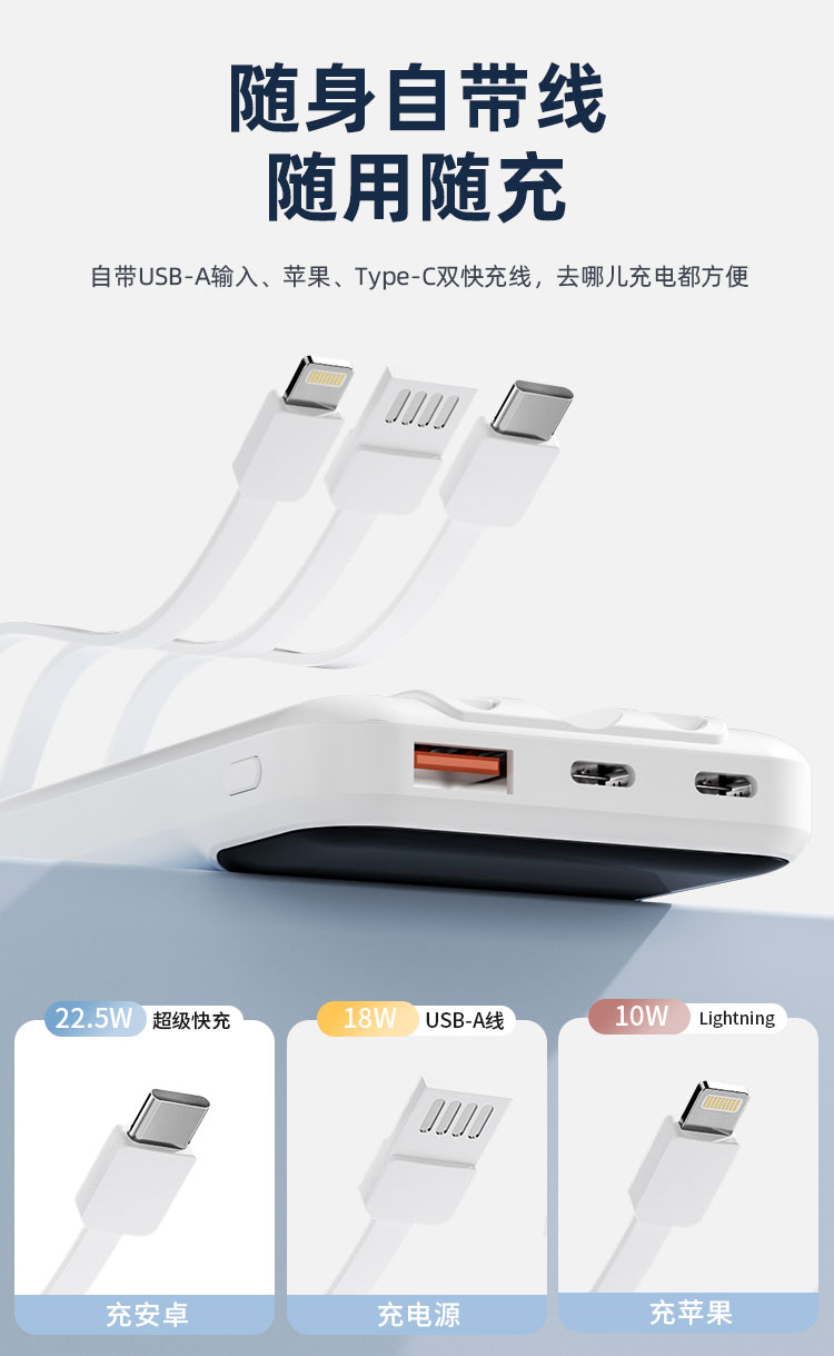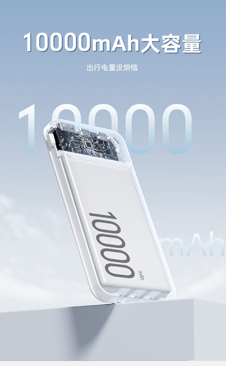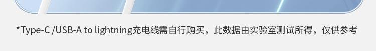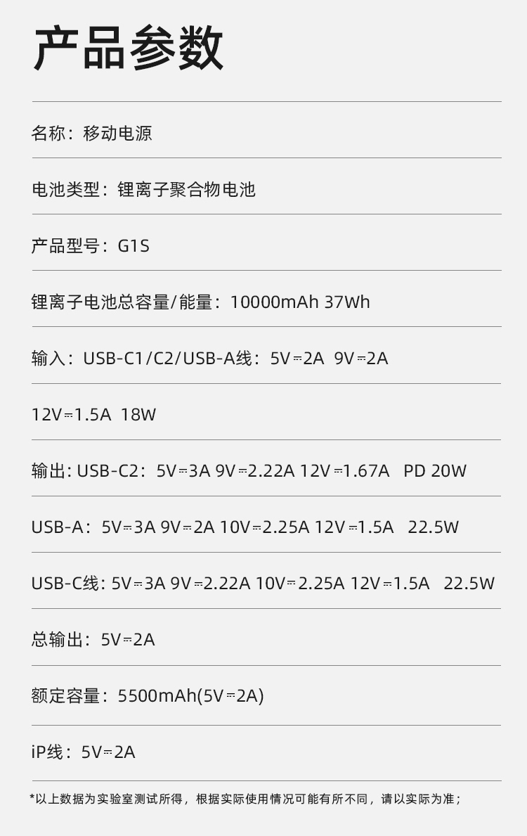 电池类型:锂离子聚合物电池 产品型号:G1S 锂离子电池总容量/能量:10000mAh 37Wh 输入:USB-C1/C2/USB-A线:5V⎓2A 9V⎓2A 12V⎓1.5A 18W 输出: USB-C2:5V⎓3A 9V⎓2.22A 12V⎓1.67A PD 20W USB-A:5V⎓3A 9V⎓2A 10V⎓2.25A 12V⎓1.5A 22.5W USB-C线: 5V⎓3A 9V⎓2.22A 10V⎓2.25A 12V⎓1.5A 22.5W 总输出:5V⎓2A 额定容量:5500mAh(5V⎓2A) iP线:5V⎓2A 1:四台设备、共享充电、Type-C线+lightning线+USB-A输出口+Type-C输出口,可同时为4台设备输出充电,充电不等待 2:自带三线、真快充、兼容苹果和华为手机新机型快充协议,PD20W+华为22.5W,续航 3:大容量 10000mAh、出行电量没烦恼 4:支持iphone8-16系列手机快充、Type-C口支持PD 20W输出,搭配PD快充线,电量0-1%开始,半小时充满约50%、苹果手机快速充电 5:USB-A口22.5W输出、支持华为系列手机超级快充、USB-A口支持22.5W输出,华为手机电量0-1%开始,前半小时充满约50%