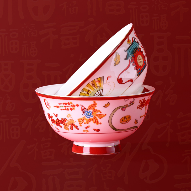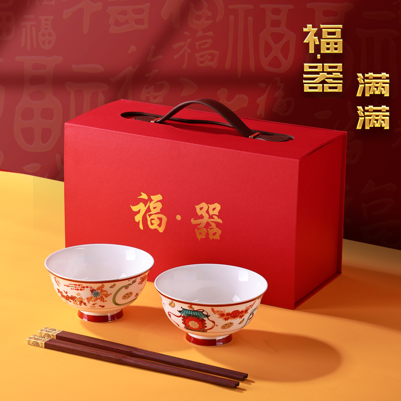 产品规格:福字红檀木筷2双,4.5英寸骨瓷碗2个。 产品材质:骨质瓷+原木木筷 产品花色:迎春闹福 包装方式:礼盒 单套重量:0.9KG 彩盒尺寸: 302*135*175mm